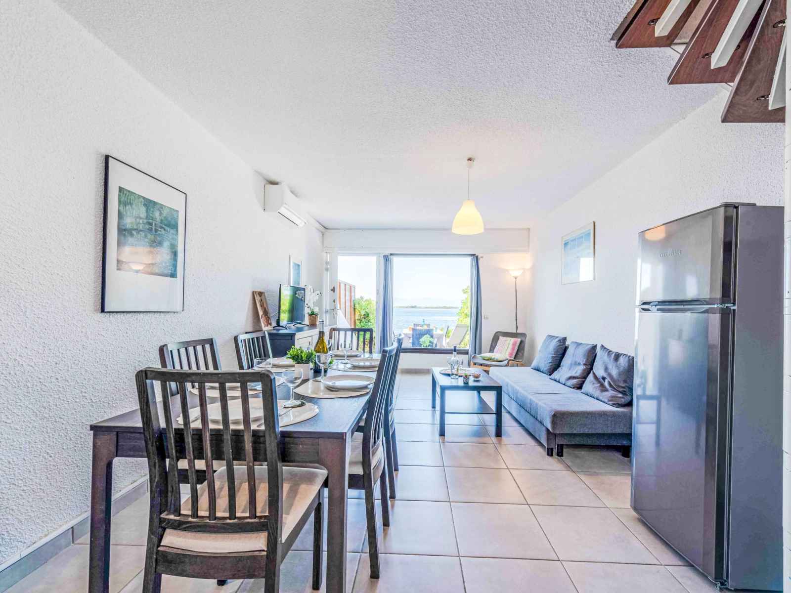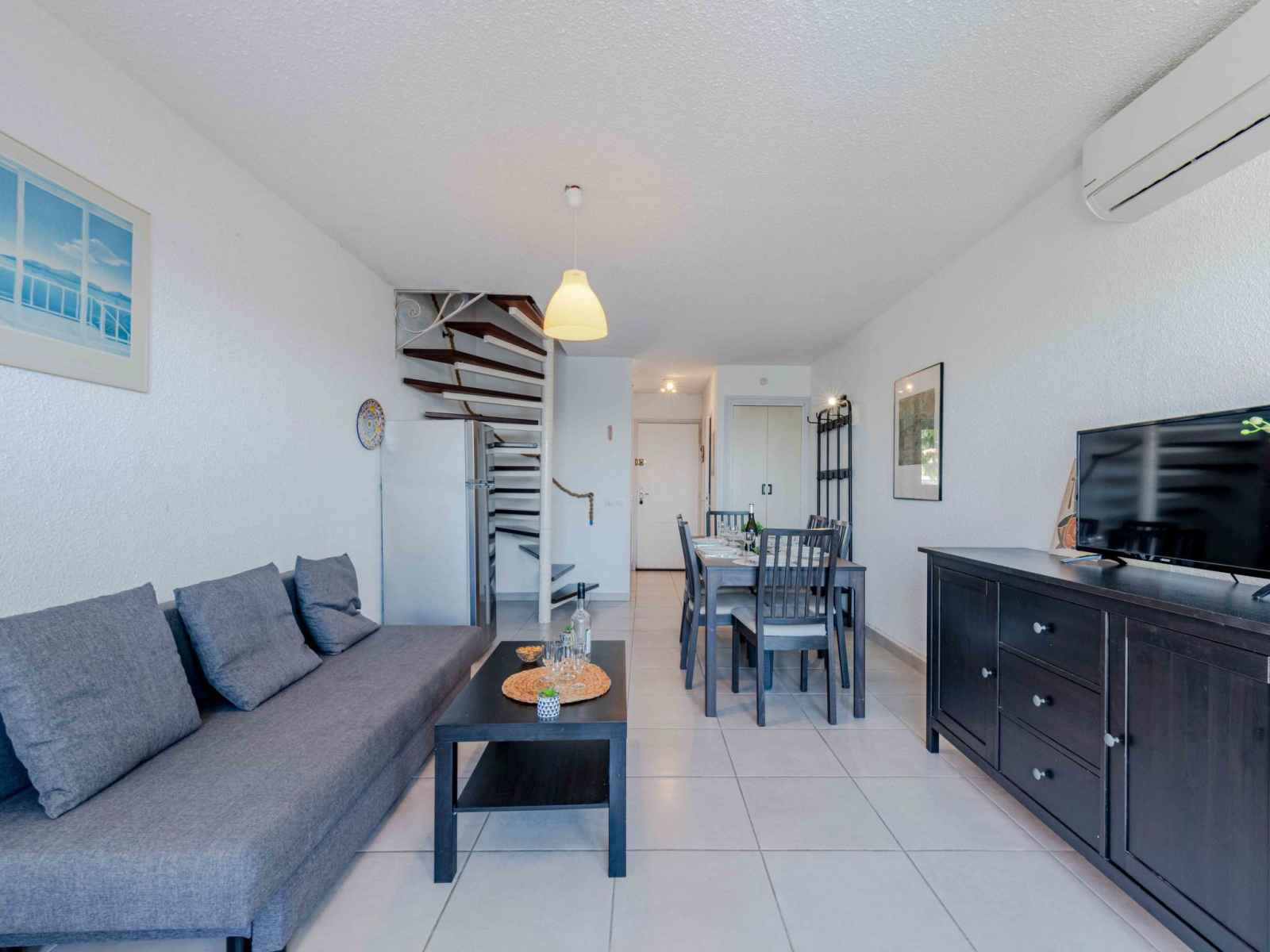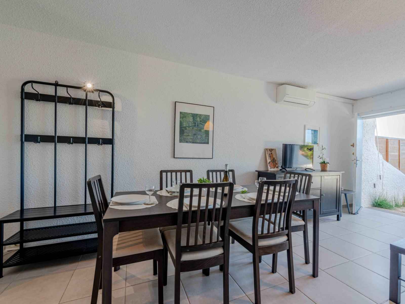 Maison mitoyenne 4 pièces 60 m2 sur 2 niveaux, au rez-de-chaussée, situation sud. séjour/salle à manger avec tv (écran plat). sortie sur la terrasse. coin cuisine (4 plaques de cuisson, four, lave-vaisselle, grille-pain, bouilloire électrique, micro-ondes, congélateur, cafetière électrique). wc séparé. air-conditionné. À l'étage