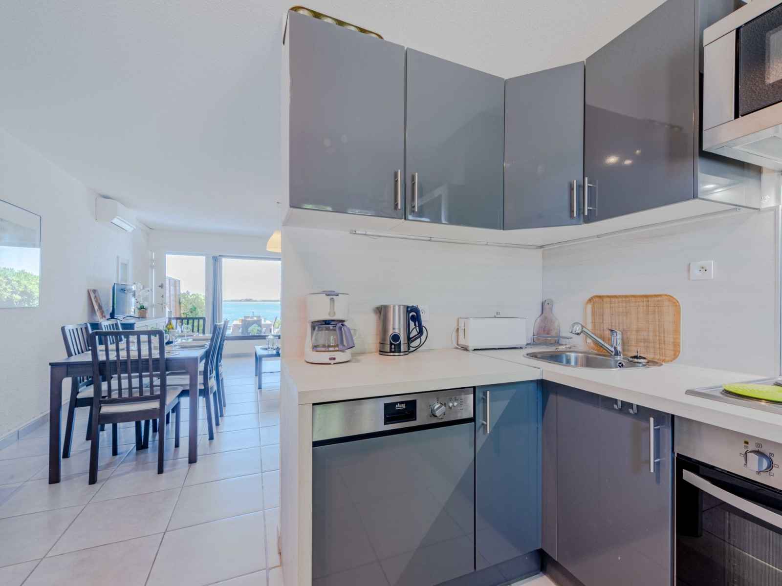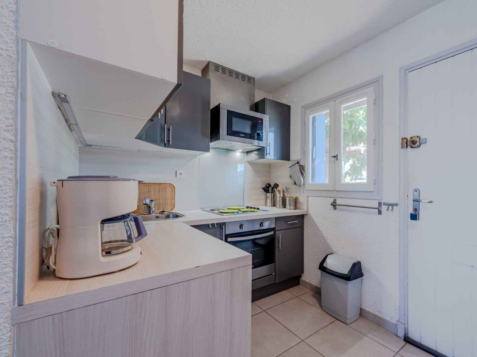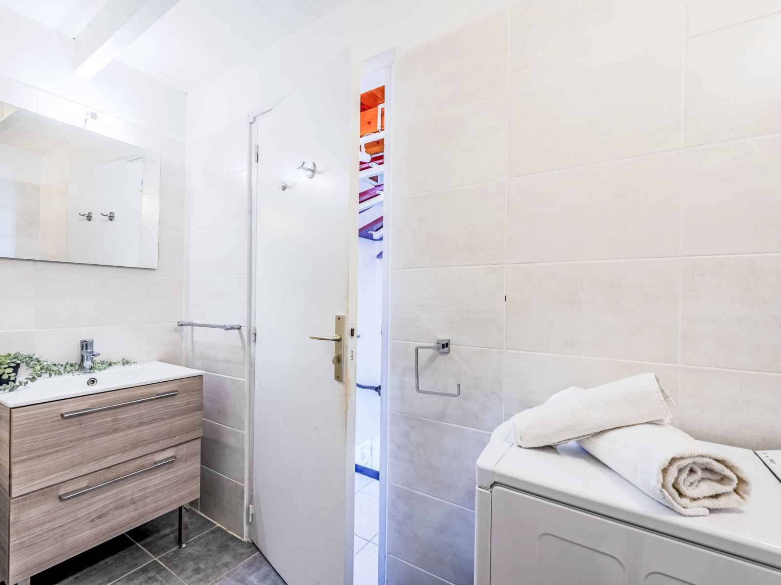 Maison mitoyenne 4 pièces 60 m2 sur 2 niveaux, au rez-de-chaussée, situation sud. séjour/salle à manger avec tv (écran plat). sortie sur la terrasse. coin cuisine (4 plaques de cuisson, four, lave-vaisselle, grille-pain, bouilloire électrique, micro-ondes, congélateur, cafetière électrique). wc séparé. air-conditionné. À l'étage
