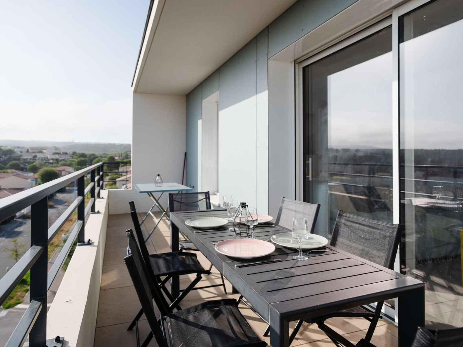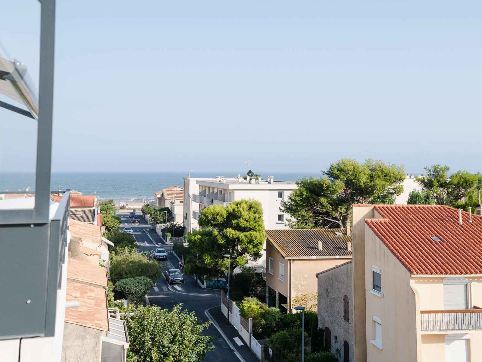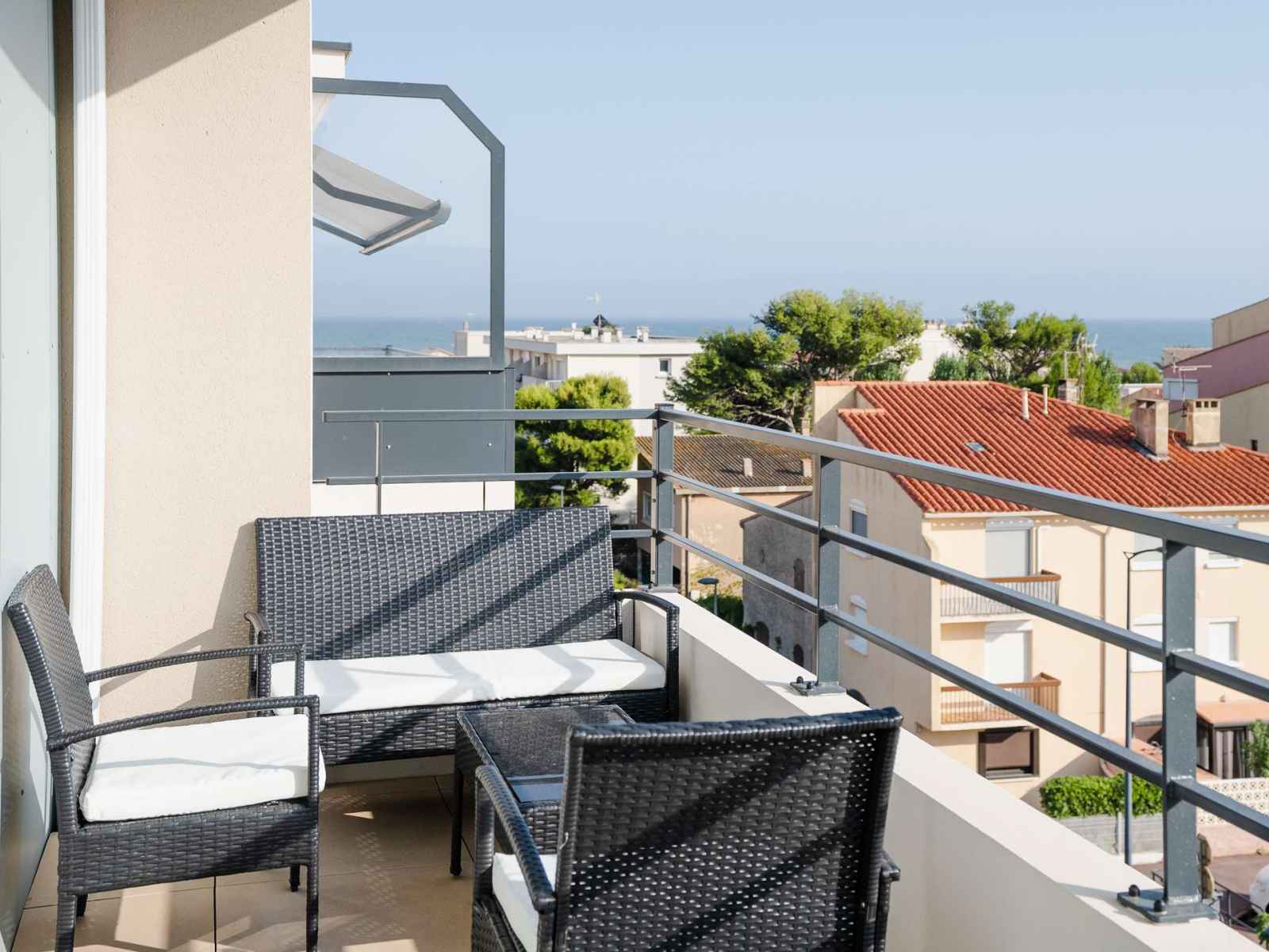 4ème et dernier étage de la résidence avec ascenseur l'appartement dispose d'une vaste pièce de vie donnant sur le balcon, avec cuisine entièrement équipée (ilôt central avec rangements, plaque de cuisson 3 feux induction et hotte aspirante, four, micro-ondes, réfrigérateur avec compartiment congélateur, lave-vaisselle, cafetière à dosettes Nespresso, grille-pain), une grande table en bois avec un buffet, et un espace salon TV (chaines françaises) avec un confortable canapé d'angle. Le balcon avec vue mer et vue sur le Massif de la Clape est équipé d'une table étroite avec ses chaises, un banc, 2 fauteuils et 2 chiliennes.