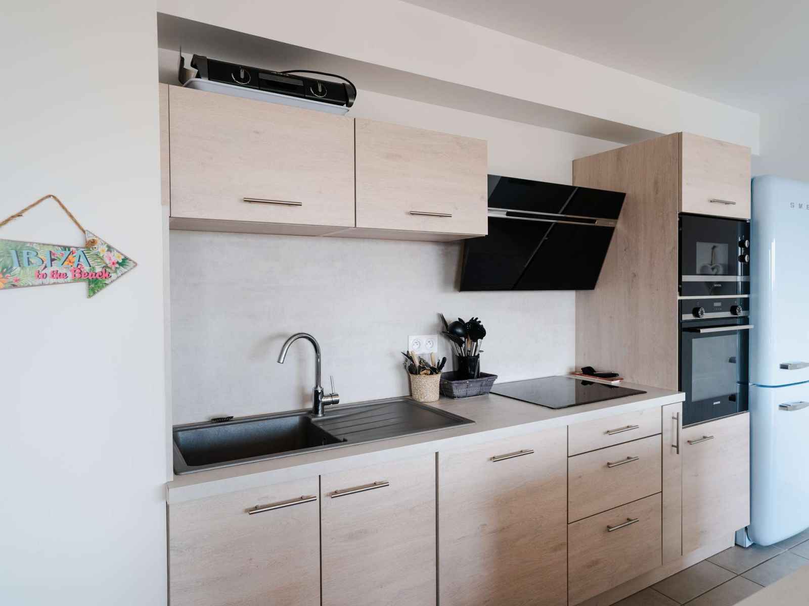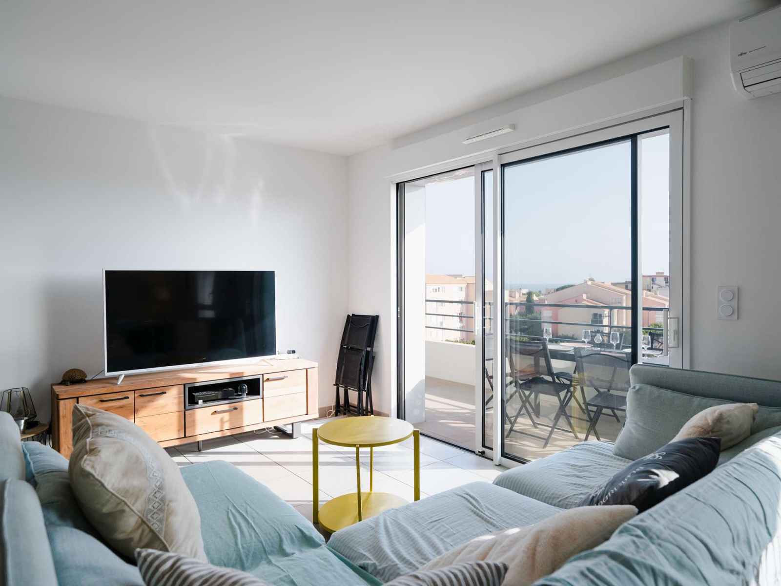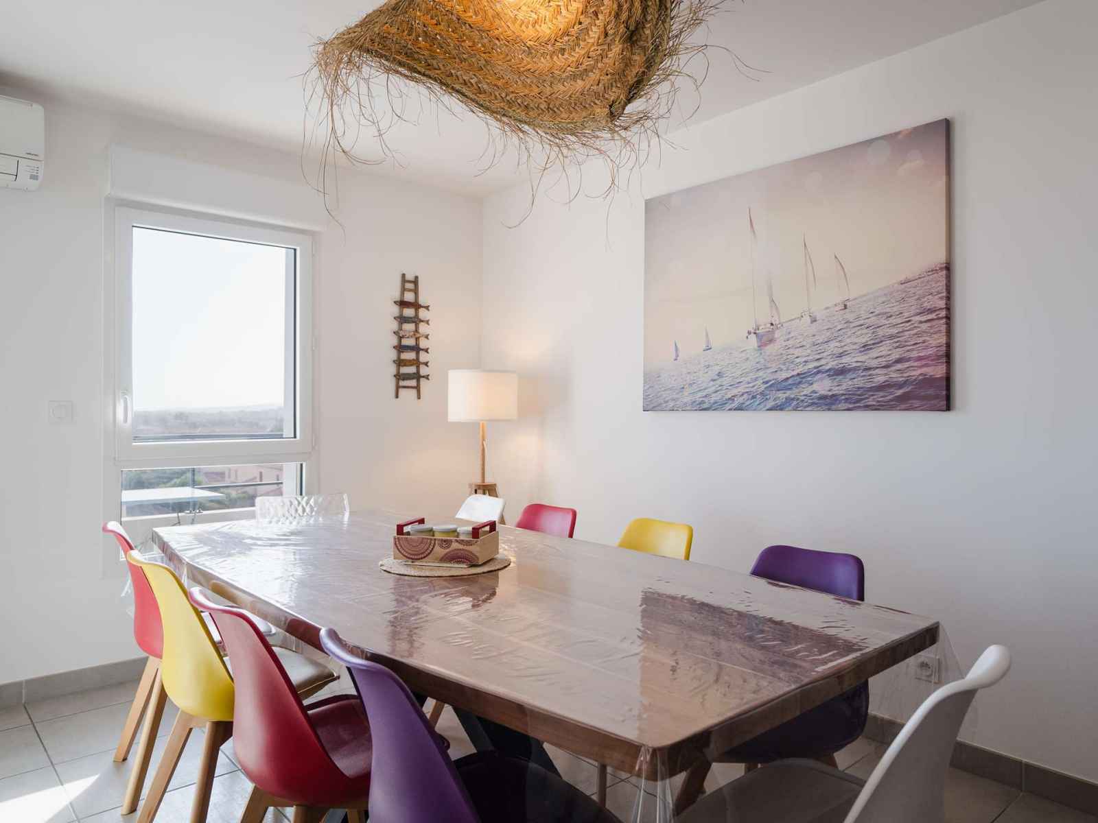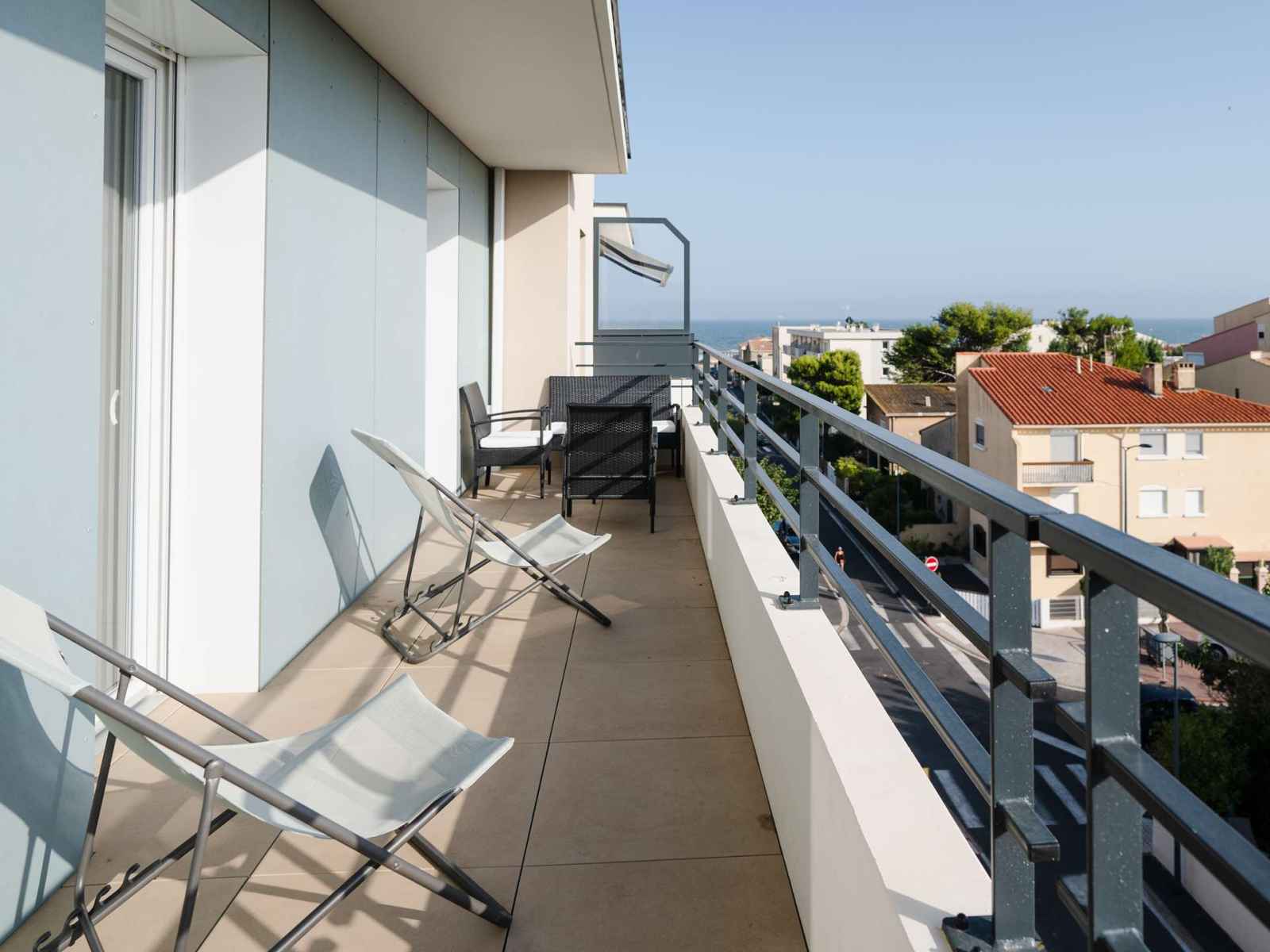 4ème et dernier étage de la résidence avec ascenseur l'appartement dispose d'une vaste pièce de vie donnant sur le balcon, avec cuisine entièrement équipée (ilôt central avec rangements, plaque de cuisson 3 feux induction et hotte aspirante, four, micro-ondes, réfrigérateur avec compartiment congélateur, lave-vaisselle, cafetière à dosettes Nespresso, grille-pain), une grande table en bois avec un buffet, et un espace salon TV (chaines françaises) avec un confortable canapé d'angle. Le balcon avec vue mer et vue sur le Massif de la Clape est équipé d'une table étroite avec ses chaises, un banc, 2 fauteuils et 2 chiliennes.