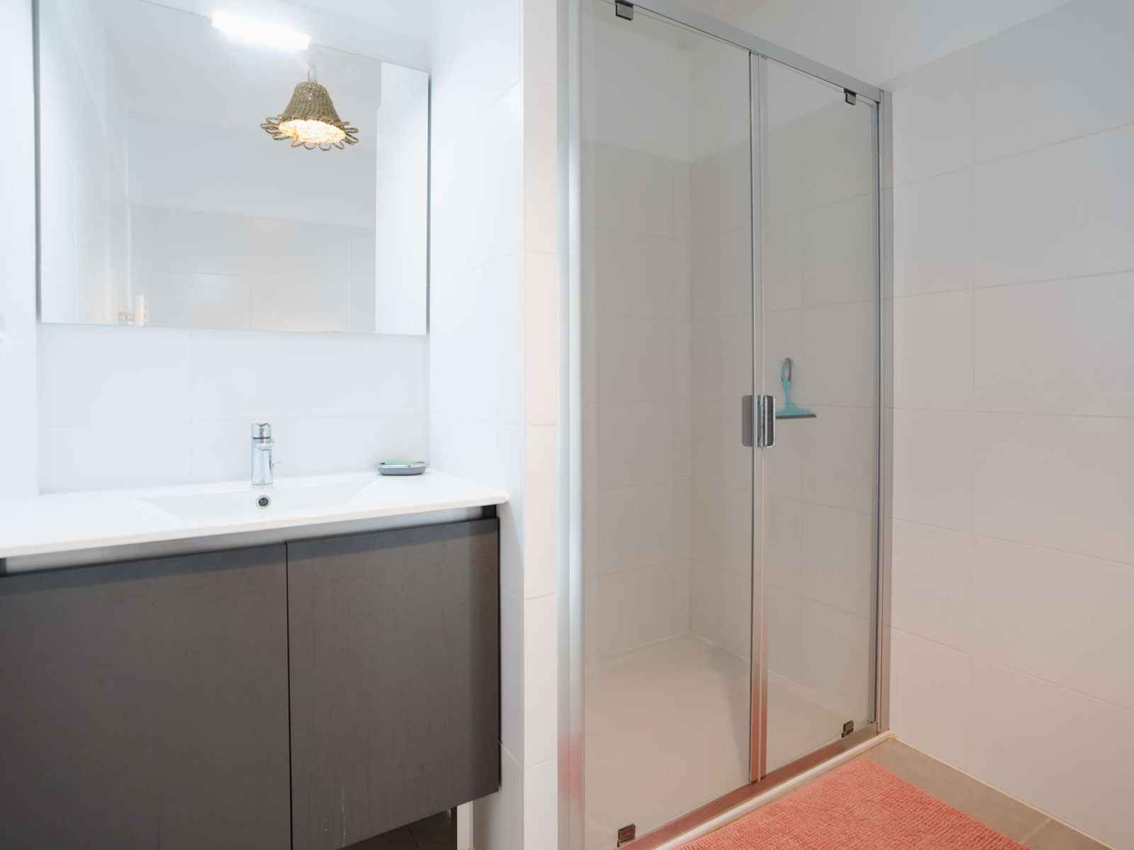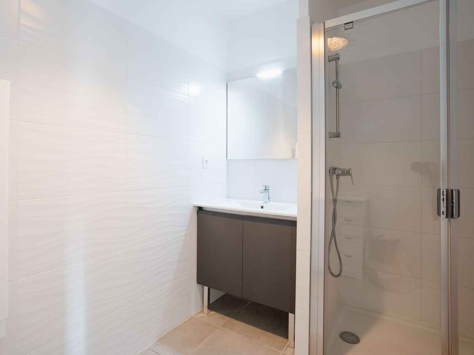 La salle d'eau dispose d'une vasque avec rangement et d'une douche à l'italienne.