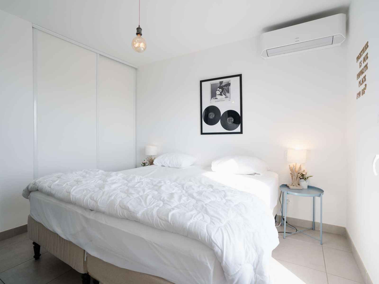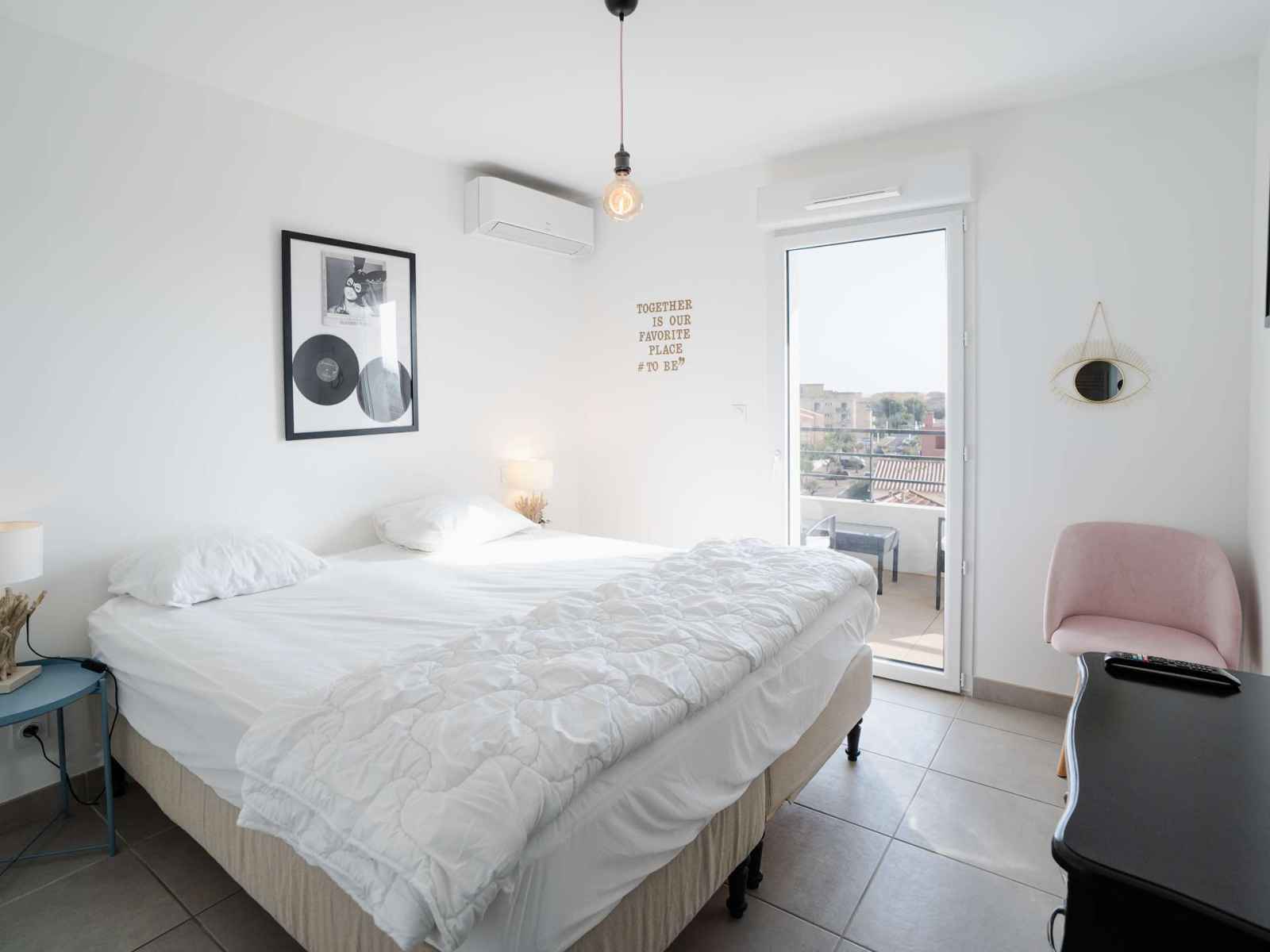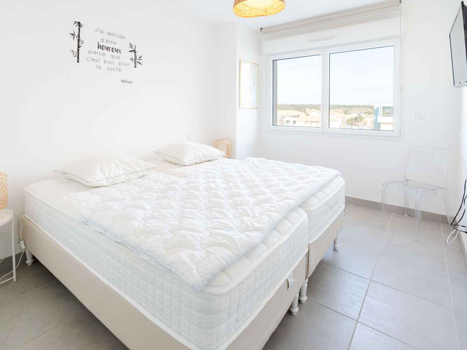Le couloir dessert une première chambre climatisée avec TV (chaines françaises), vaste placard et lits superposés (160x190), avec accès au balcon; puis une deuxième chambre climatisée avec TV (chaines françaises), placard et lit double (2x90x200), et accès au balcon.