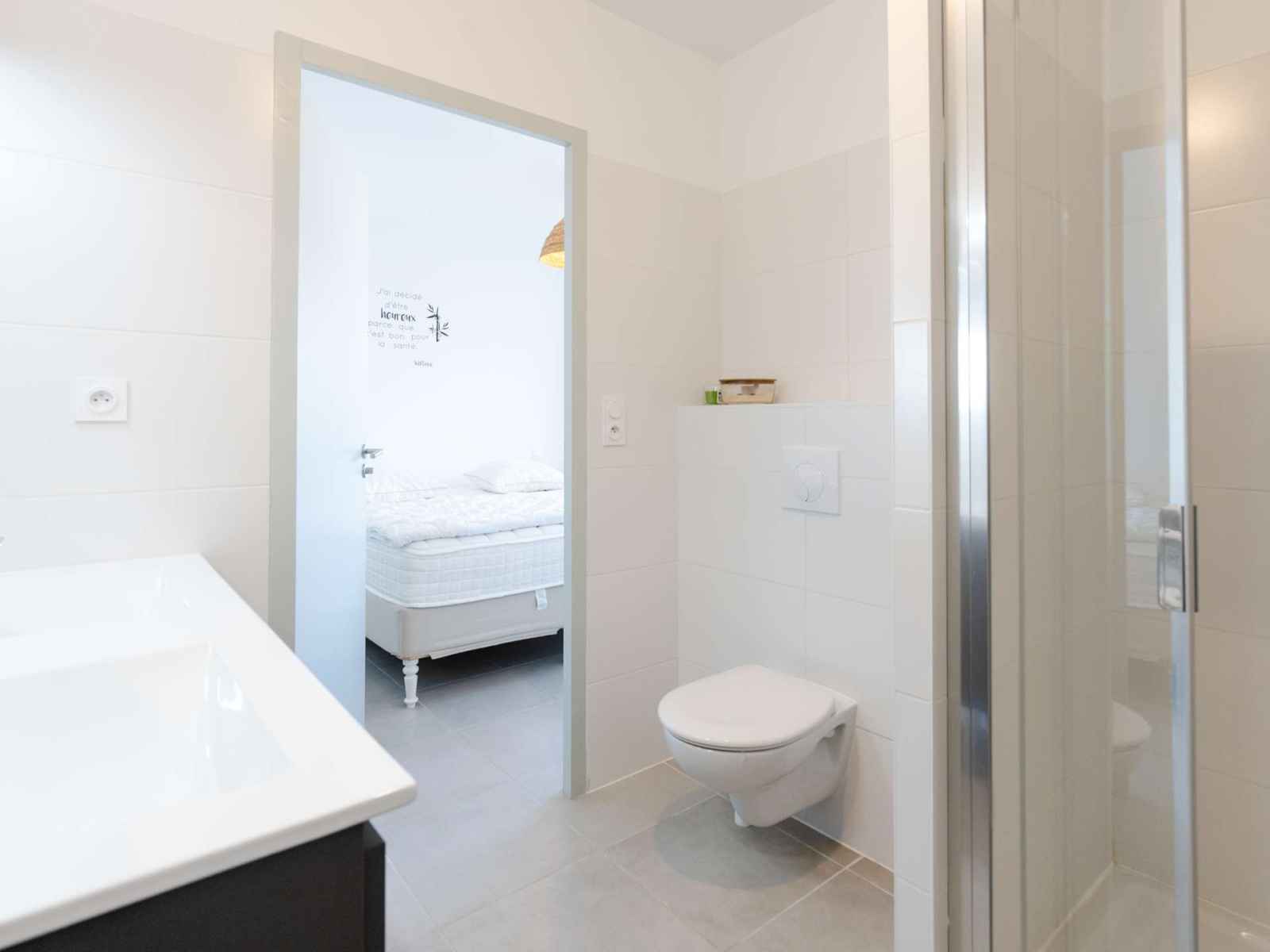 Les WC sont séparés, et un espace buanderie avec lave-linge et sèche-linge est situé à côté de l'entrée.