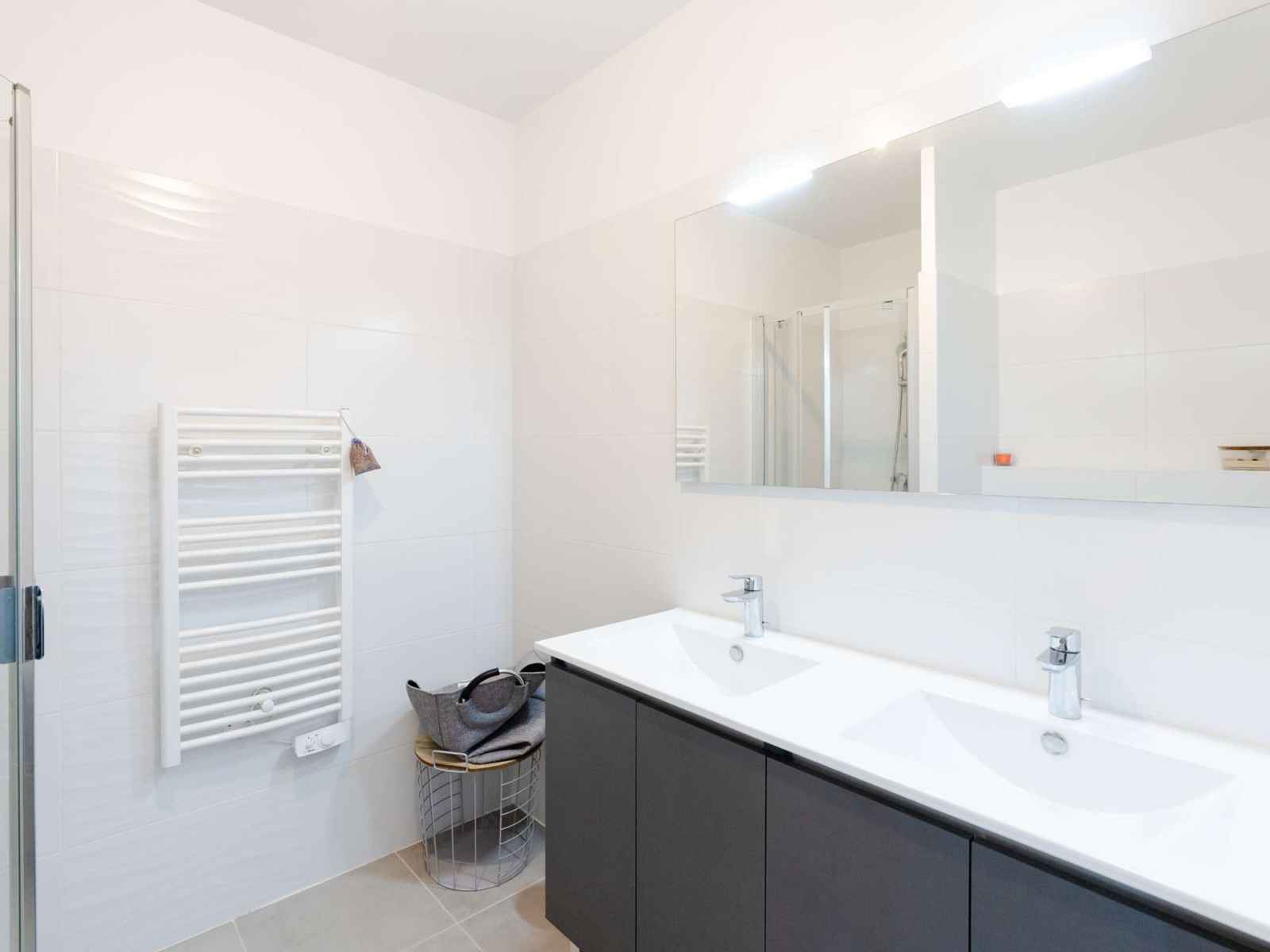 Une 3ème chambre de type suite parentale avec lit double (2x90x200) et accès à une salle d'eau (douche à l'italienne, double vasque et WC) complète le logement.