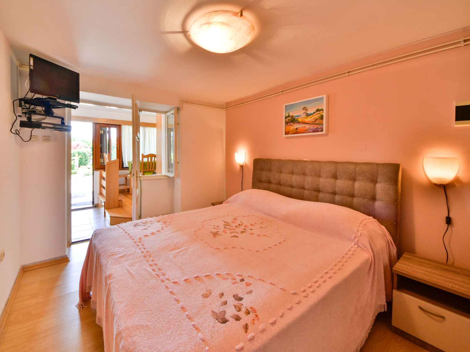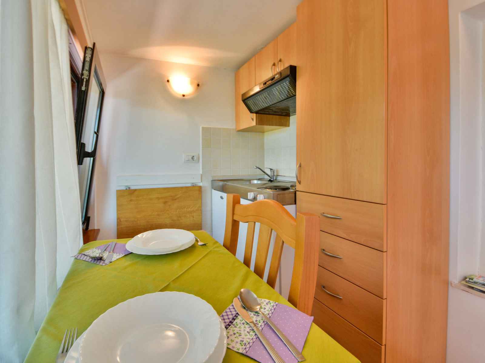 (satellite) (écran plat). 1 chambre avec 1 grand-lit (160 cm, longueur 200 cm), TV (satellite). Salle à manger. Cuisine ouverte (4 plaques de cuisson, four, cafetière électrique). Douche/WC, douche/bidet/WC. Pas de chauffage. 3 terrasses 12 m2, couverte terrasse 45 m2, couverte. Meubles de terrasse, chaises longues. Vue sur la piscine. A disposition: lave-linge. Internet (Connexion WIFI, gratuit). Maximum 1 animal/ chien autorisé. La maison est composée de 3 appartements différents loués sous forme d’une seule unité. Chaque appartement possède sa propre entrée. Le premier est composé d'un salon/salle à manger avec cuisine ouverte et d'une chambre. Le deuxième d'une salle à manger avec cuisine ouverte et d'une chambre. Le troisième, d'une chambre et d'une salle à manger avec cuisine ouverte.
