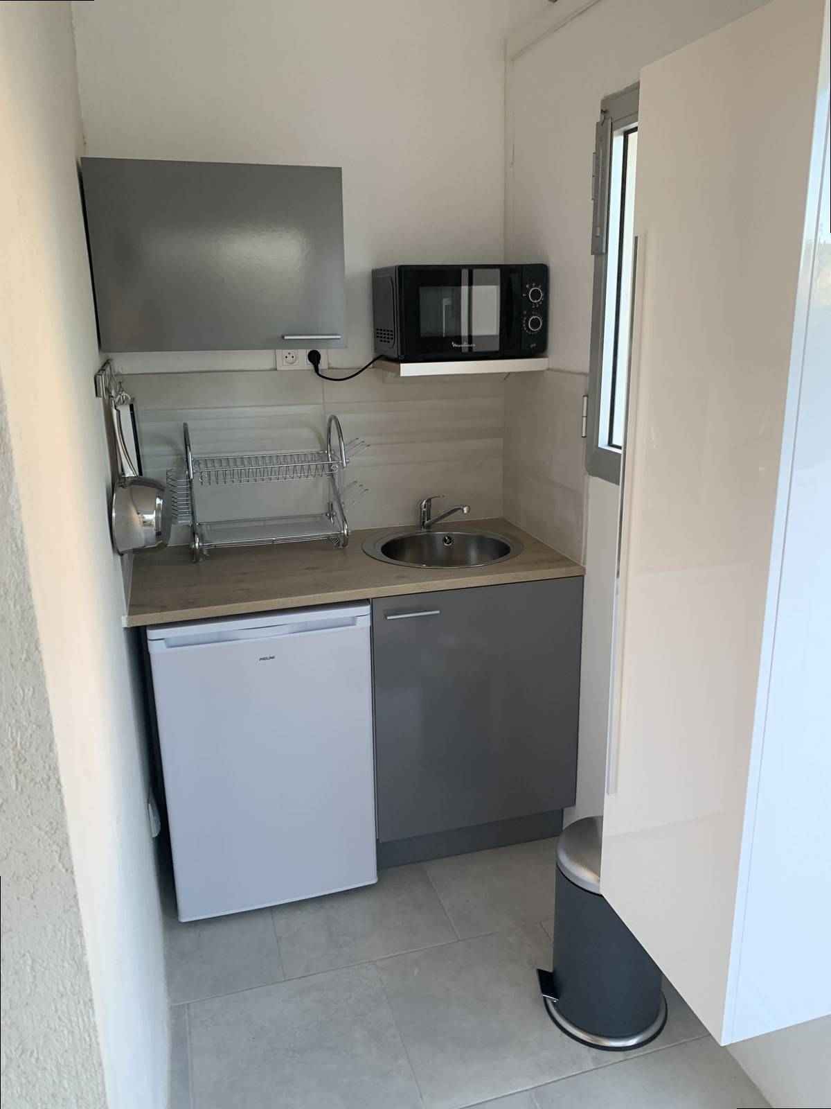 Une kitchenette avec réfrigérateur et micro-ondes