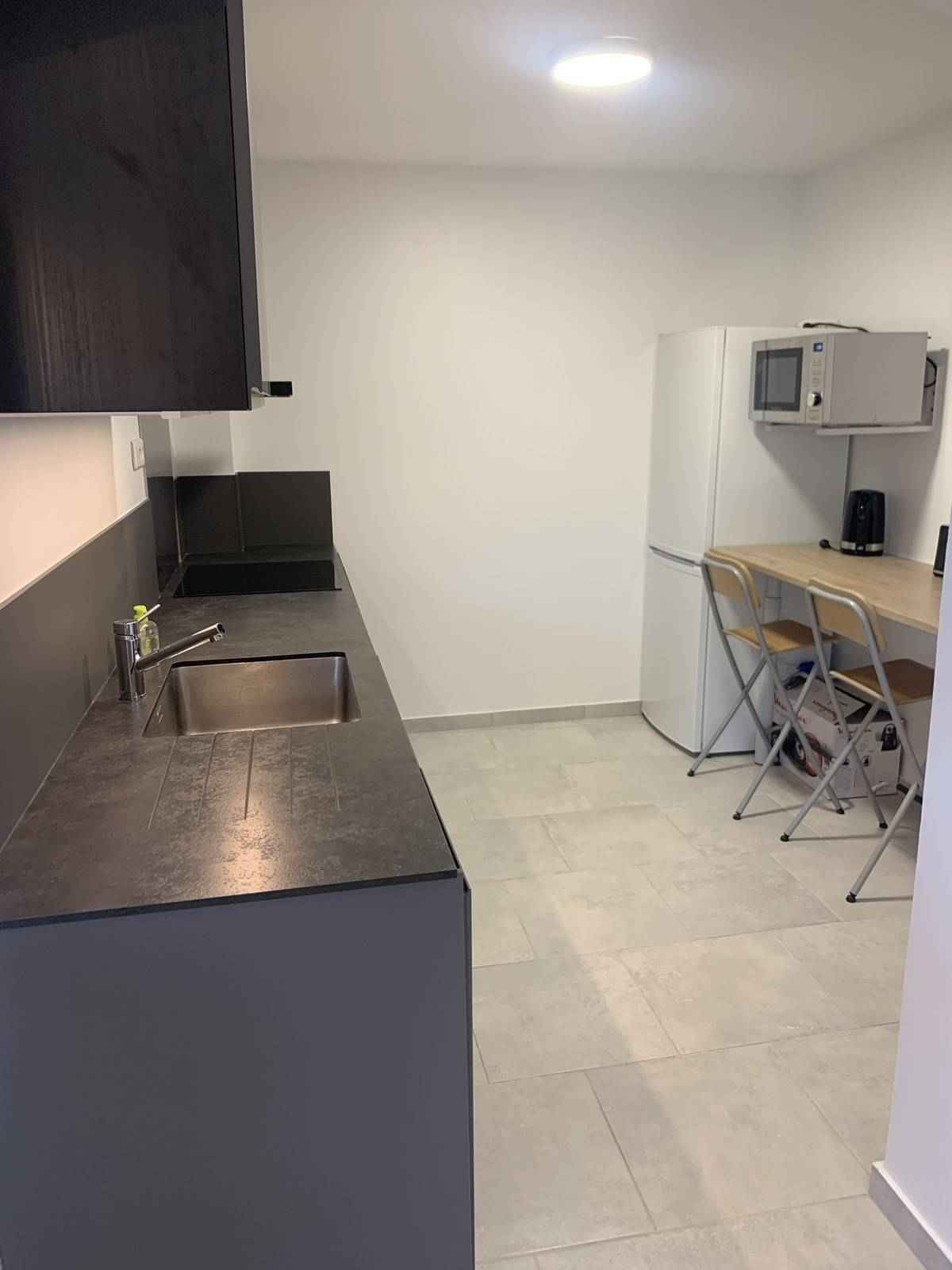 Une cuisine équipée avec réfrigérateur, micro-ondes, plaque de cuisson