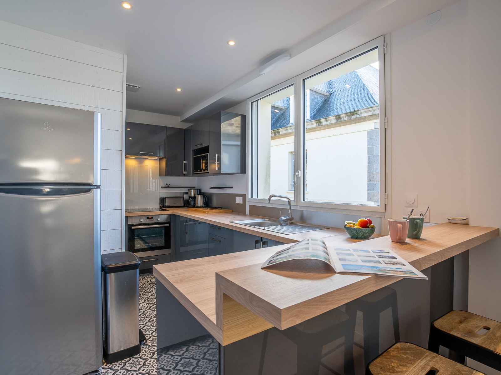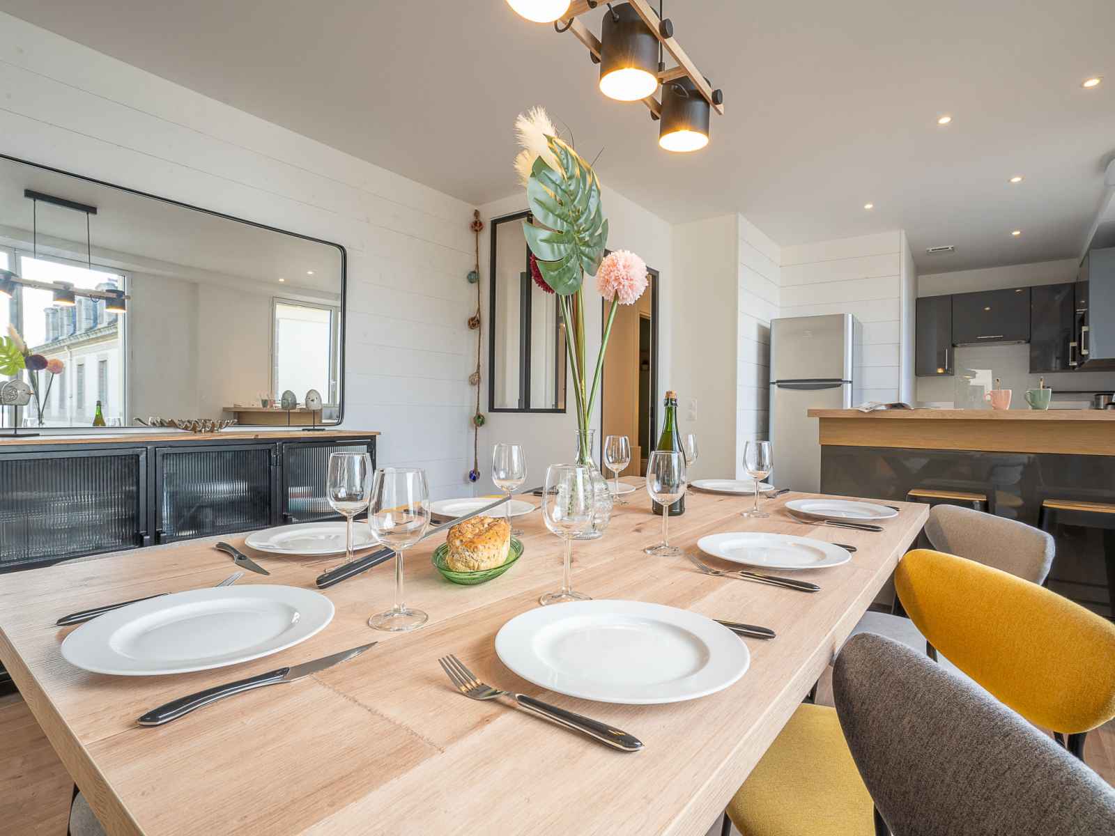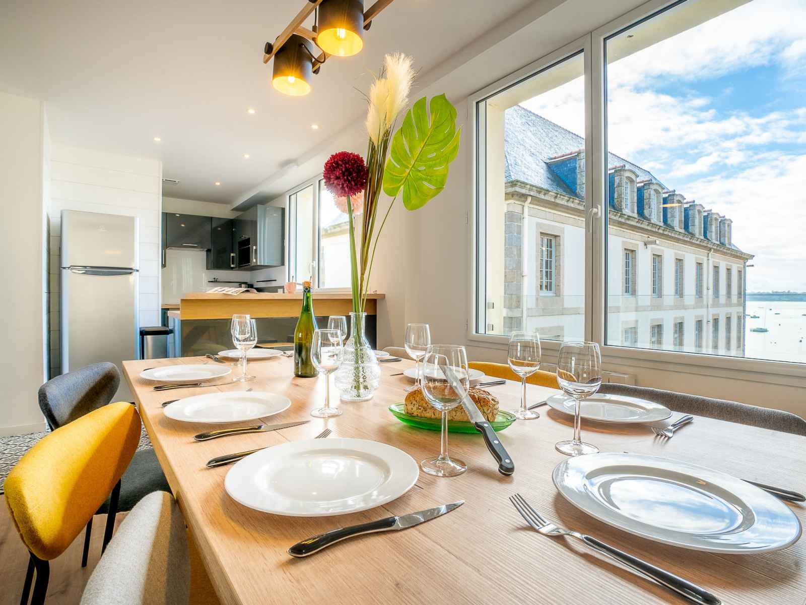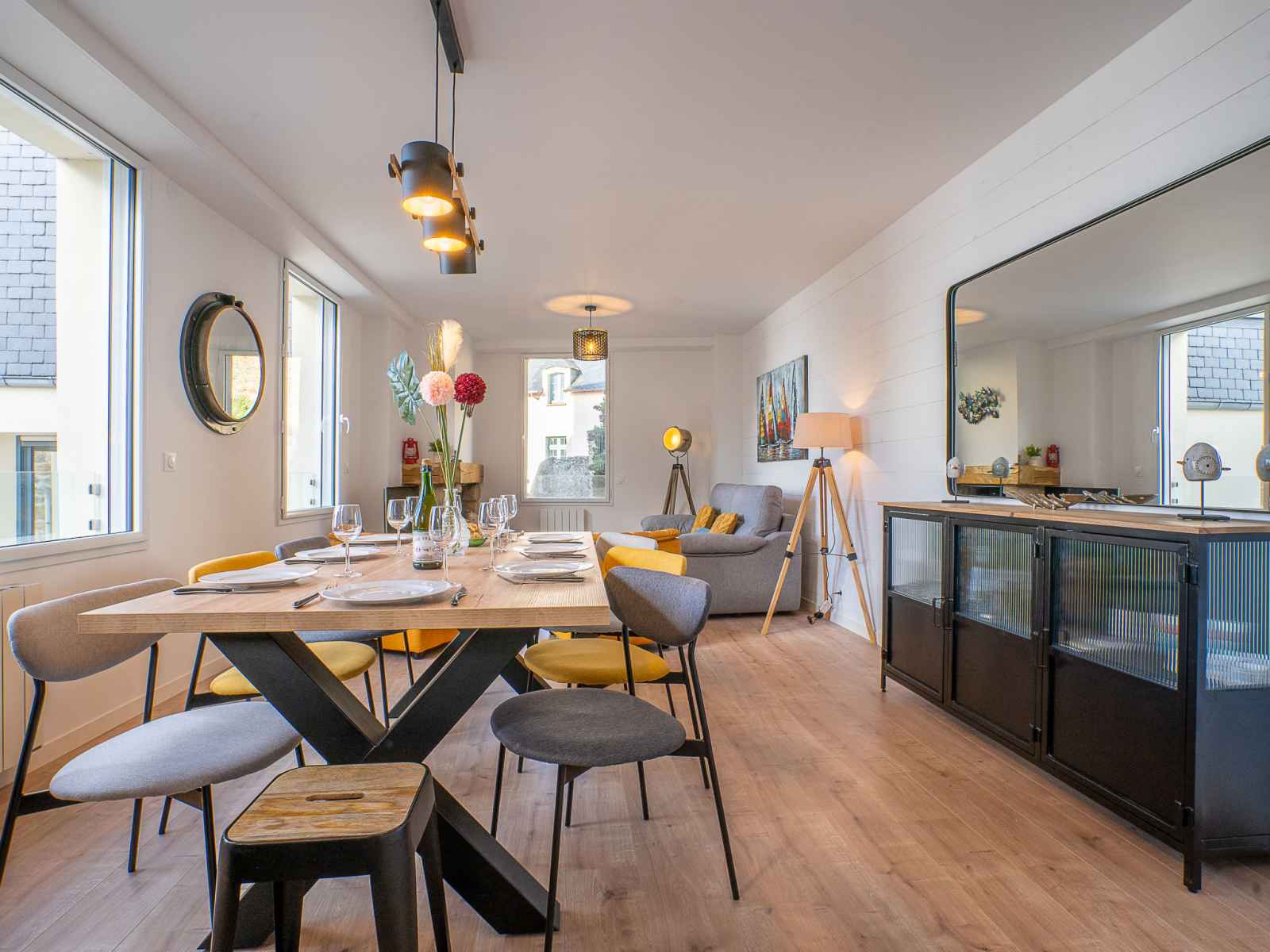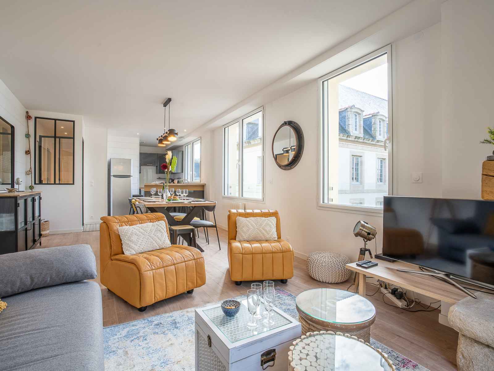 Apt 4 pièces 110 m2 sur 2 niveaux au 1er étage. spacieux et clair, complètement rénové en 2022, aménagement confortable et moderne: grand séjour/salle à manger avec 1 divan-lit double (1 x 140 cm, longueur 190 cm), tv (écran plat), volet roulant électrique. grande cuisine ouverte (four, lave-vaisselle, 3 plaques à induction,