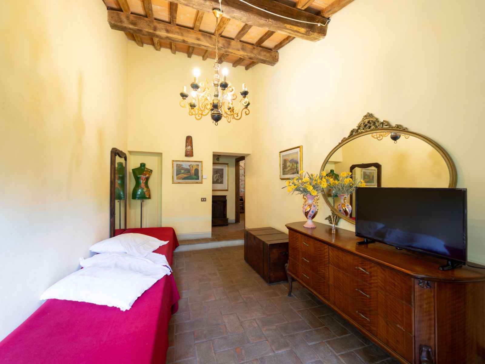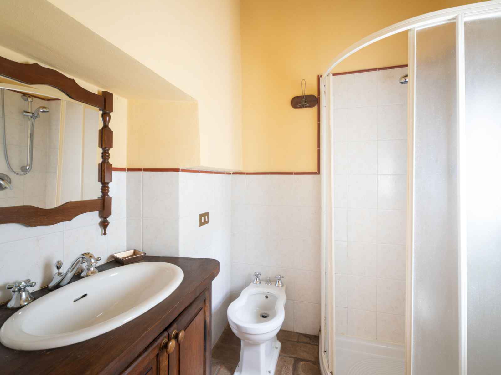 "giallo", apt 5 pièces 150 m2 sur 2 niveaux, au rez-de-chaussée. aménagement à l'ancienne et de bon goût: séjour/salle à manger. sortie sur la terrasse. coin cuisine (2 plaques de cuisson, micro-ondes). À l'étage supérieur: 3 chambres doubles, chaque chambre avec: douche/bidet/wc. chambre avec passage avec 2 couchages et tv (satellite).