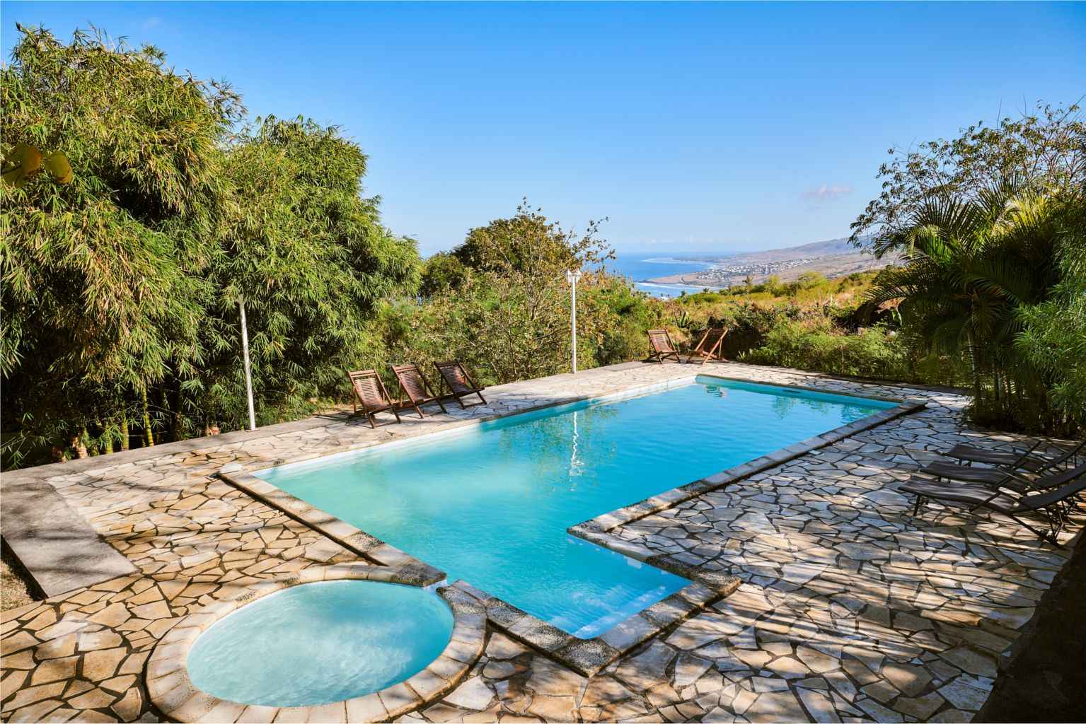 cette maison au charme créole, située au cœur de l’exploitation et à 15m la piscine privée de la propriété, offre une magnifique vue sur la baie de st-leu et sur la montagne.