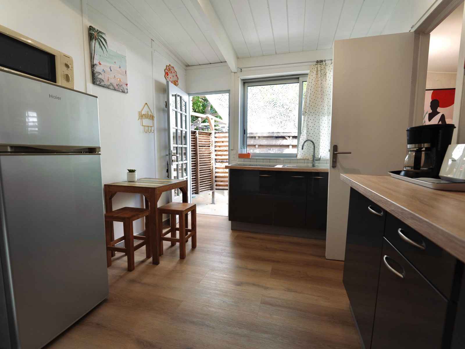 * 1 cuisine aménagée et équipée (réfrigérateur/congélateur, plaque de gaz, micro-onde, cafetière, grille pain, vaisselle…)