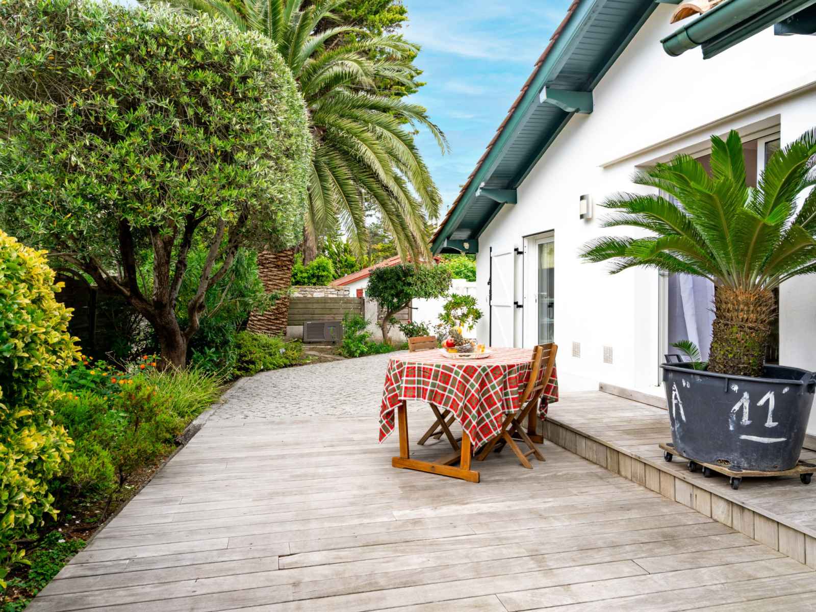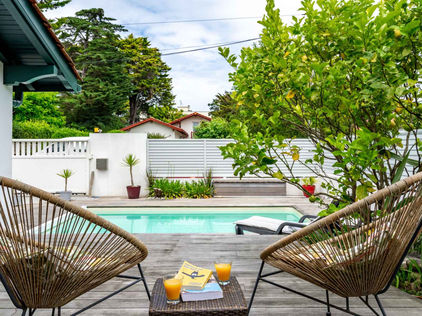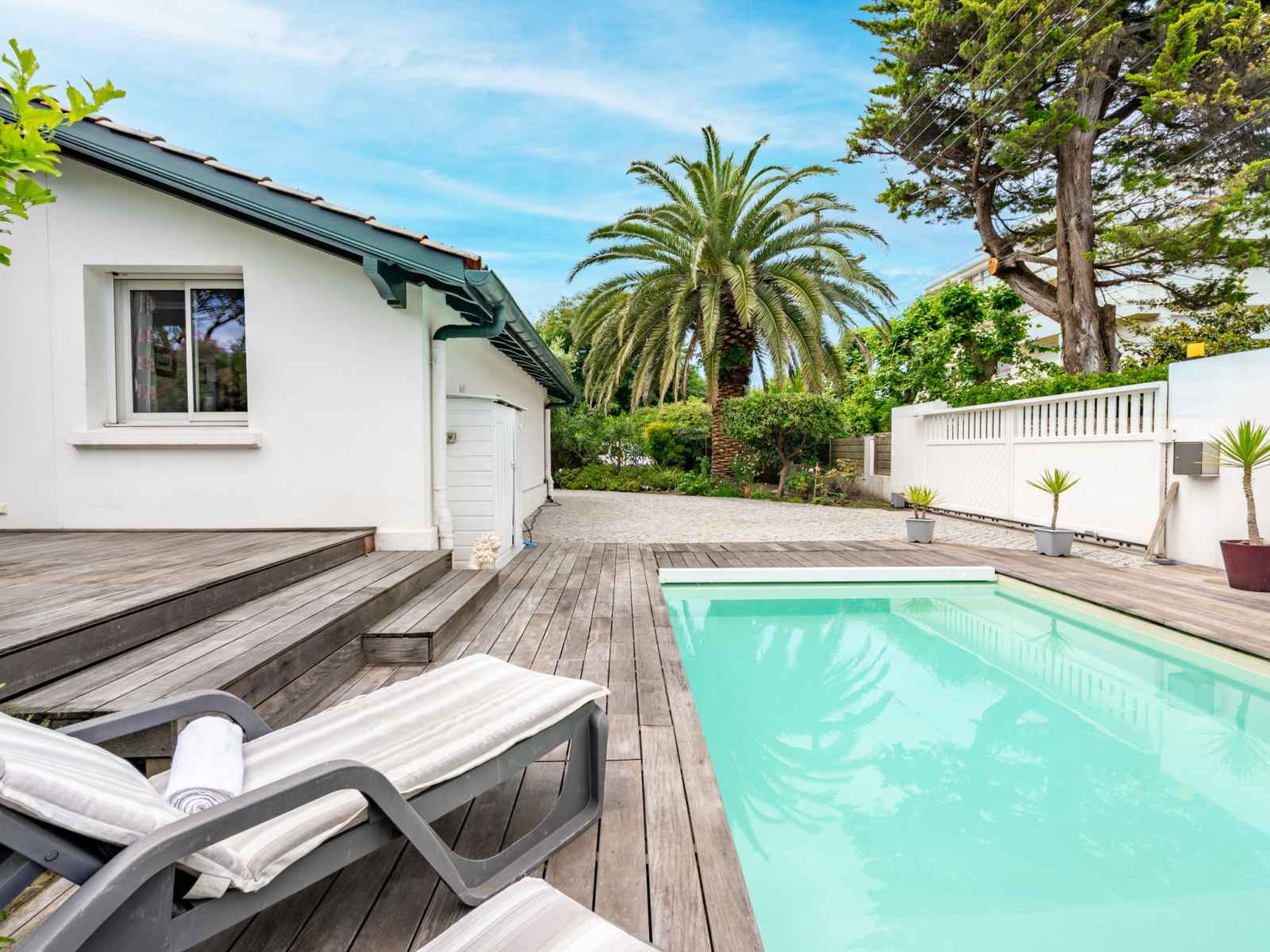 Anglet à 2 km de biarritz: villa "liserons". golf du phare, situation tranquille, à 1.6 km de la mer, à 1.6 km de la plage. a usage privé: terrain 460 m2, jardin pelouse et plantes, piscine (3 x 5 m, disponibilité saisonnière: 01.jun. - 30.sep.) avec protection par couverture de volet. place de parking (pour 2 voitures) sur le terrain.
