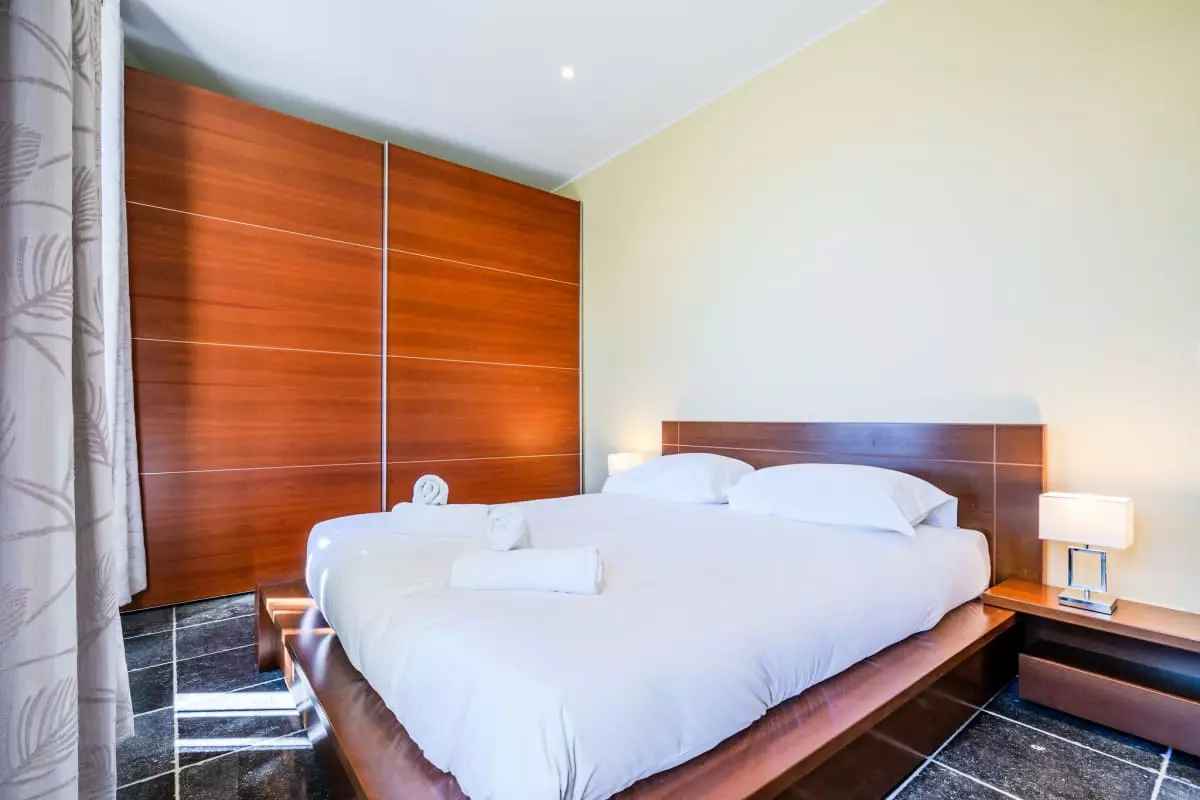 - Une chambre de maître avec salle de douche et WC en suite, grande armoire et TV écran plat (uniquement avec lecteur DVD, pas de chaînes), et ouvrant également sur un balcon filant.