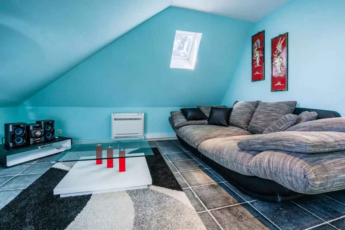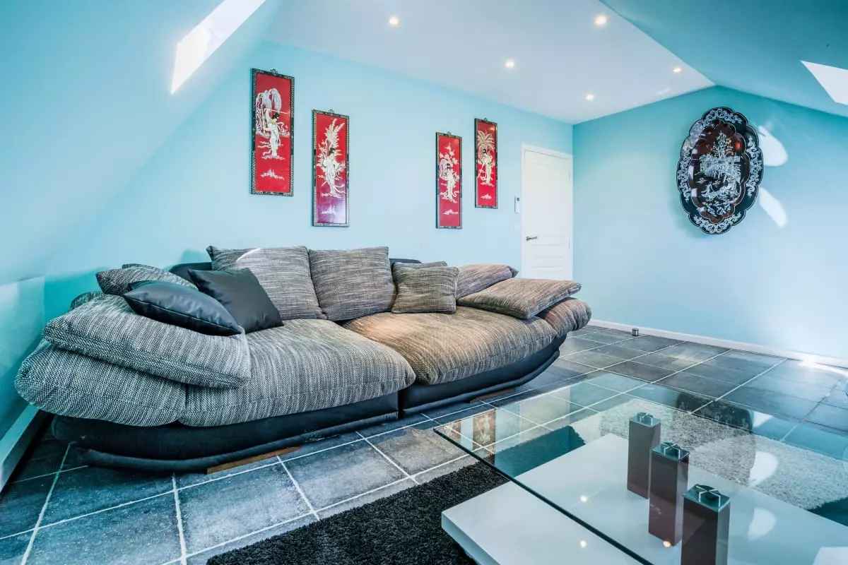 - Une salle de détente avec un espace bureau, un énorme canapé et une sono.