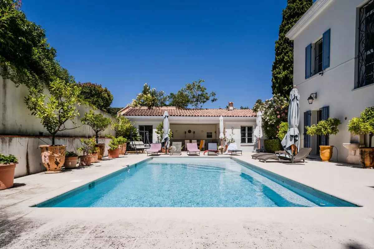 A l’extérieur de la villa, vous profiterez d’une piscine de 10mx4m assortie de ses transats, entièrement à l’abri des regards puisqu’enclavée à l’arrière de la maison, et d'un espace terrassé et ombragé pour prendre vos repas.