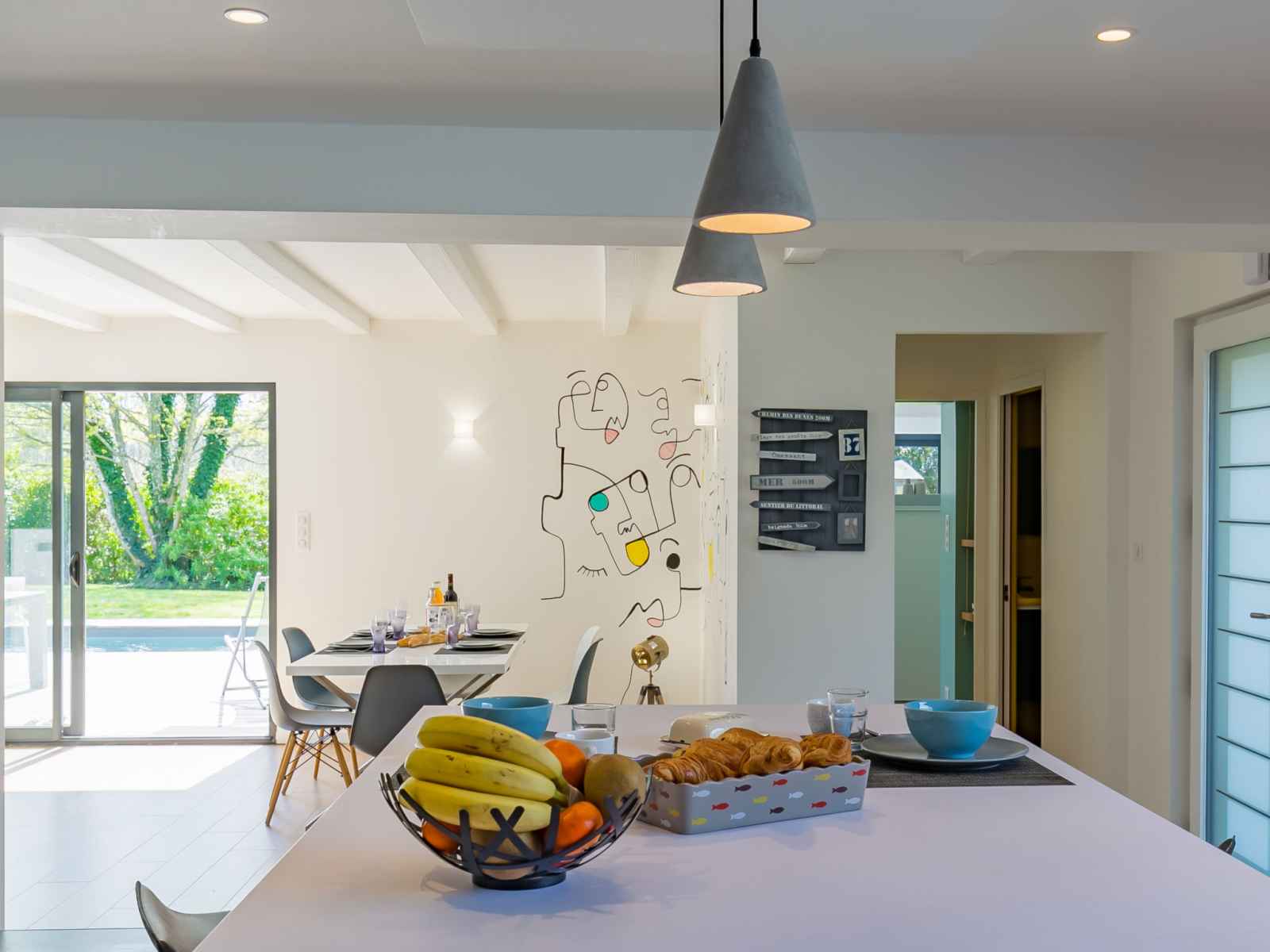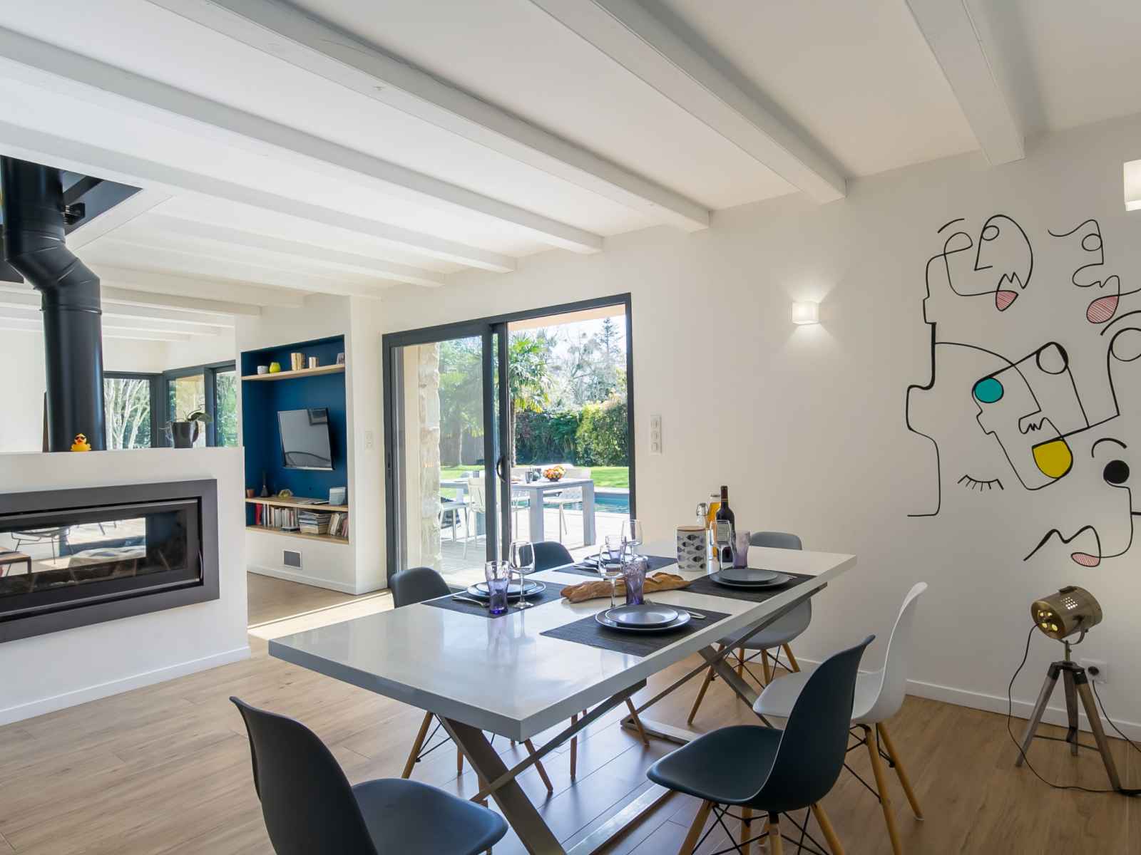"breizh riviera", maison 4 pièces 130 m2 sur 2 niveaux. spacieux et clair, aménagement moderne et de bon goût: séjour/salle à manger avec cheminée, table pour les repas, tv (satellite), chaînes de tv internationales et écran plat. sortie sur la terrasse, sur la piscine. 1 chambre avec 1 grand-lit (180 cm, longueur 200 cm), douche et double