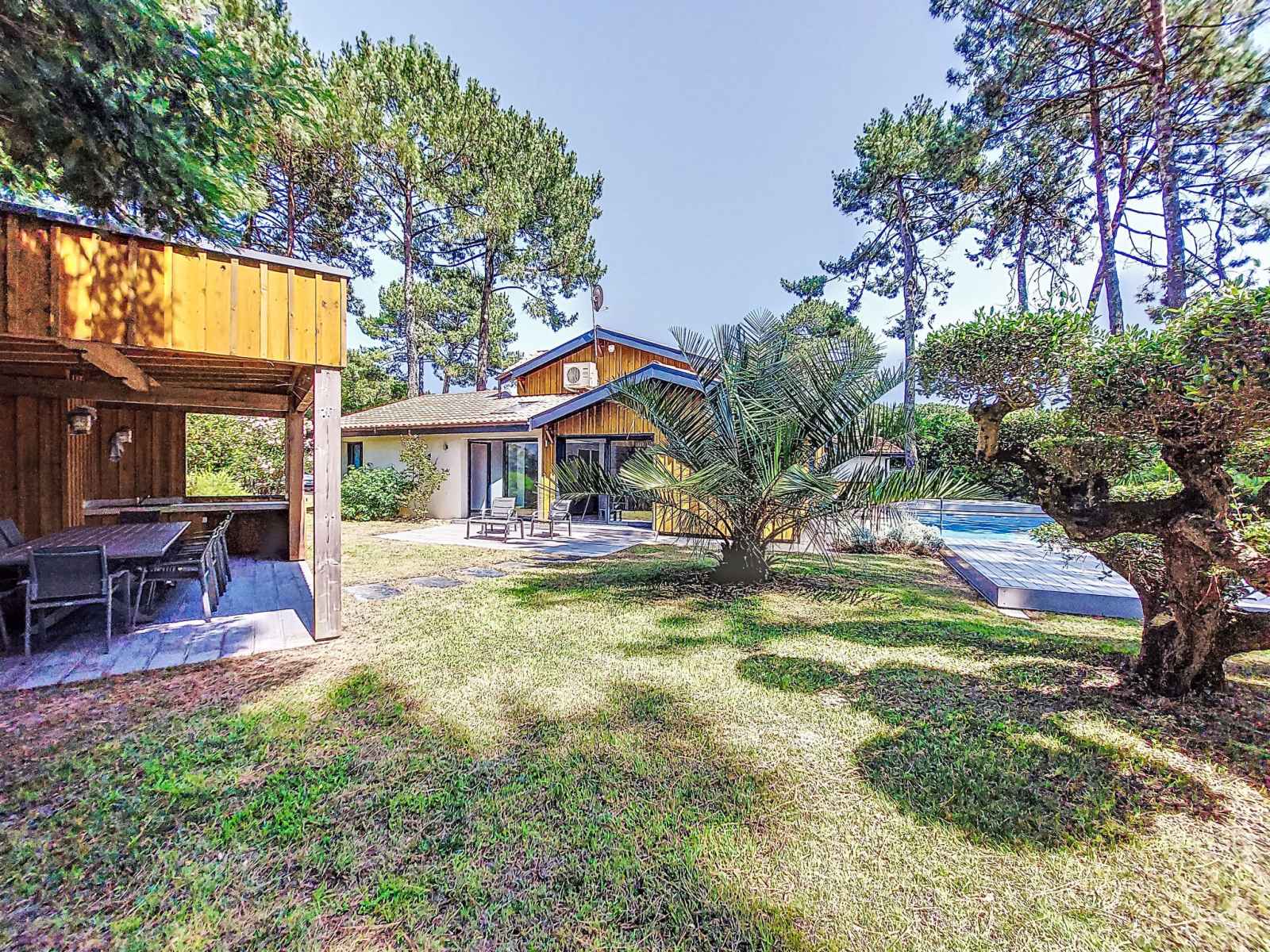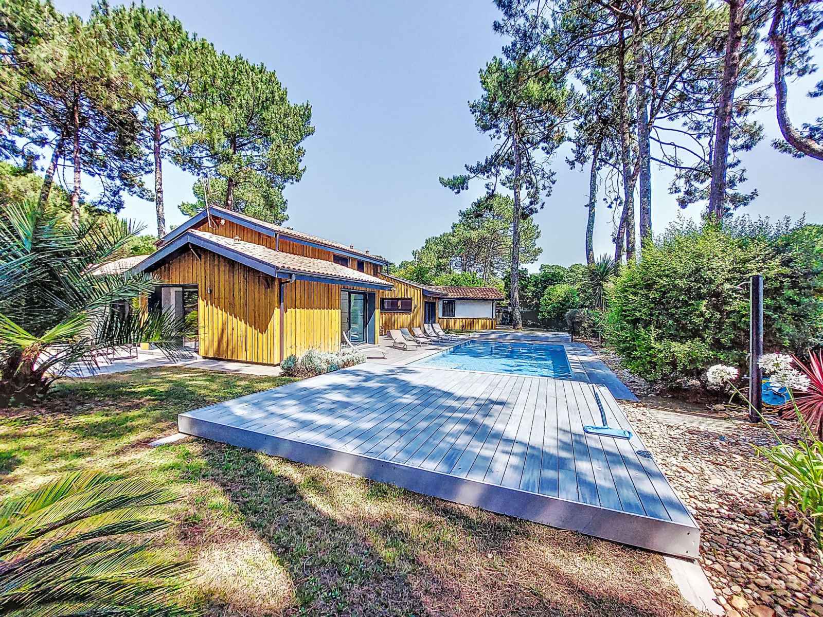 Villa "villa les verdiers". À 1 km de la mer, à 1 km de la plage. a usage privé: terrain, jardin 1'265 m2 (clôturé), piscine chauffée (9 x 4 m, profondeur 110 - 140 cm, disponibilité saisonnière: 01.jun. - 30.sep.). douche extérieure, pool house, place de parking (pour 4 voitures) sur le terrain. abri voiture. magasins, supermarché 200