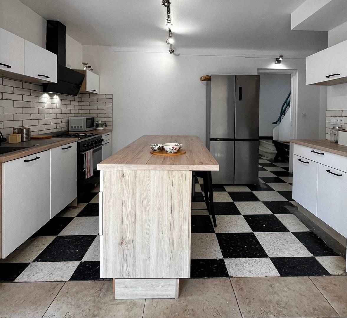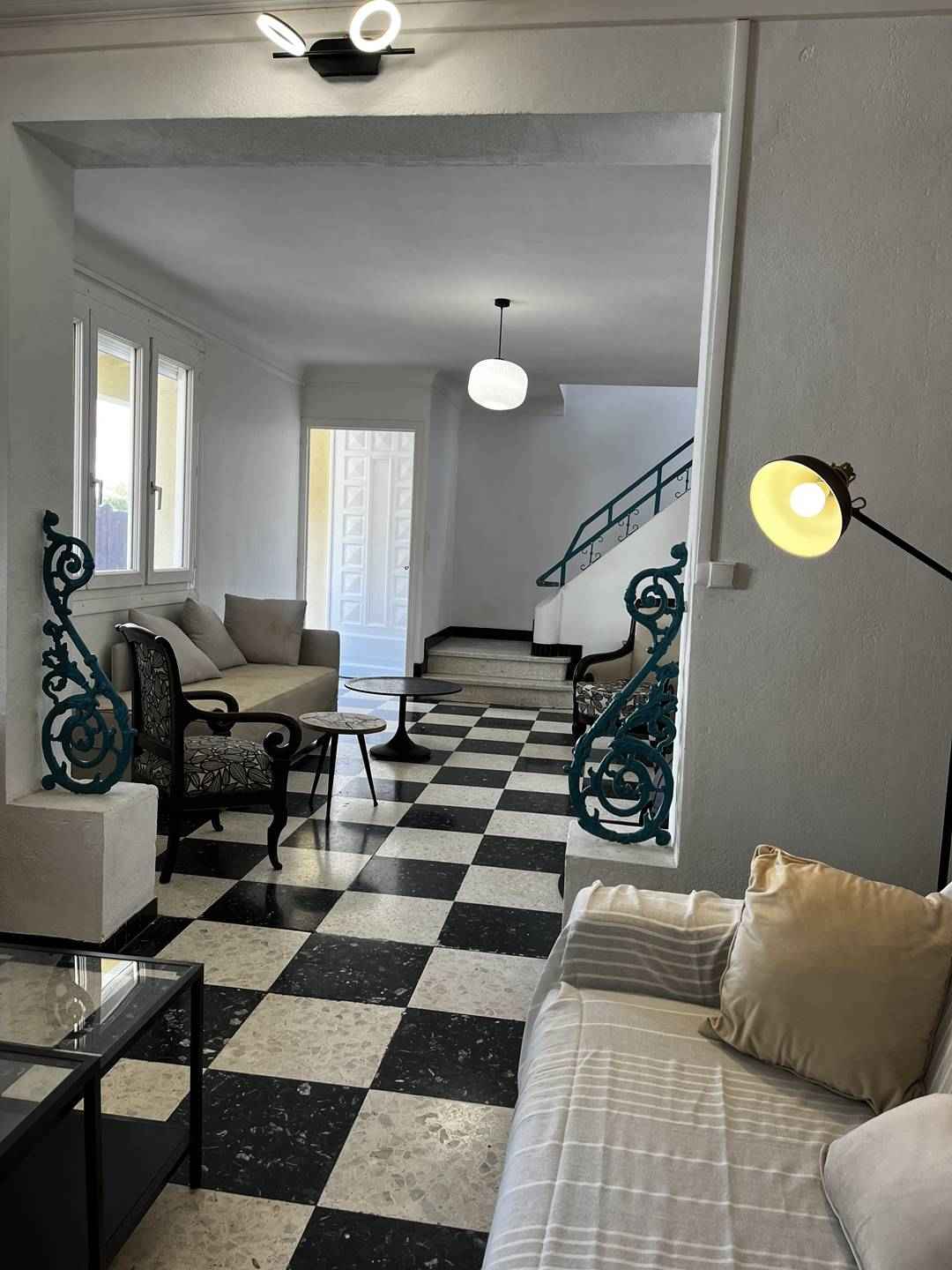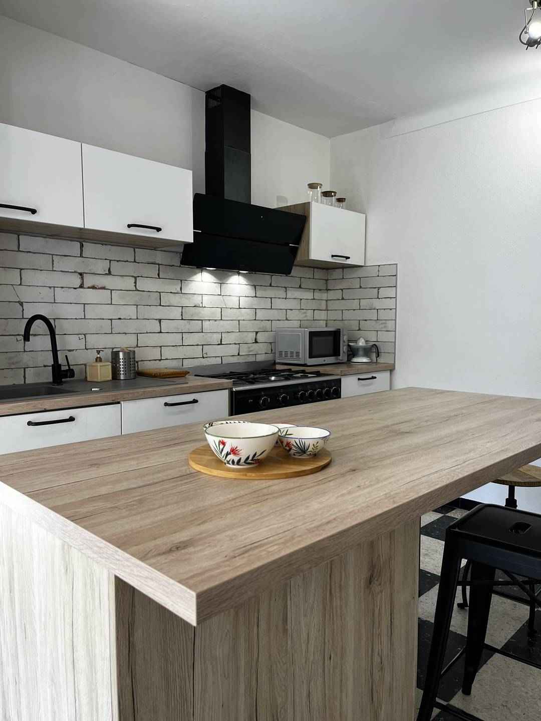 le rez-de-chaussée se compose d'un grand salon lumineux avec des canapés et une tv, d'une cuisine entièrement équipée, d'une salle à