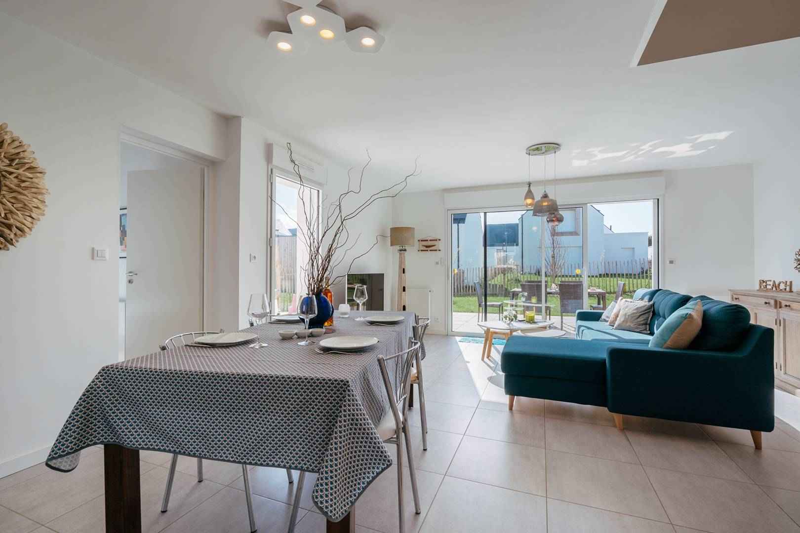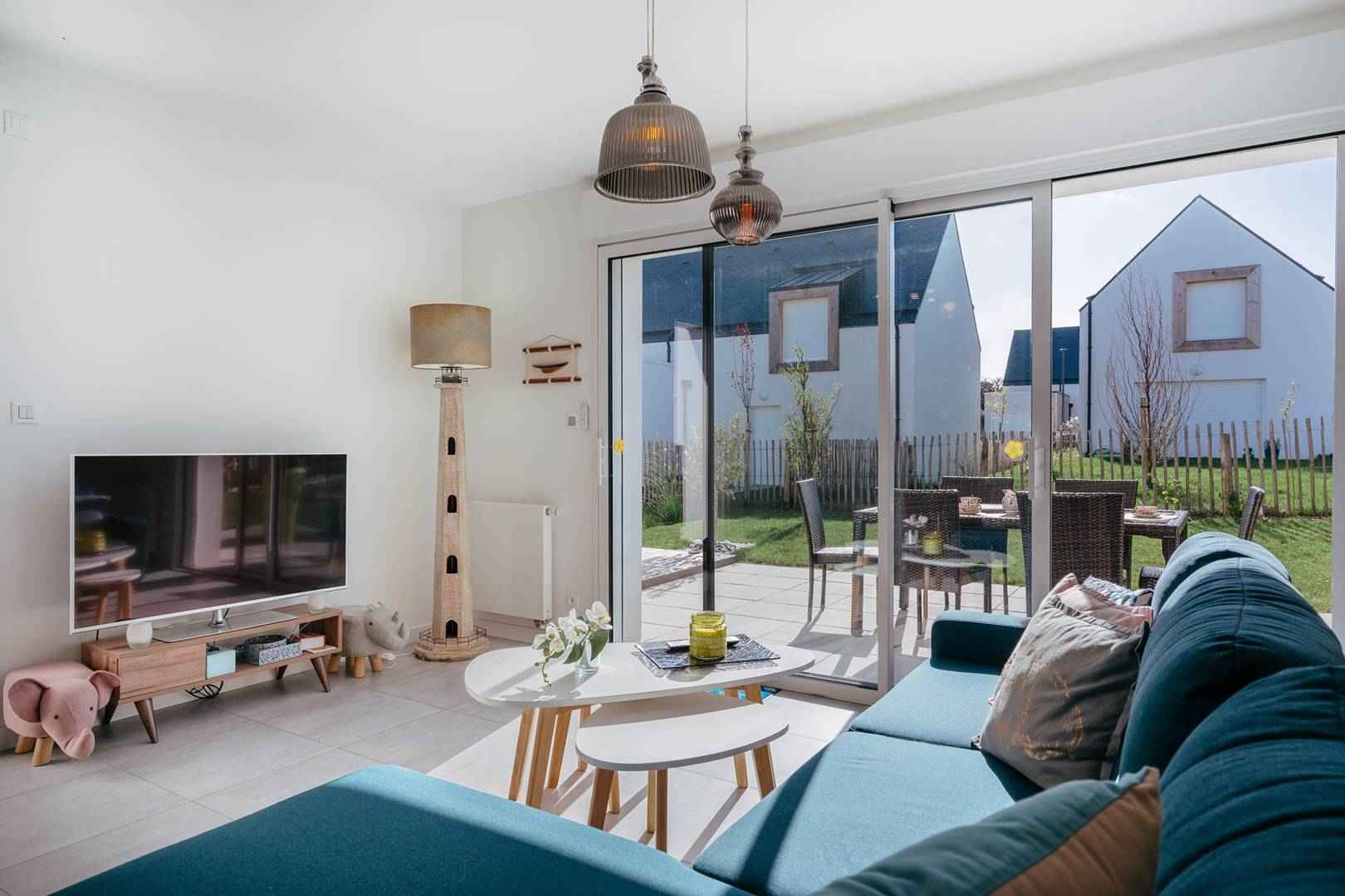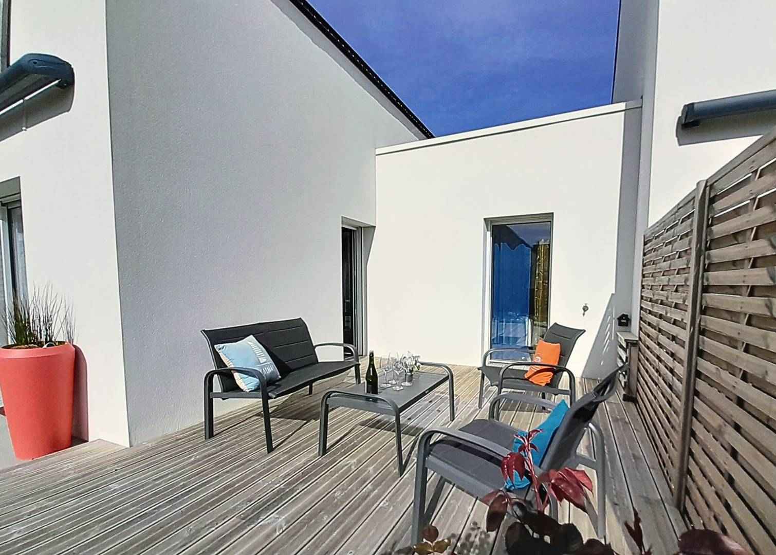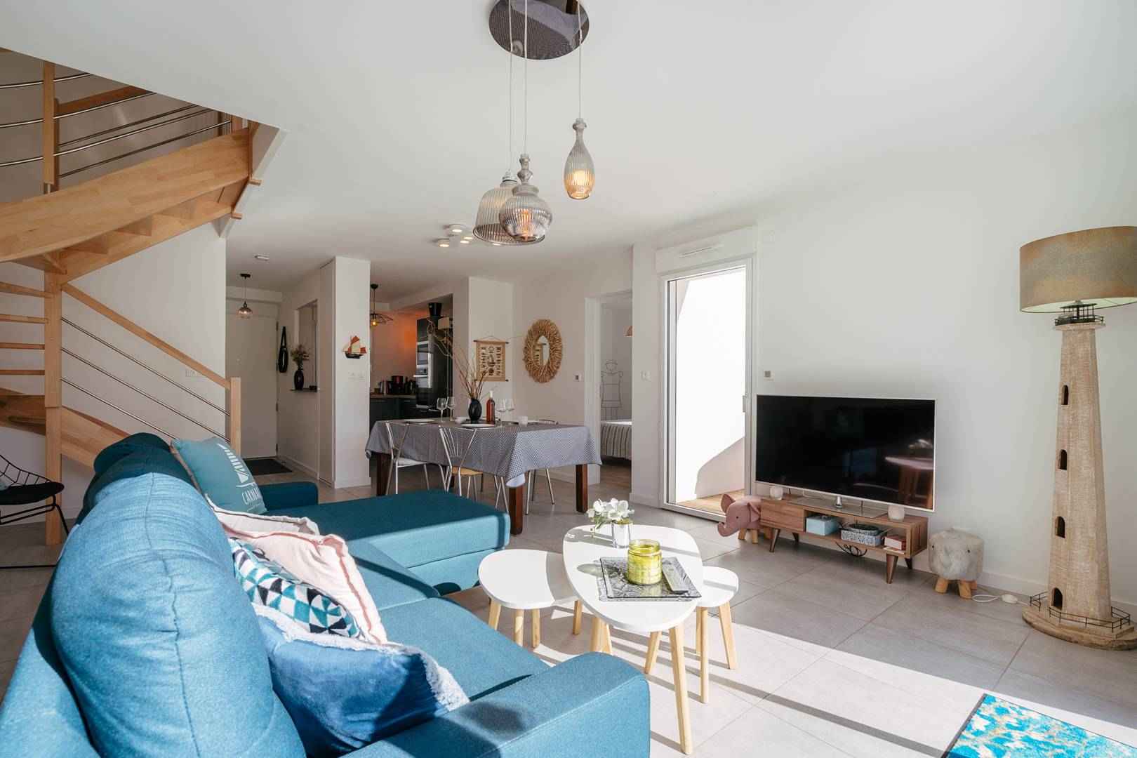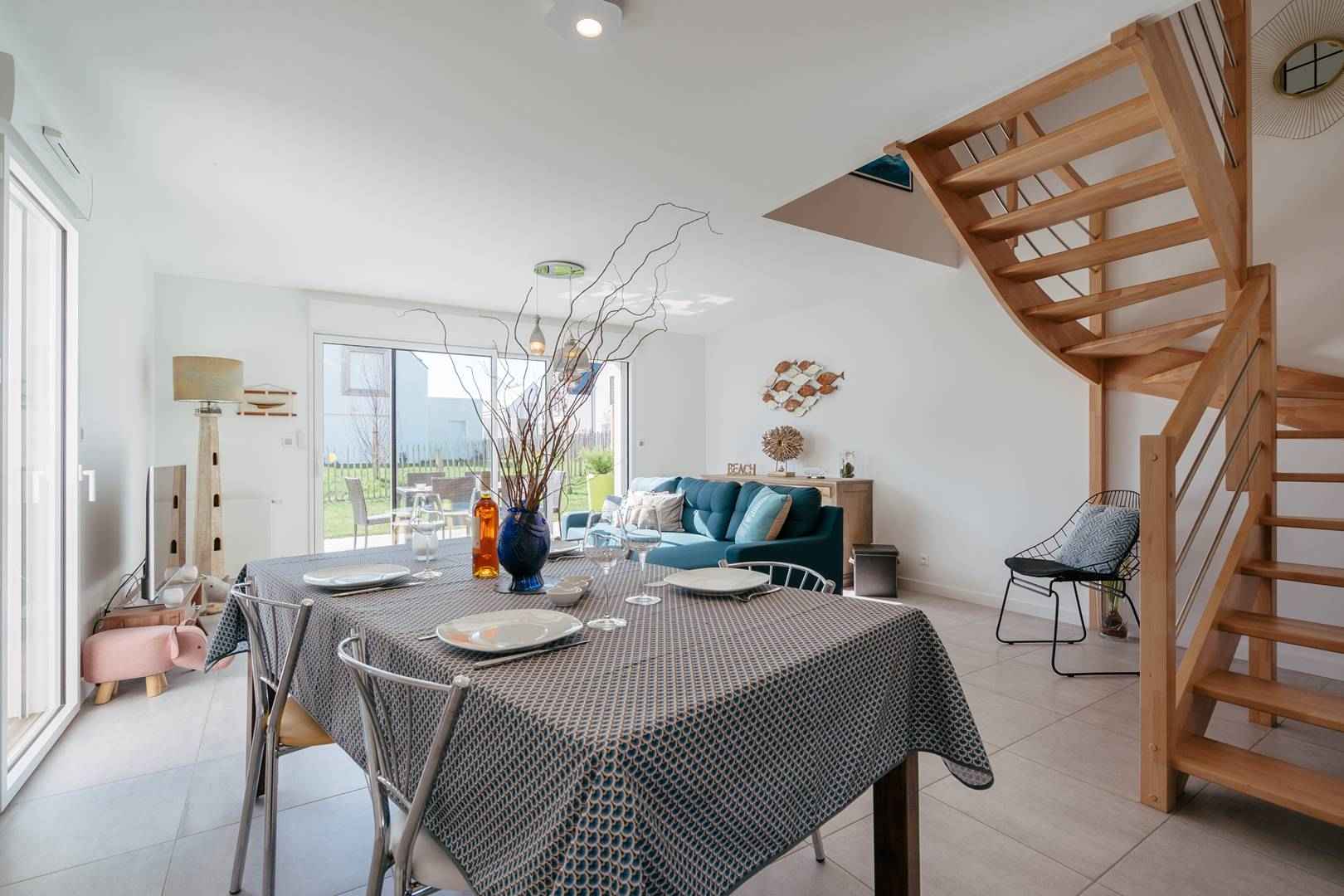 - Séjour avec partie salon (canapé, TV connectée) et partie repas (table et chaises) donnant sur les 2 terrasses exposées sud-ouest et prolongées par le jardin privatif clos (salon de jardin, transats, douche "retour de plage")