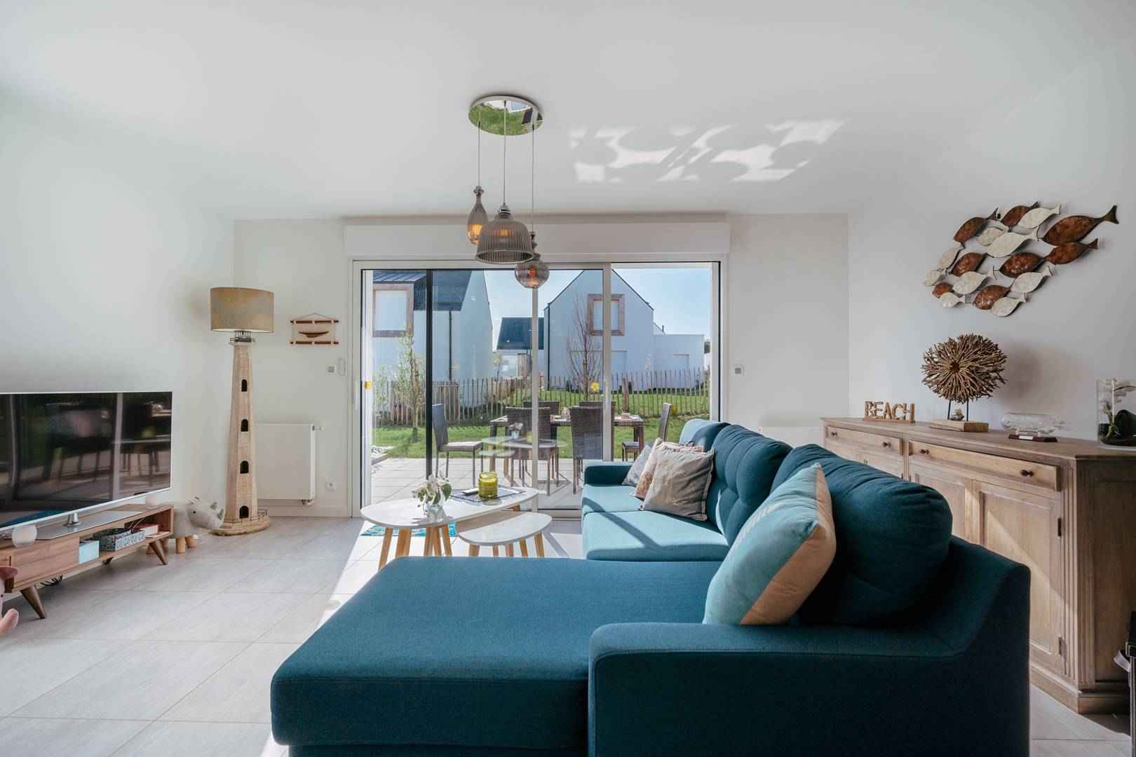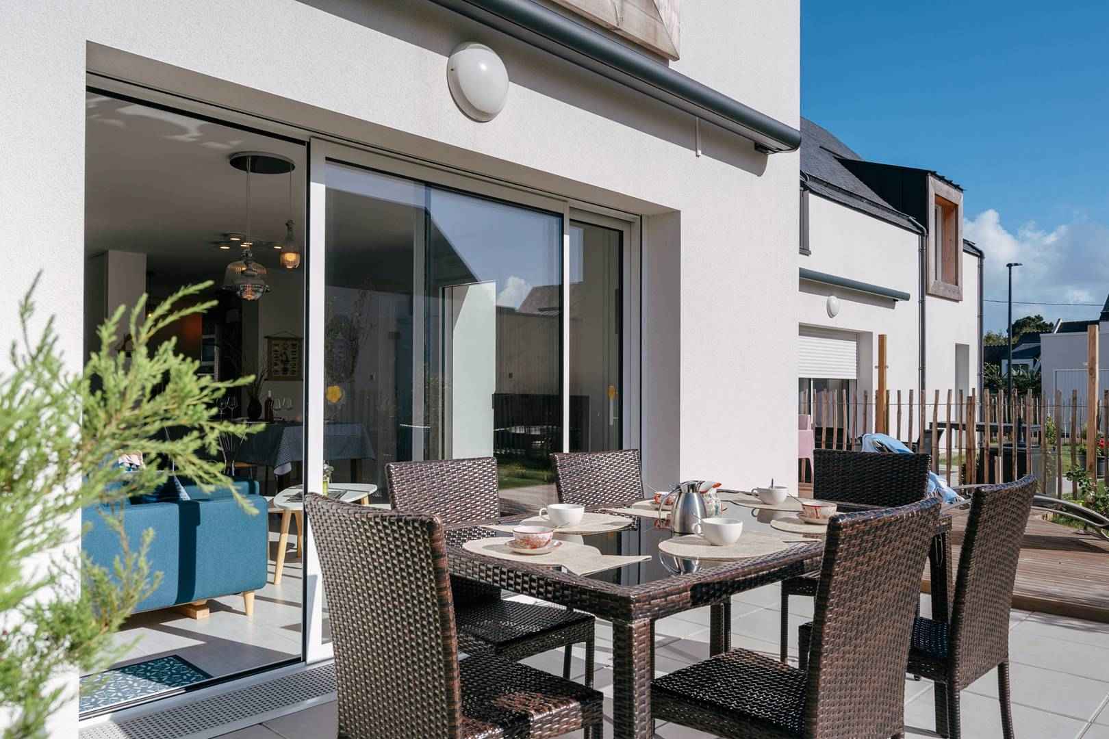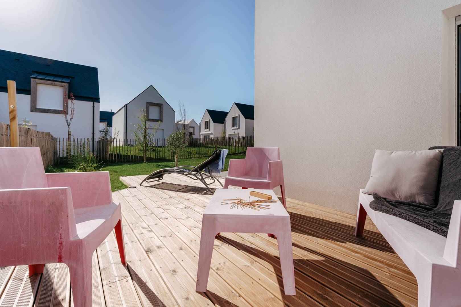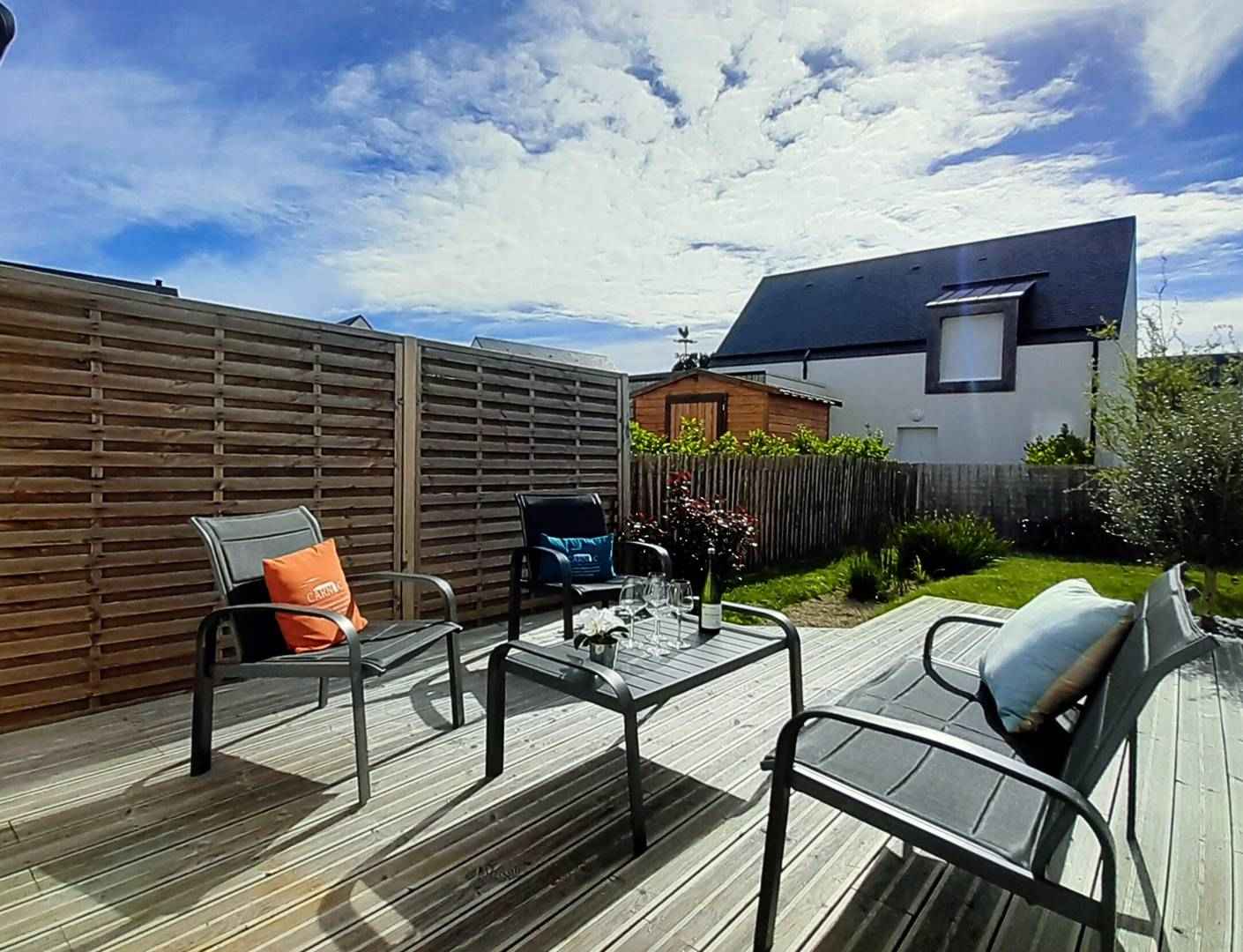 - Séjour avec partie salon (canapé, TV connectée) et partie repas (table et chaises) donnant sur les 2 terrasses exposées sud-ouest et prolongées par le jardin privatif clos (salon de jardin, transats, douche "retour de plage")