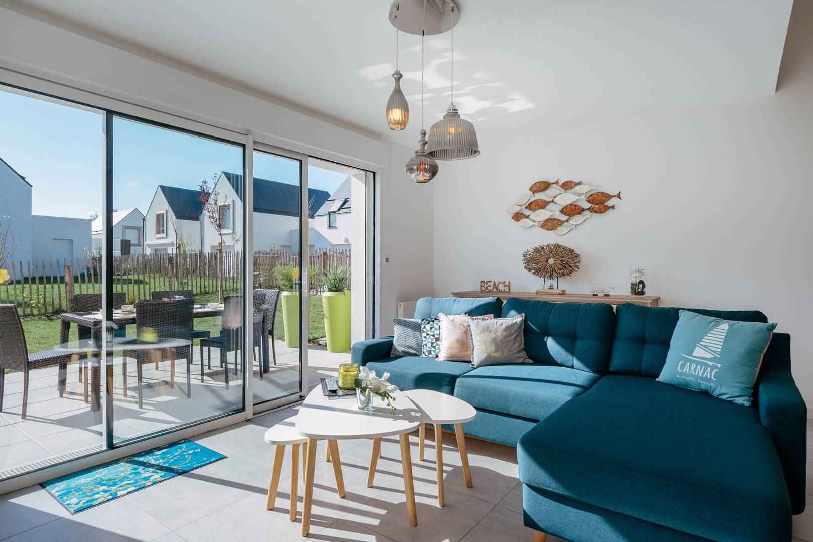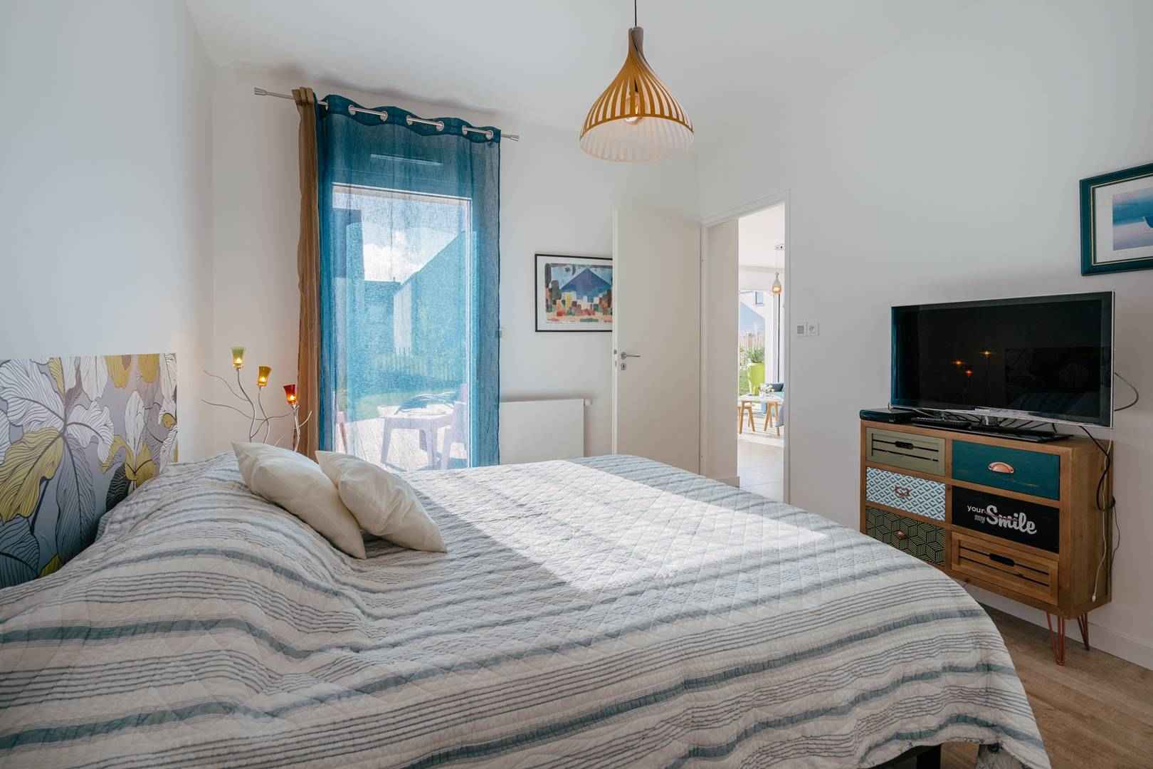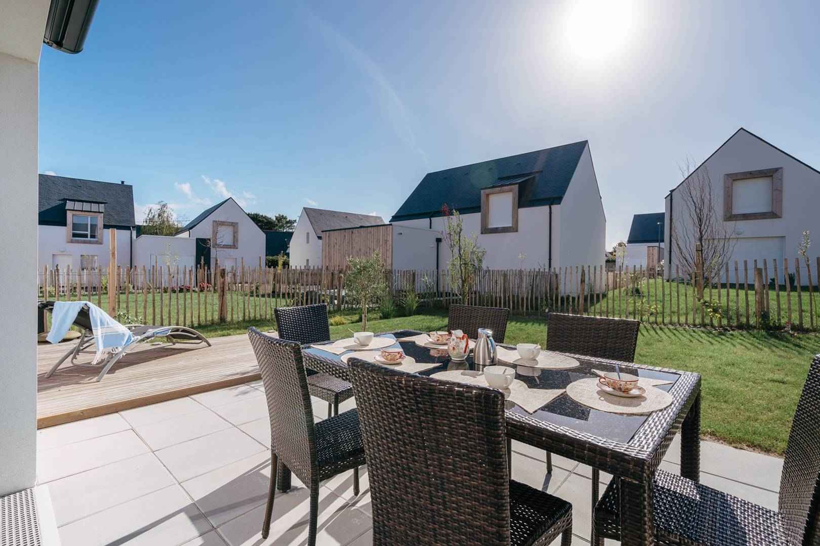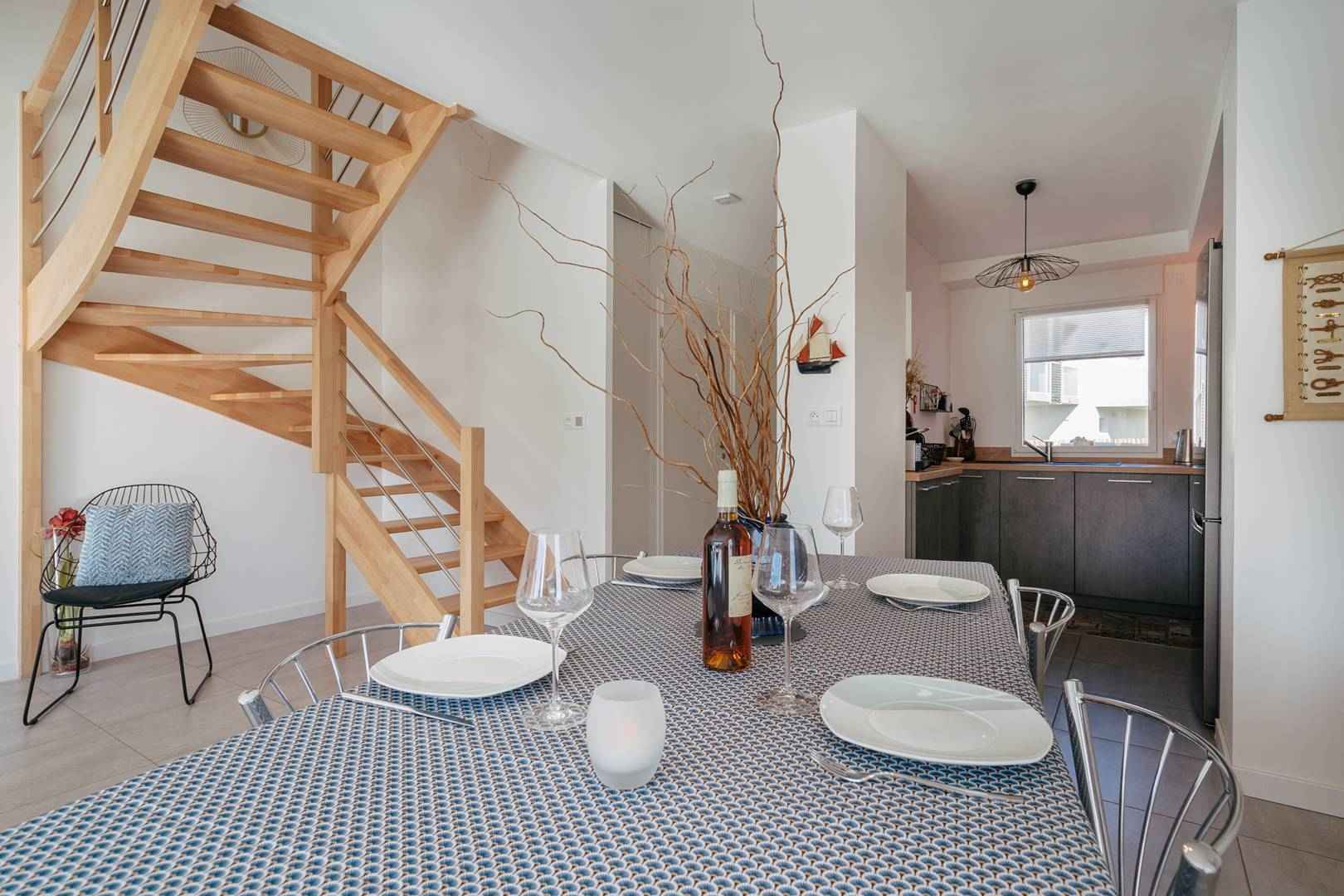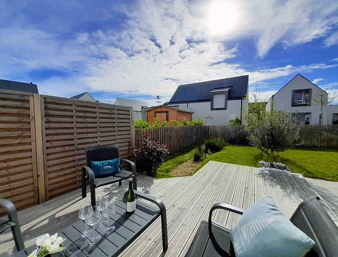- Séjour avec partie salon (canapé, TV connectée) et partie repas (table et chaises) donnant sur les 2 terrasses exposées sud-ouest et prolongées par le jardin privatif clos (salon de jardin, transats, douche "retour de plage")