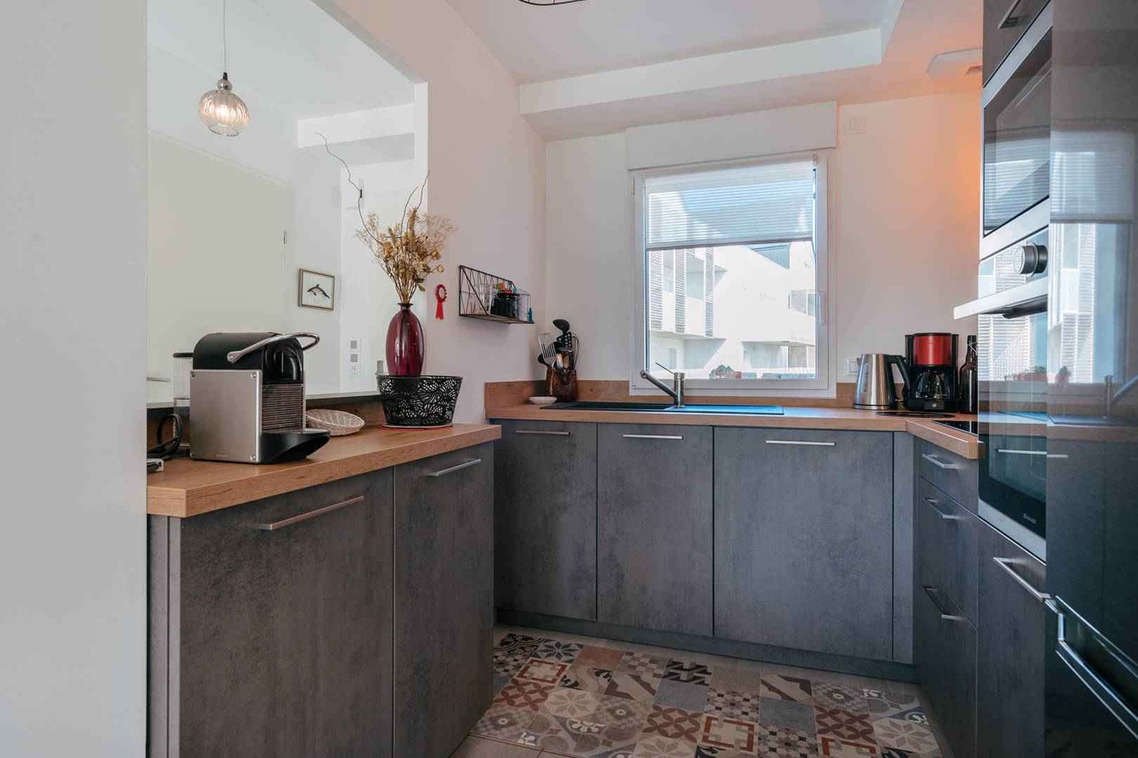 - cuisine ouverte et équipée (plaque induction 3 feux, four, micro-ondes, réfrigérateur