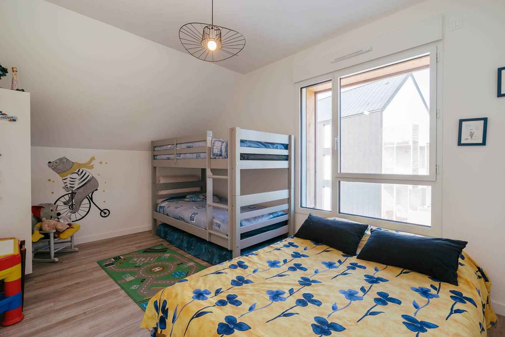 - 1 chambre avec 2 lits individuels superposés (90, couettes) et 1 lit double clic-clac (140, couette)