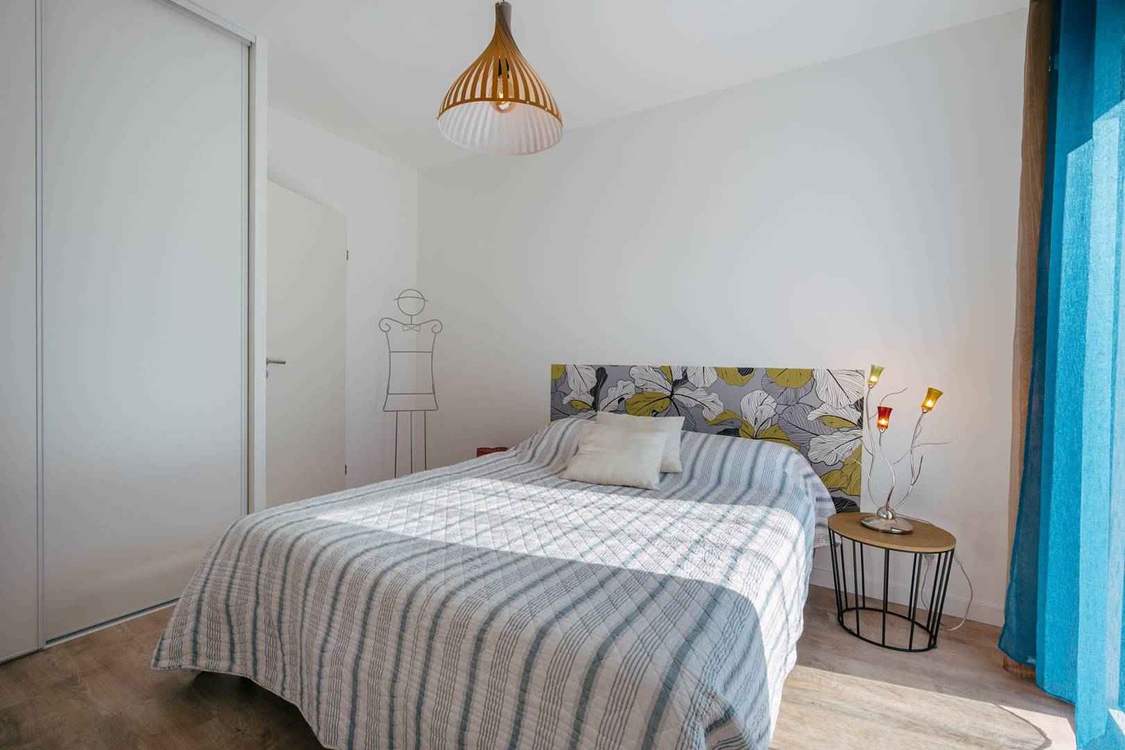 - 1 chambre avec 1 lit double (140, couette) et rangements