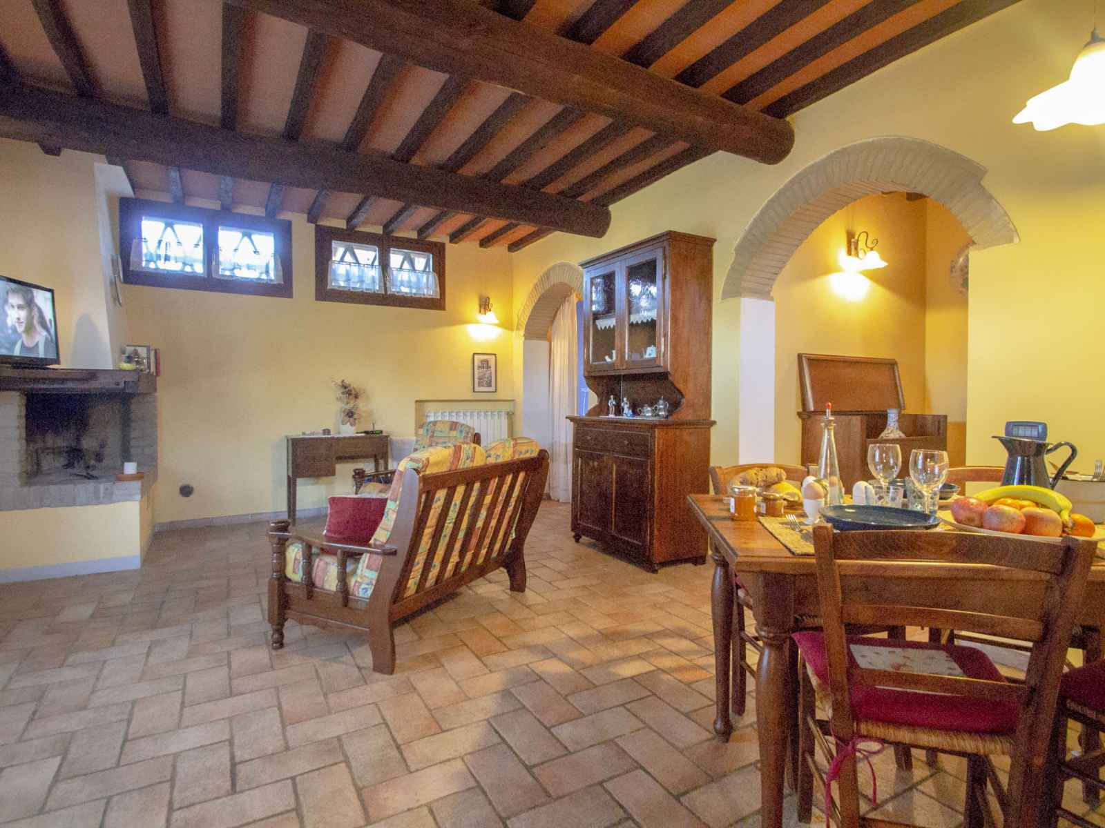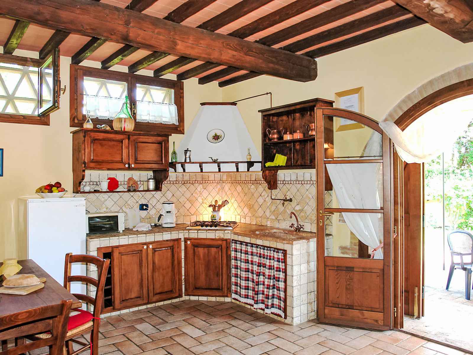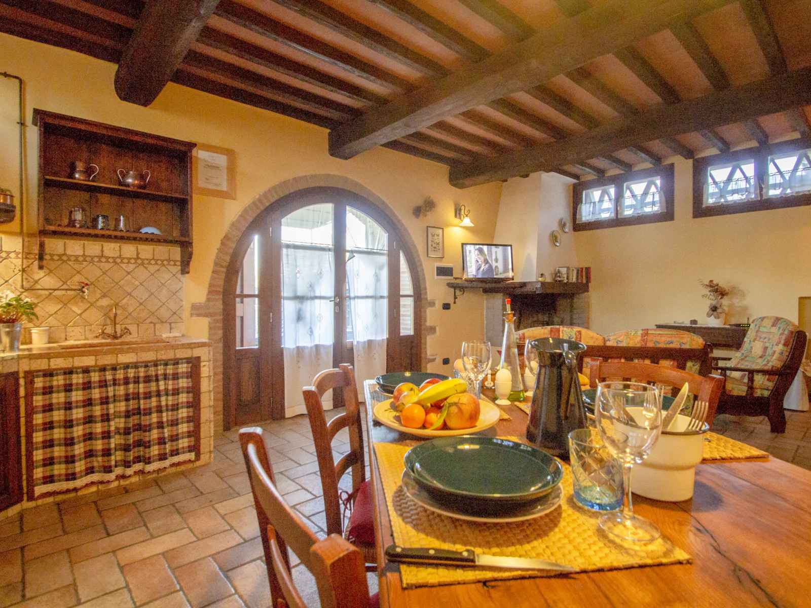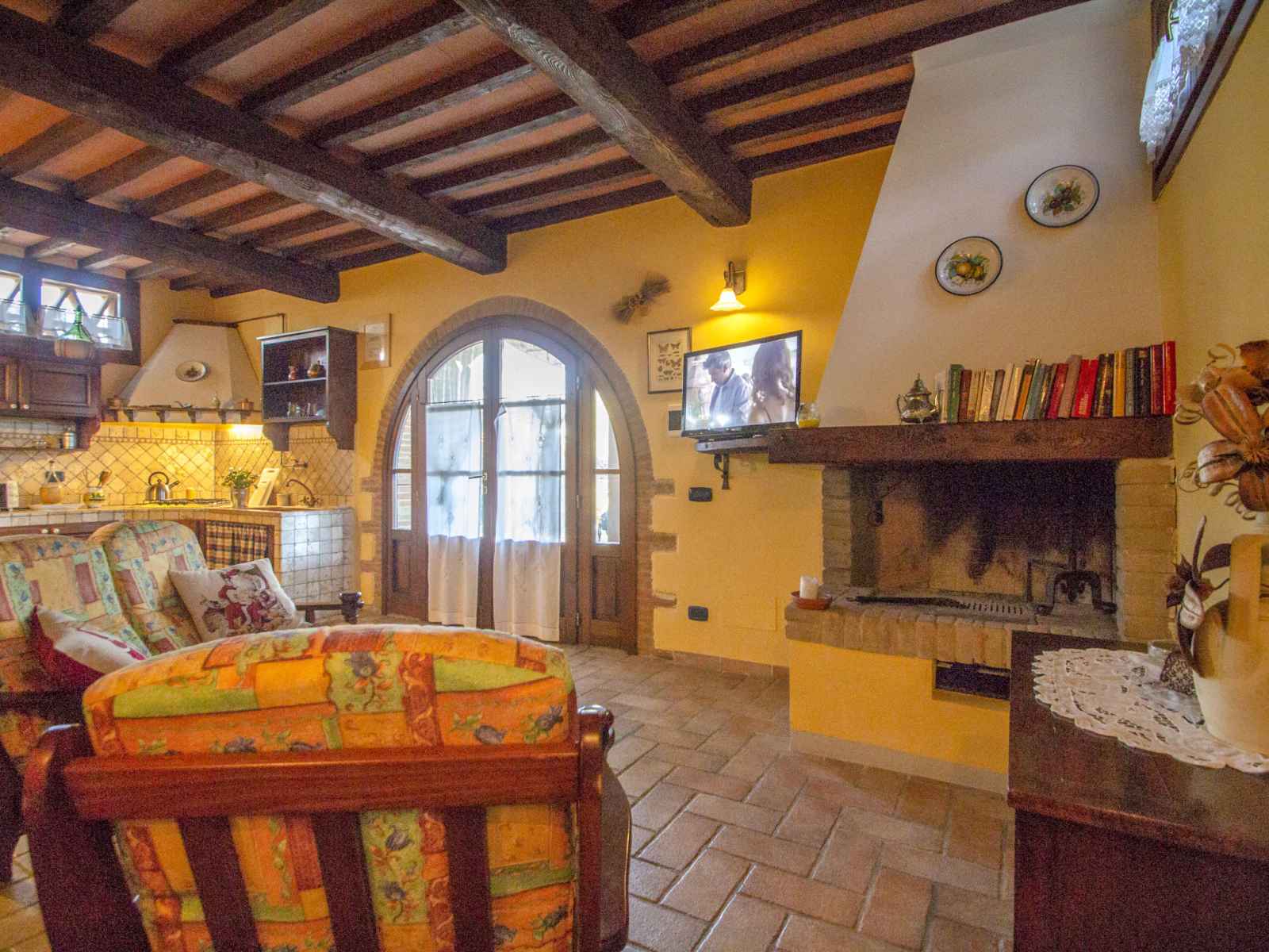 "capanna di sotto", maison jumelée 3 pièces 90 m2 sur 2 niveaux, au rez-de-chaussée. rénovée, aménagement de bon goût et plaisant: séjour/salle à manger avec cheminée, table pour les repas et tv (satellite). sortie sur le jardin, sur la terrasse. 1 chambre double. sortie sur la terrasse. coin cuisine (4 plaques de cuisson, mini-four,