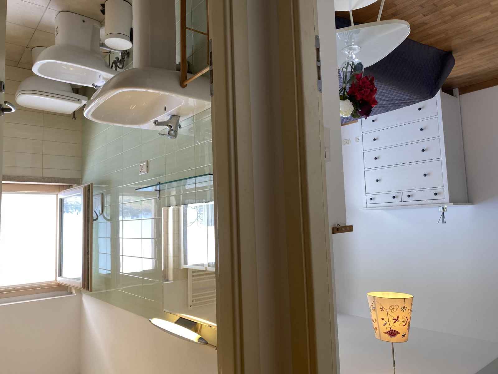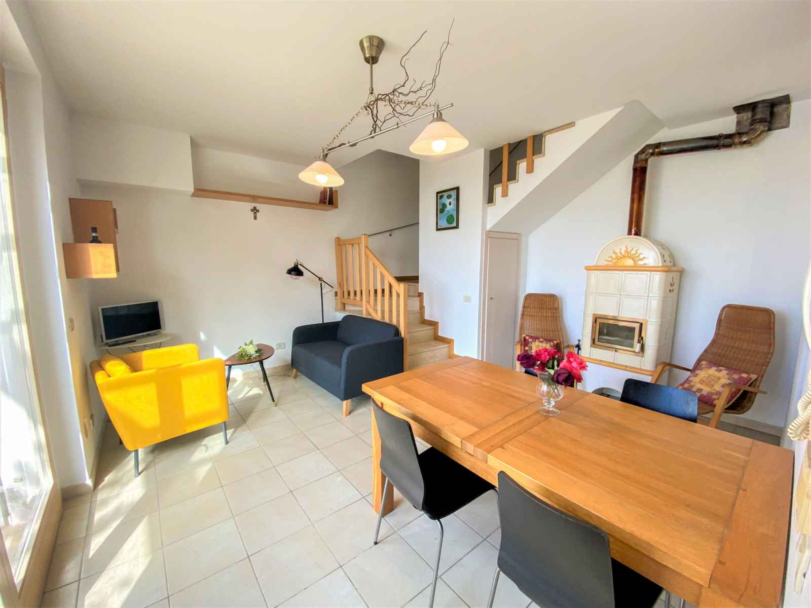 "casa chiara", maison 3 pièces 75 m2 sur 2 niveaux, situation ouest. aménagement fonctionnel et moderne: séjour/salle à manger avec table pour les repas et tv (écran plat), poêle à bois. cuisine (four, lave-vaisselle, 5 feux, grille-pain, bouilloire électrique, micro-ondes, congélateur, cafetière électrique, capsules pour machine à