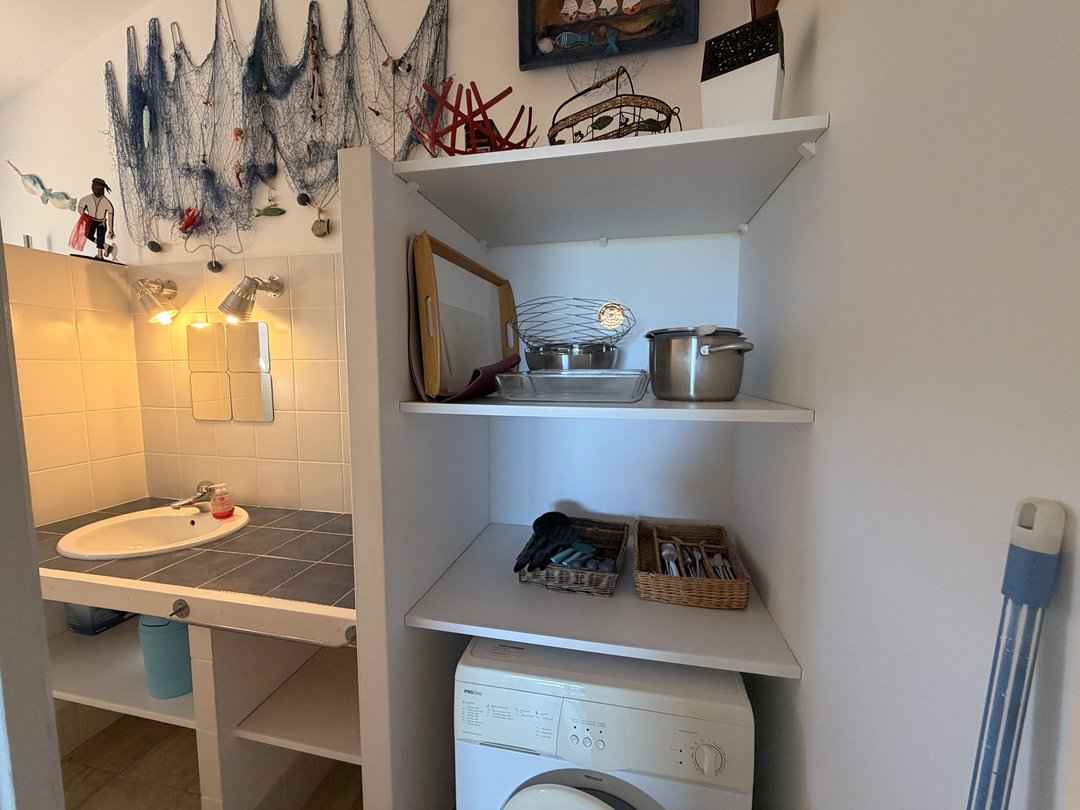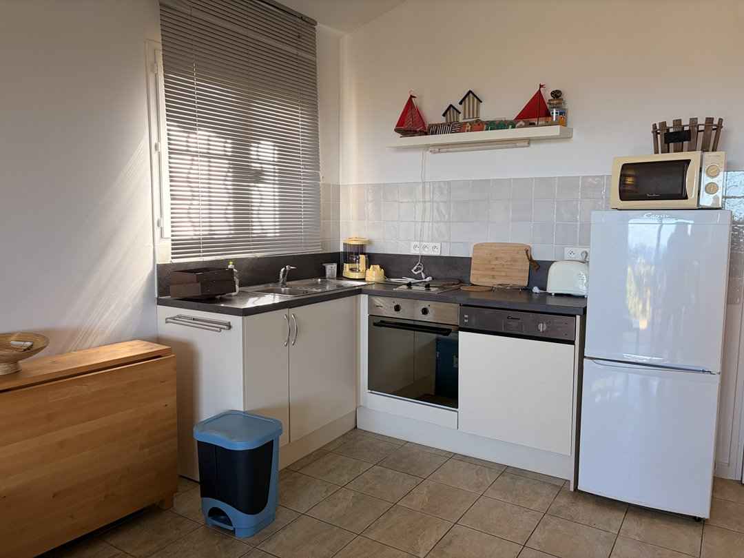 - Séjour/ cuisine (Entrée sur séjour aménagé : canapé convertible, tv (tnt), cuisine ouverte entièrement équipée : combiné frigo-congélateur, plaque électrique 2 feux, four électrique, lave-vaisselle, cafetière filtre, four micro-onde, grille-pain..)