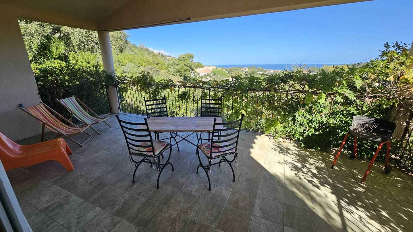 - Terrasse couverte avec transats, salon de jardin, barbecue, vue mer.