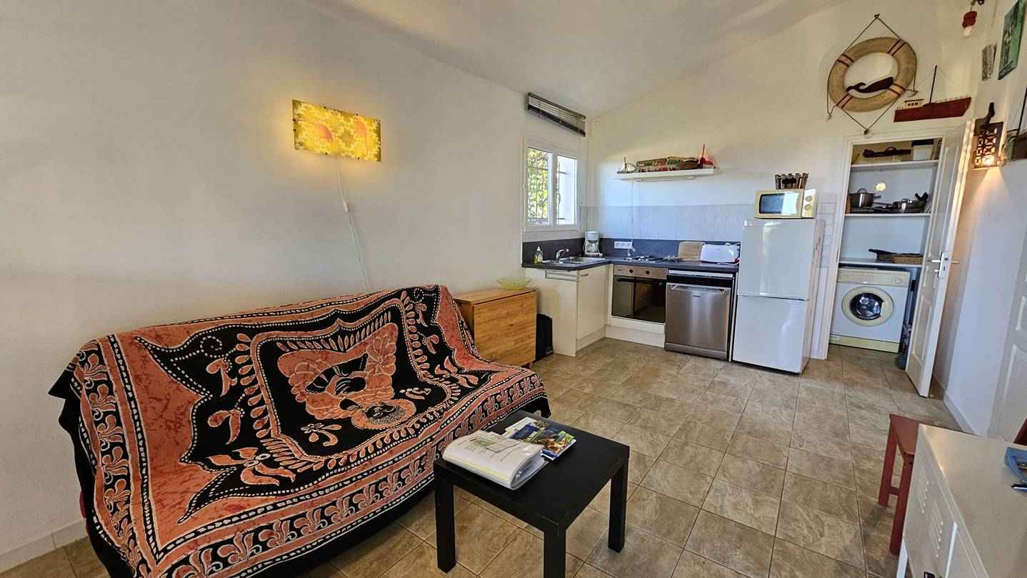 - Séjour/ cuisine (Entrée sur séjour aménagé : canapé convertible, tv (tnt), cuisine ouverte entièrement équipée : combiné frigo-congélateur, plaque électrique 2 feux, four électrique, lave-vaisselle, cafetière filtre, four micro-onde, grille-pain..)