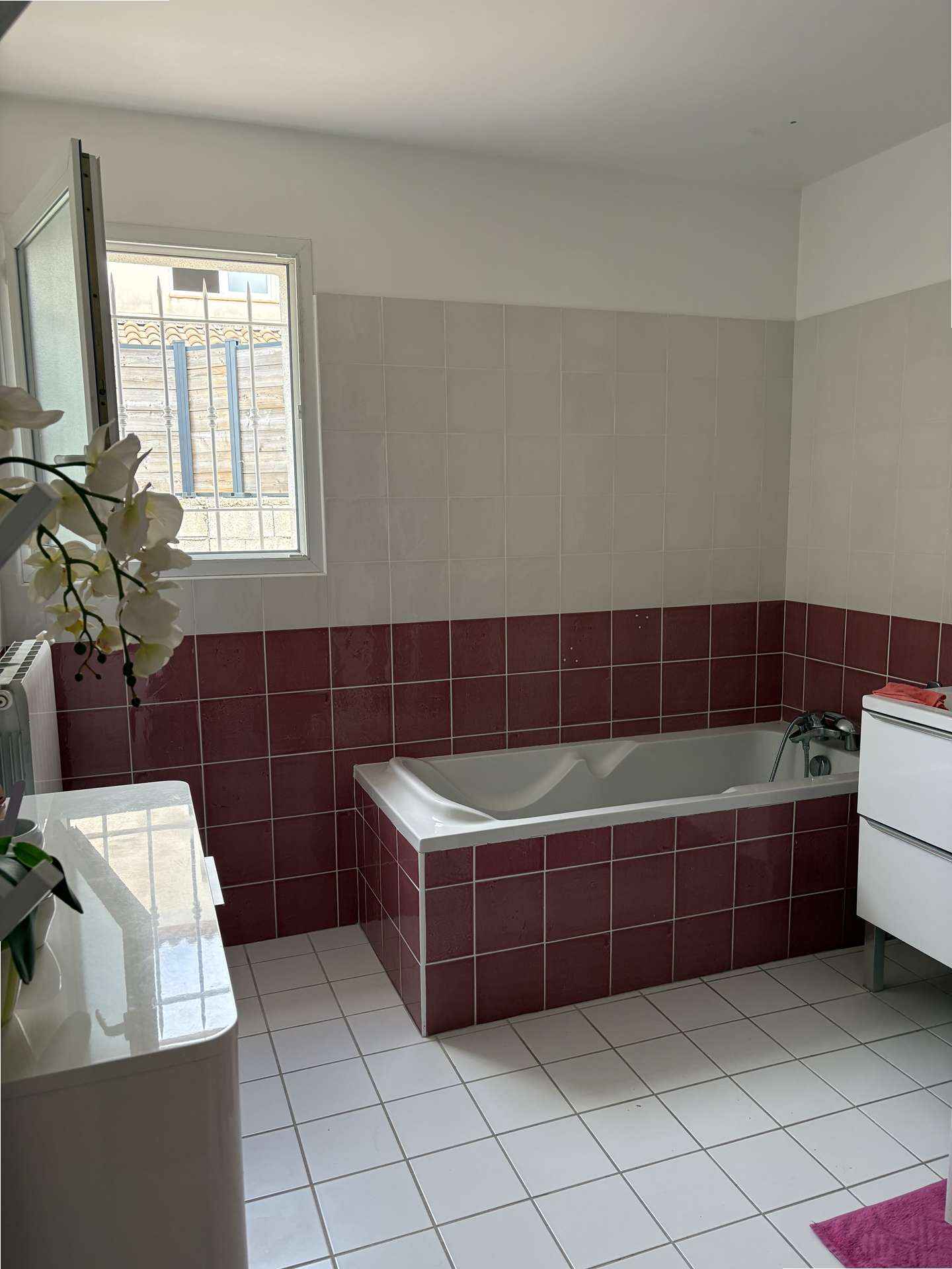 - Salle de bain (Elle possède une baignoire et une cabine de douche. il y a un meuble vasque également.)