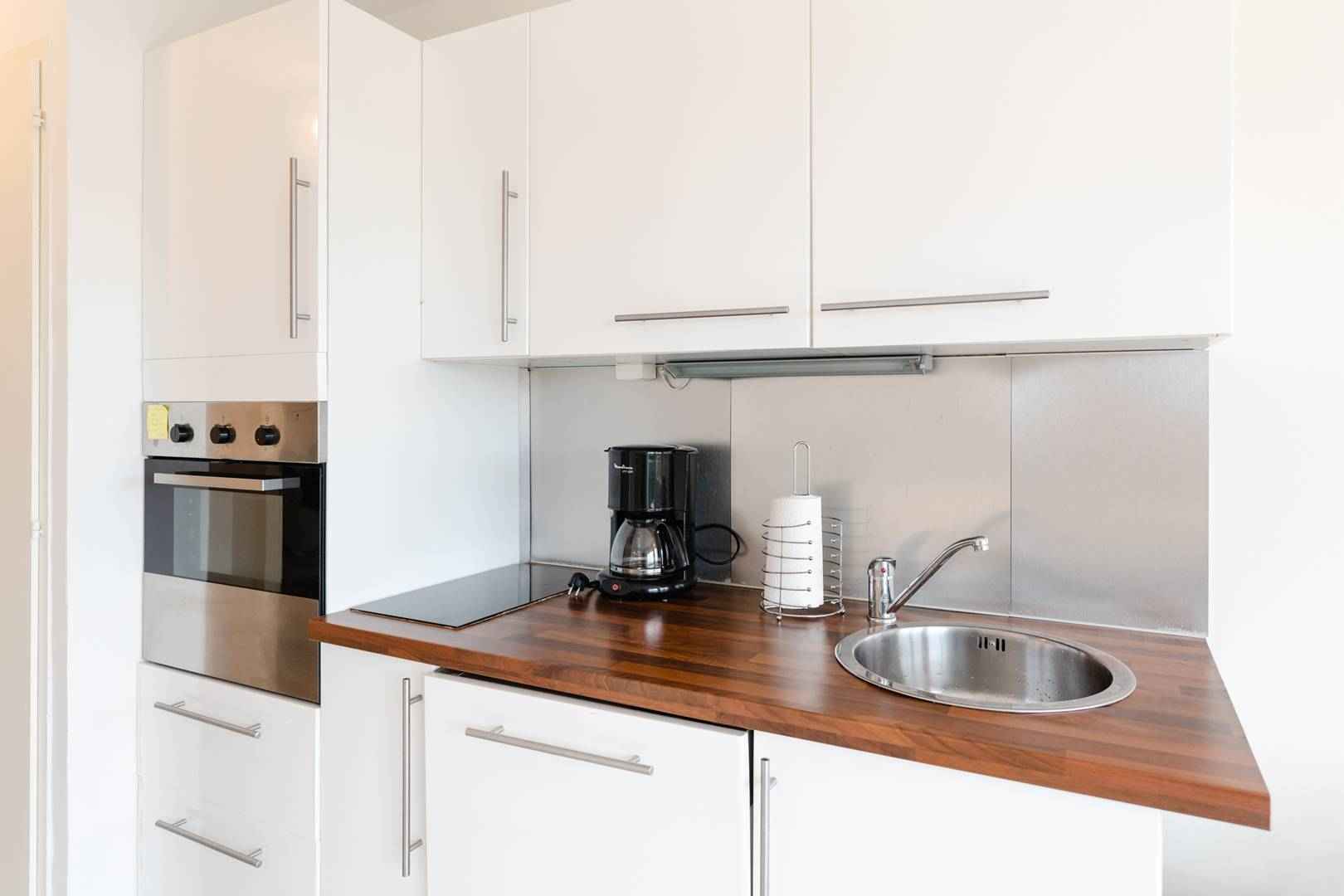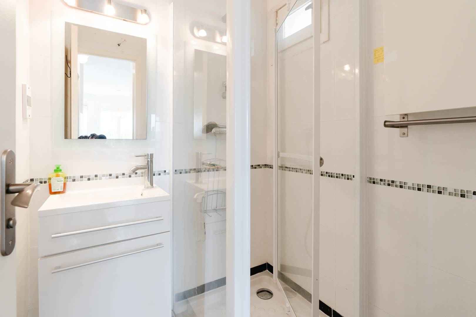 Une chambre séparée est équipée d'un lit double (160x190 cm). Une salle d'eau avec bac de douche, lavabo et commode complète l'appartement.