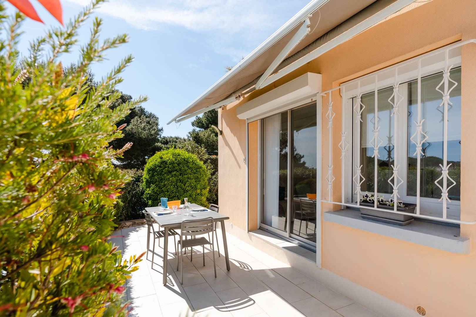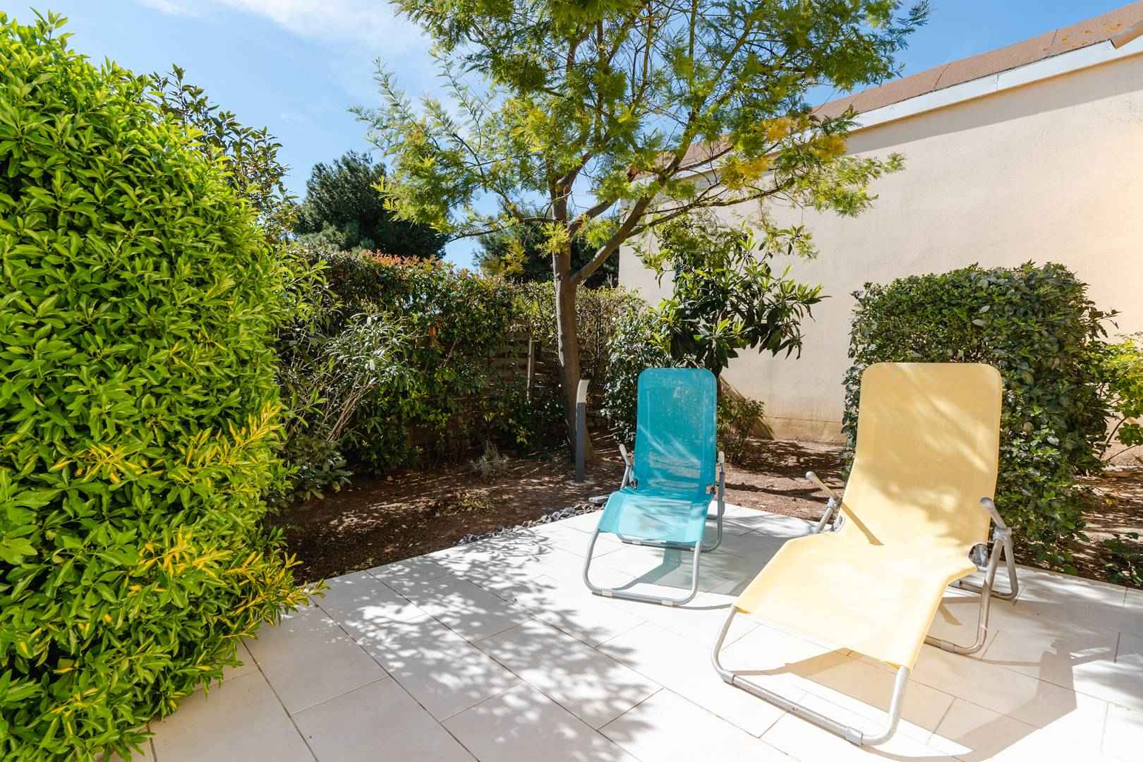 l'entrée se fait par la terrasse, avec plancha électrique (barbecue interdit par la copropriété) et salon de jardin (table, relax, bains de soleil).