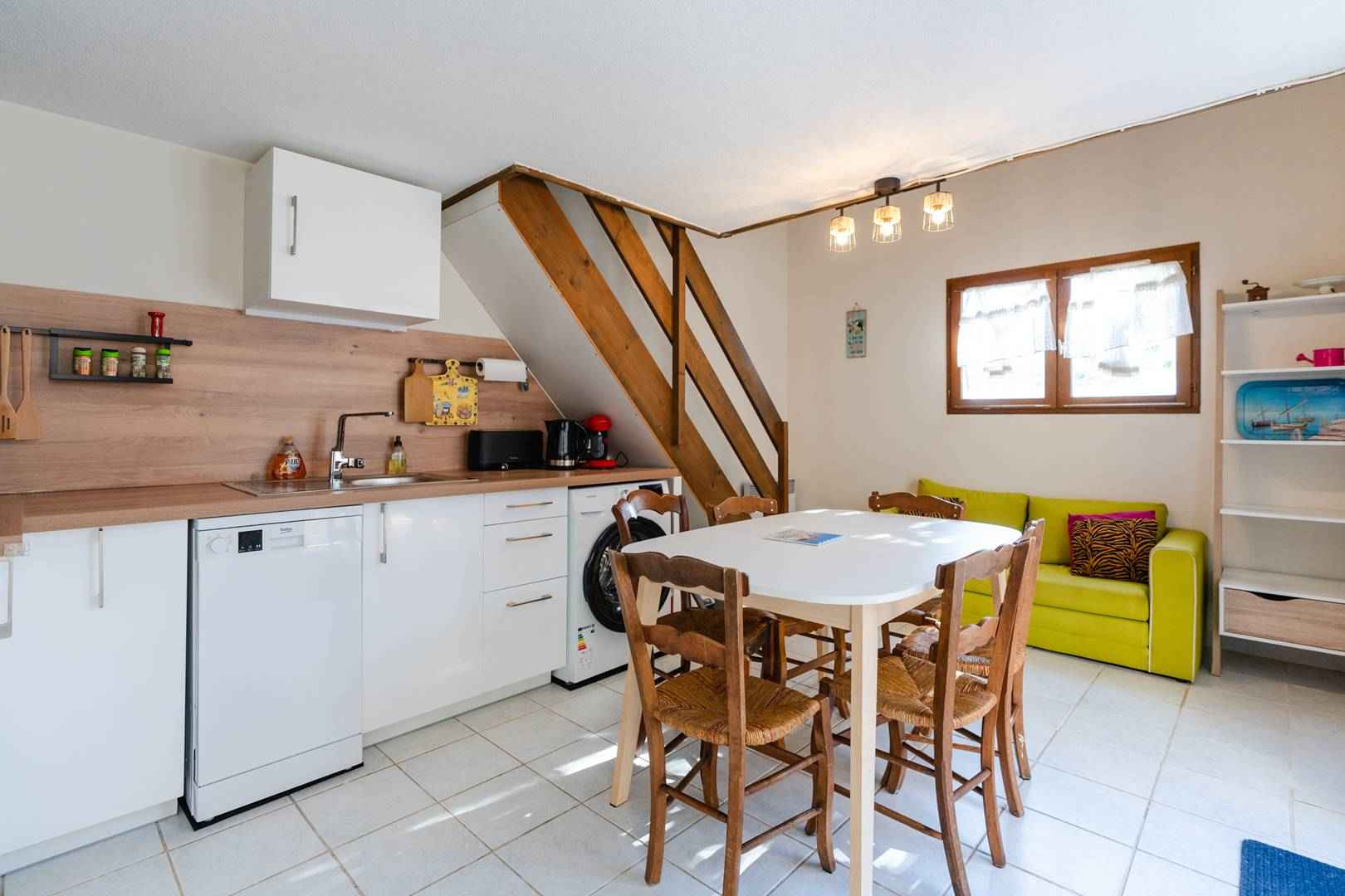 Au rez-de-chaussée, le séjour climatisé comprend un canapé et une télévision (chaînes françaises uniquement). La cuisine, ouverte sur le séjour, est équipée d'un réfrigérateur-congélateur, d'une plaque induction (3 feux) , d'un micro-ondes, d'une cafetière Tassimo, d'un grille-pain, d'une bouilloire, d'une hotte aspirante, d'un lave-linge et d'un lave-vaisselle.