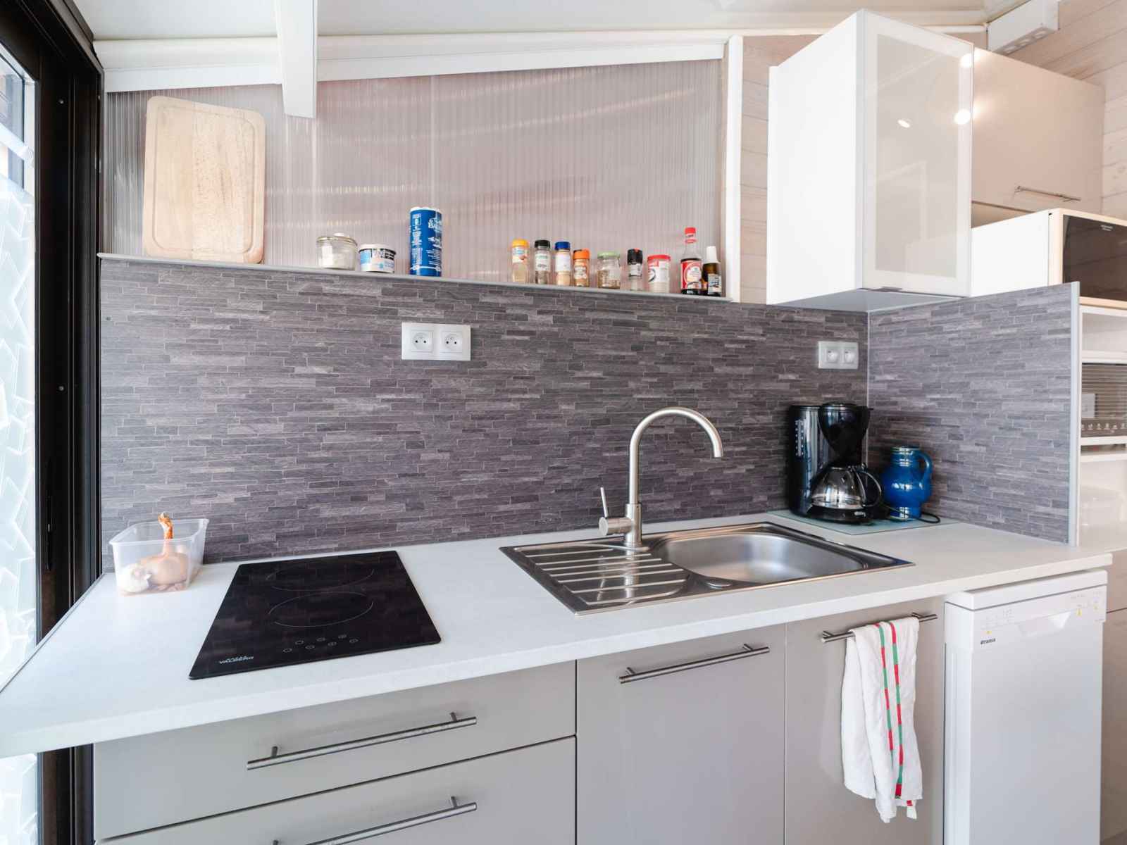 salon de jardin (table basse, banc, 2 fauteuils). La véranda est réaménagée en espace cuisine-repas (plaque de cuisson vitro-céramique 2 feux, cafetière classique, mini-four, micro-ondes, lave-vaisselle, réfrigérateur avec compartiment congélateur).