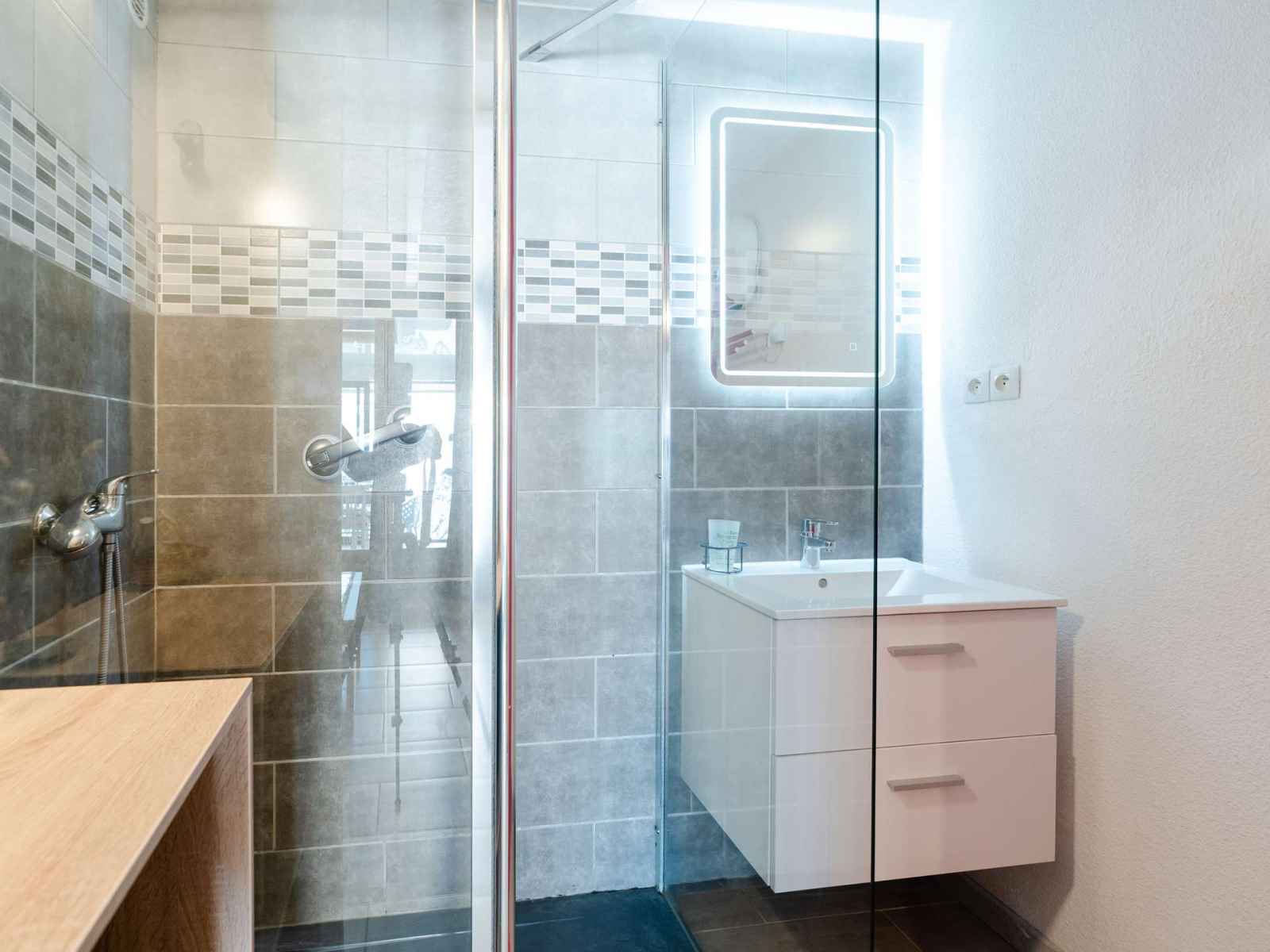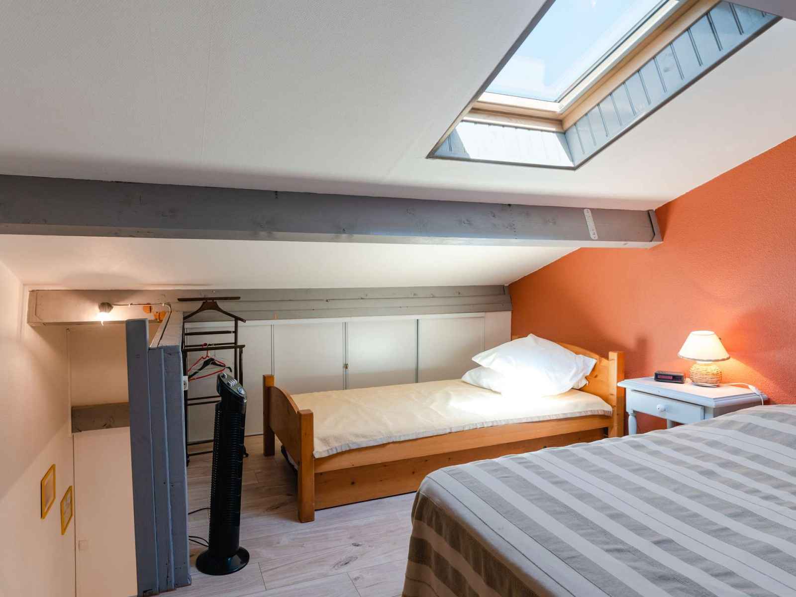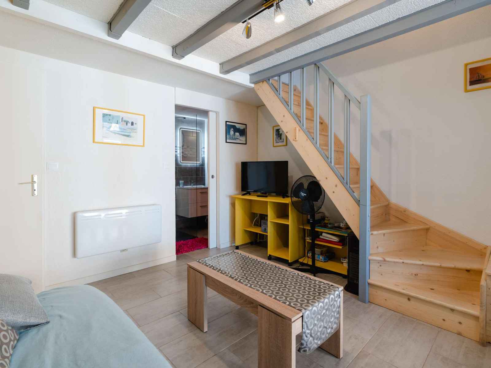 Le salon est équipé d'un canapé, table basse, TV (chaines françaises). Le WC est séparé (avec lave-linge), et la salle d'eau est entièrement rénovée (douche à l'italienne, vasque). La mezzanine à l'étage dispose d'un lit double (140x200), de lits simples gigognes (2x90x190), et de rangements.