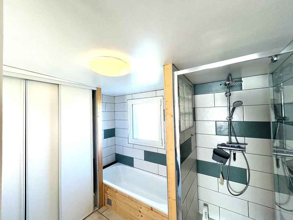 - une salle de bain avec douche et baignoire.