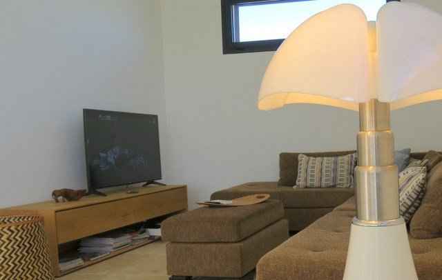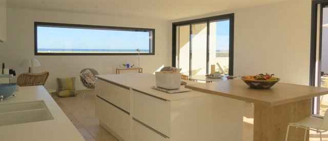 four, lave vaisselle, réfrigérateur congélateur, avec îlot central, Vous trouverez une annexe avec micro onde, second réfrigérateur et lave linge. Le salon avec canapé d'angle et télévision.