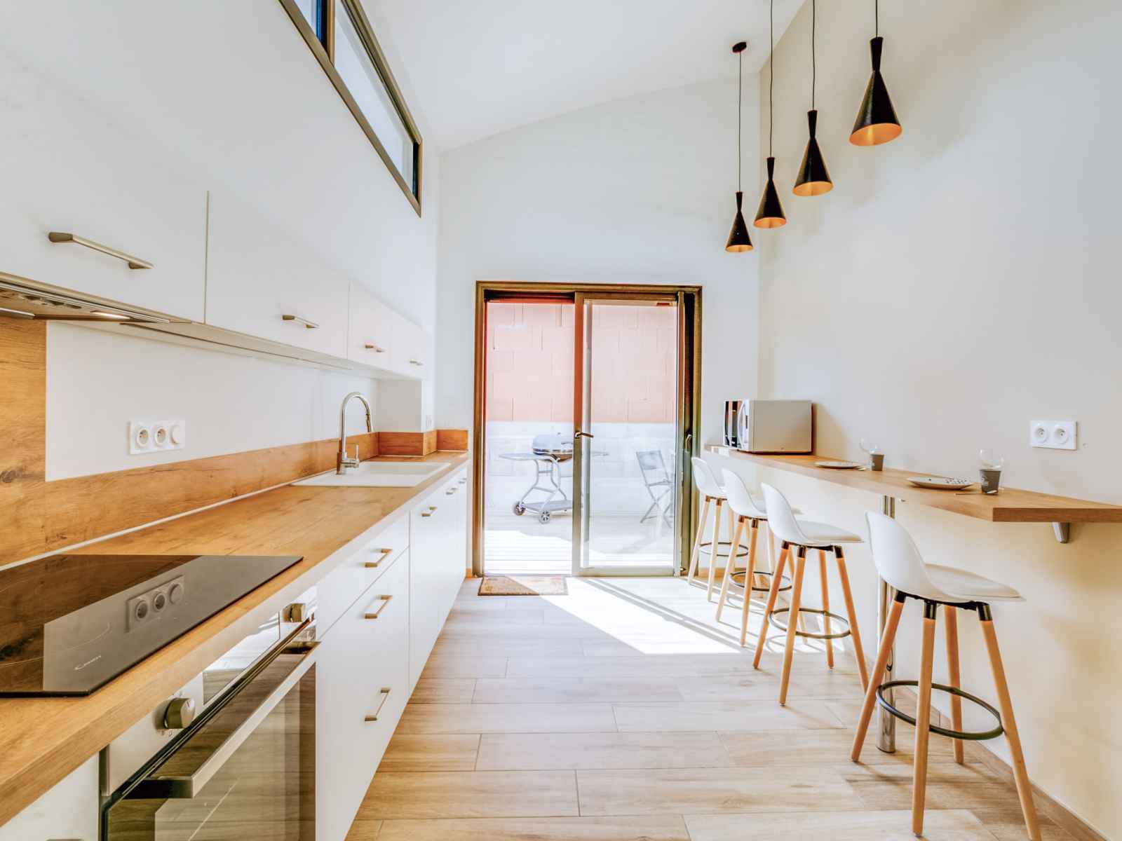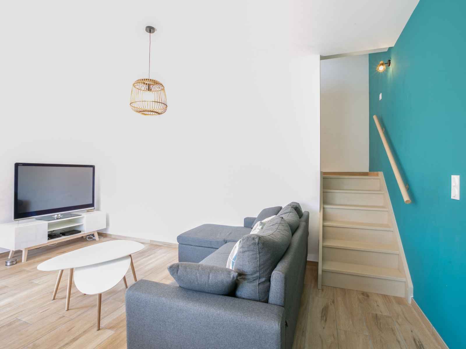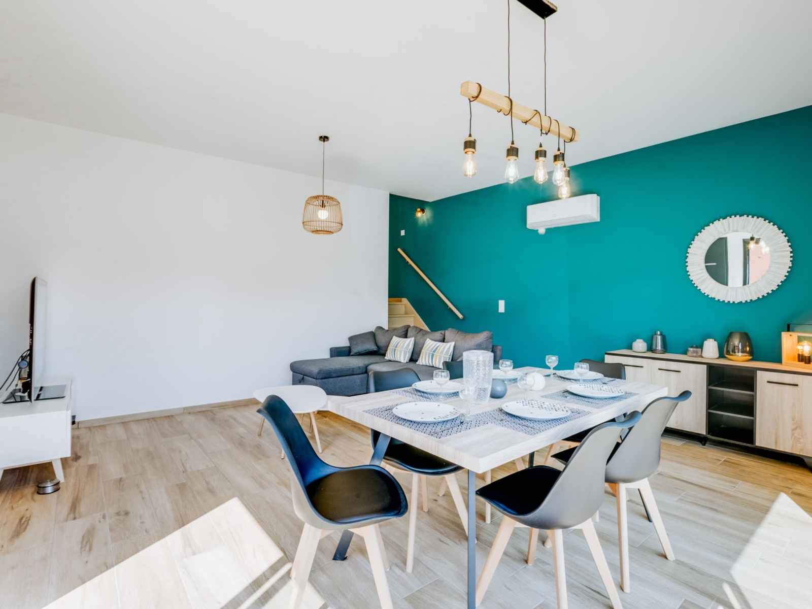 Maison 4 pièces 78 m2 sur 3 niveaux au 1er étage. aménagement confortable et moderne: séjour/salle à manger avec tv et chaînes de tv internationales (écran plat), air-conditionné et volet roulant électrique. sortie sur la terrasse. À l'étage supérieur: cuisine (four, lave-vaisselle, 1 plaques à induction, 3 feux, grille-pain,
