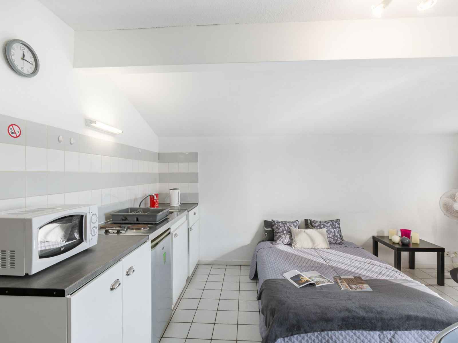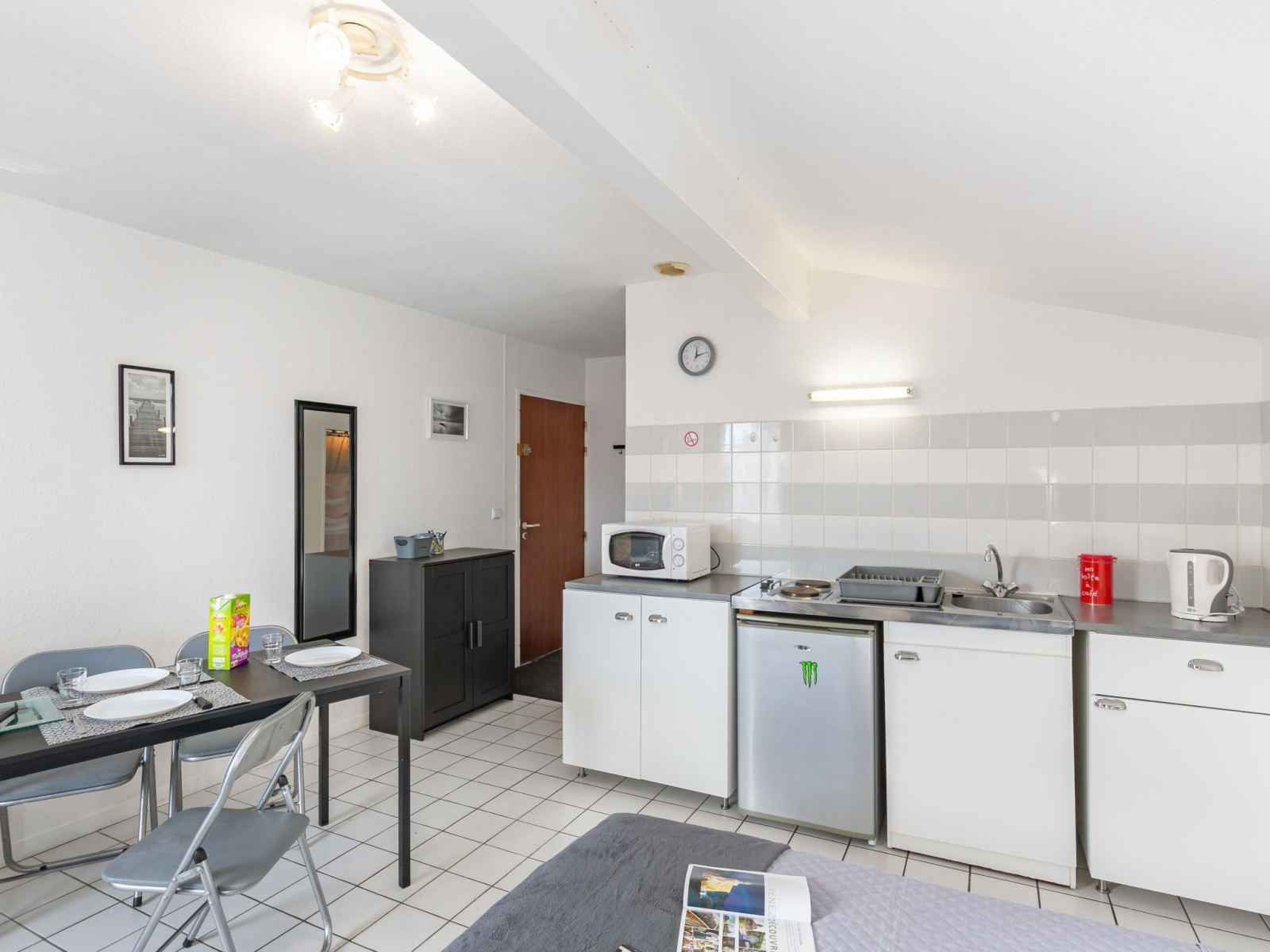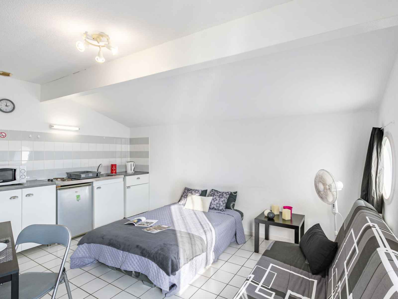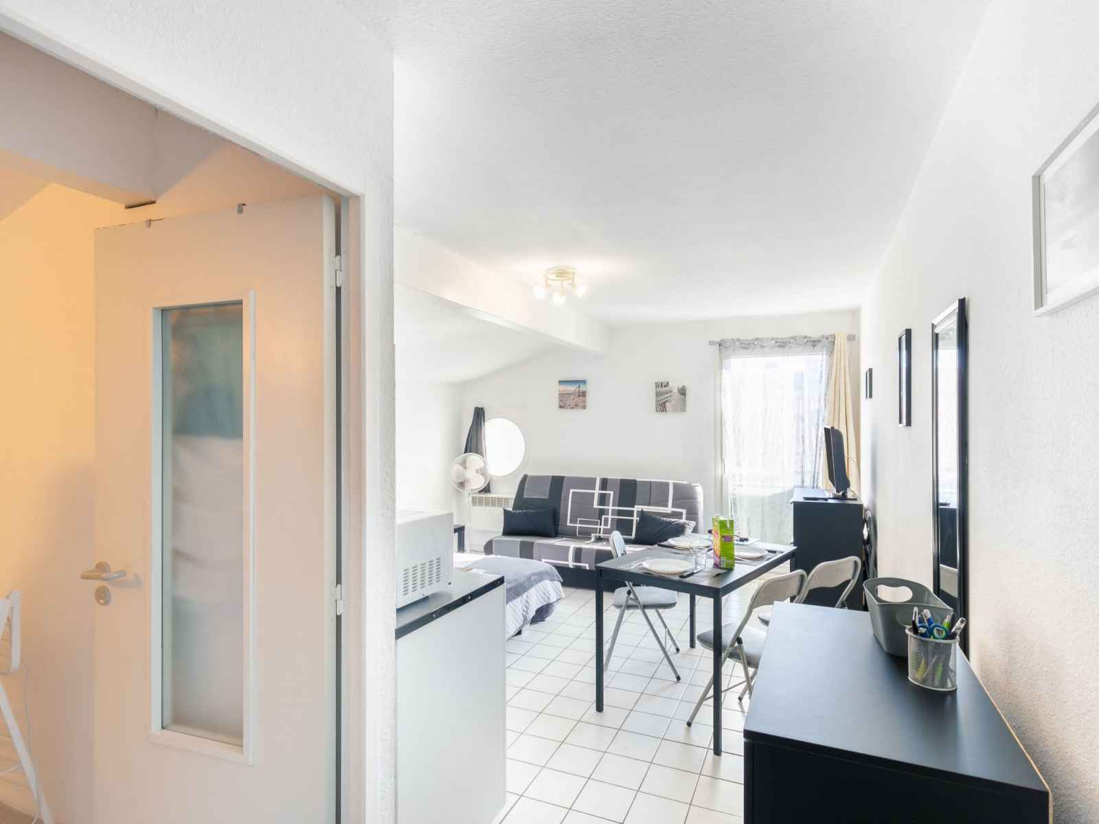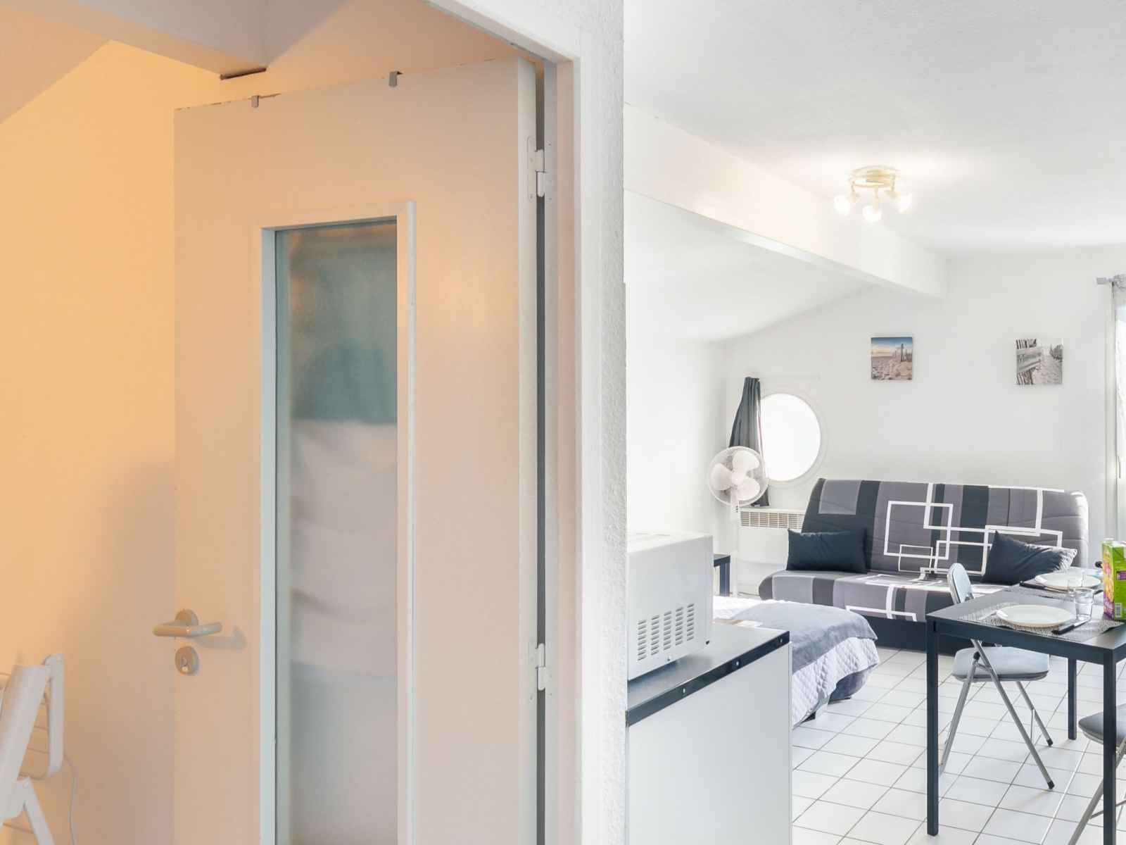 Studio 24 m2 au 1er étage. aménagement fonctionnel: séjour/salle à manger avec 2 divans-lits (130 cm, longueur 190 cm), coin repas et tv (écran plat), radiateur électrique. coin cuisine (2 plaques de cuisson, grille-pain, bouilloire électrique, micro-ondes, cafetière électrique). douche/wc. a disposition: internet (connexion wifi, en