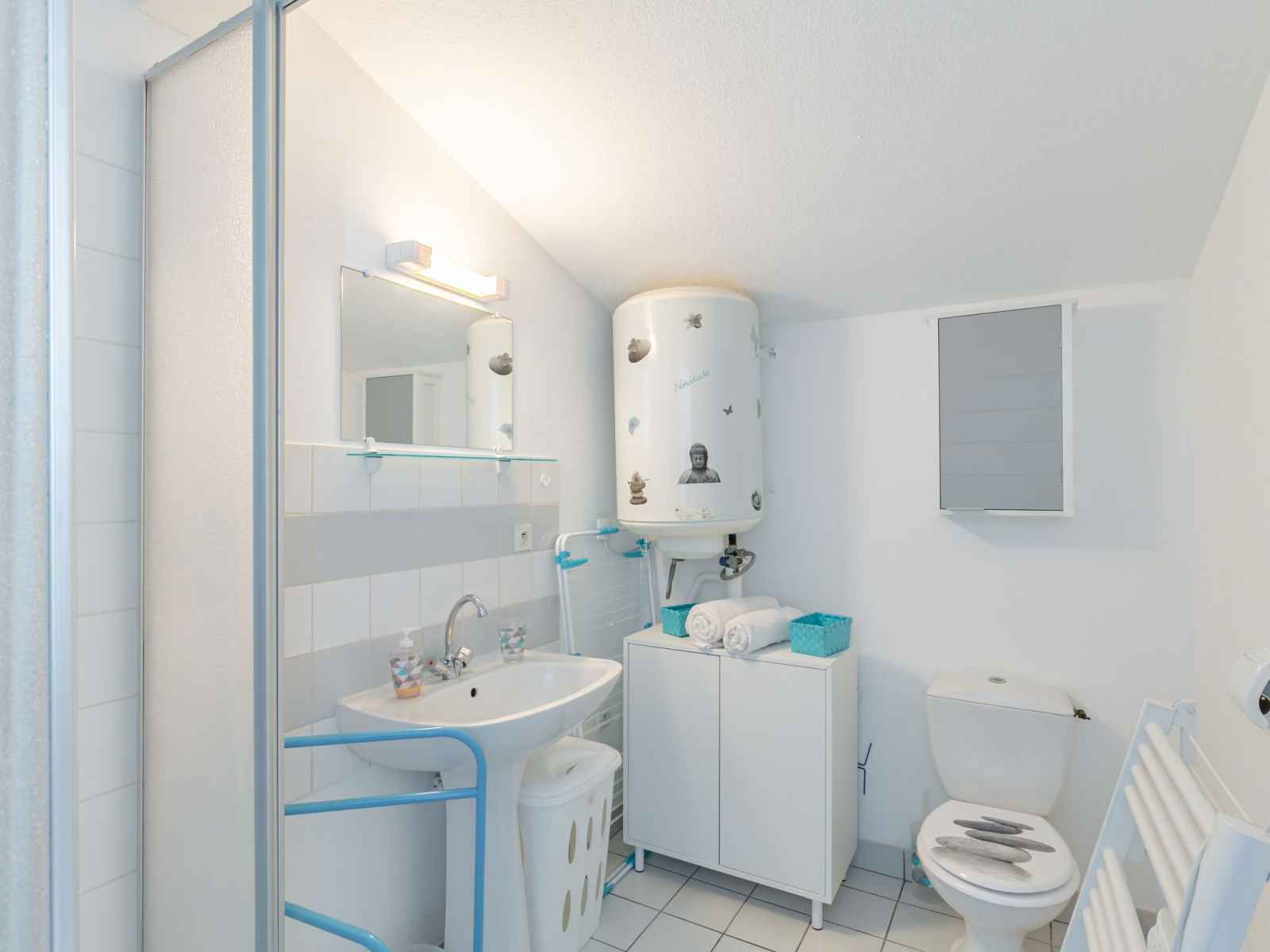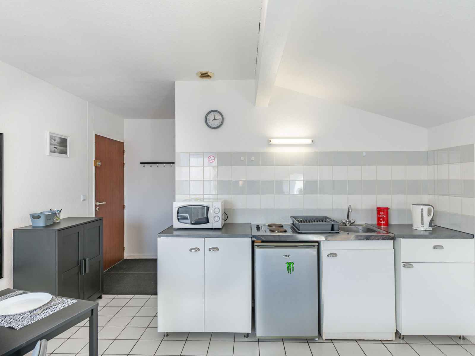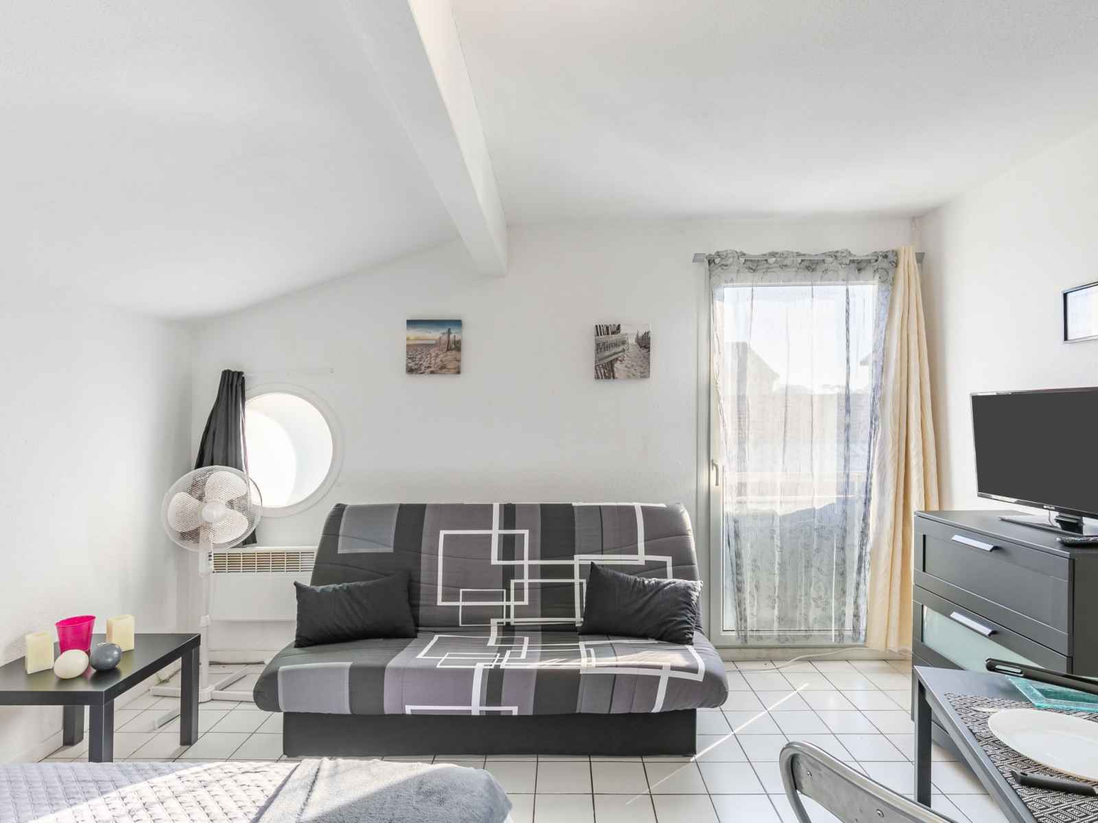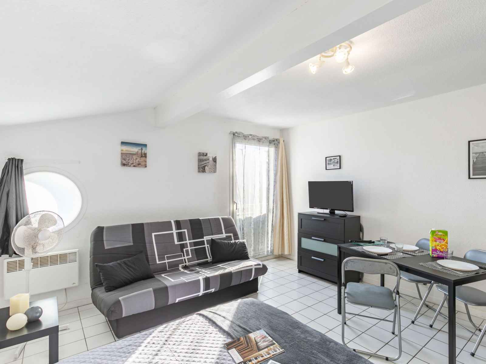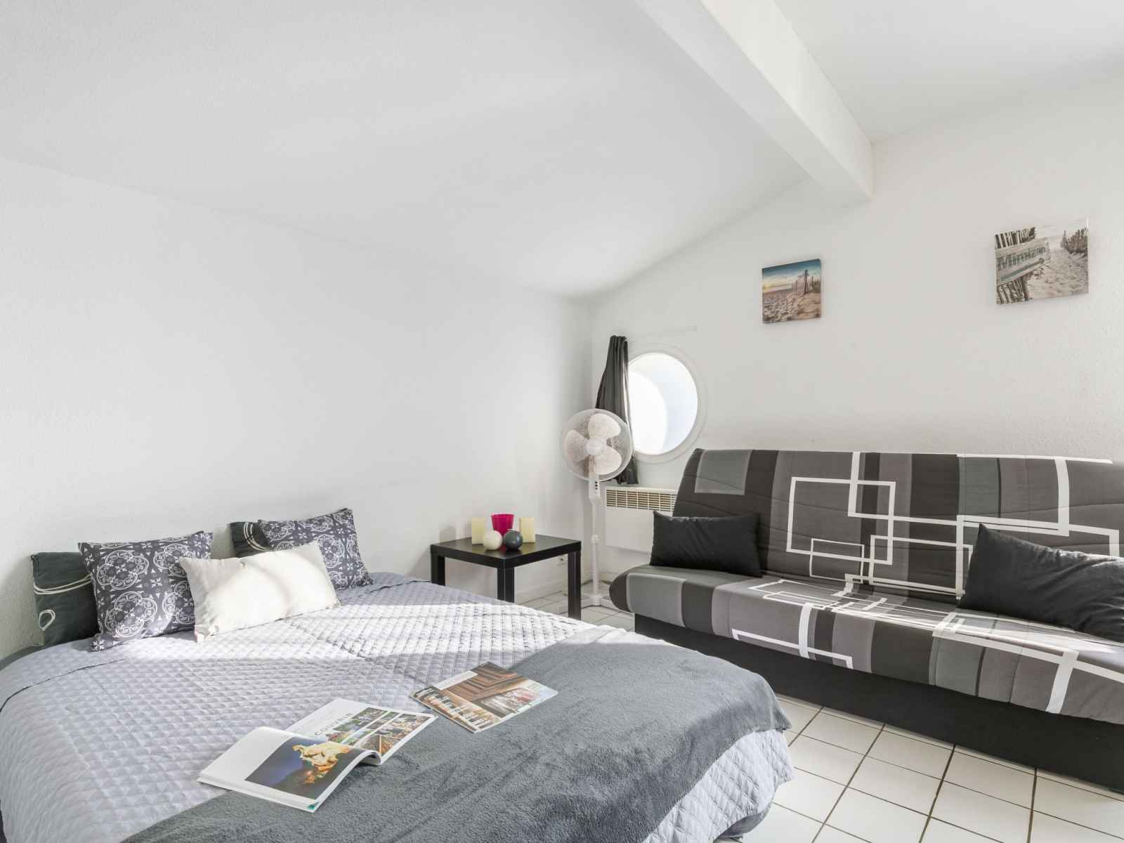 Studio 24 m2 au 1er étage. aménagement fonctionnel: séjour/salle à manger avec 2 divans-lits (130 cm, longueur 190 cm), coin repas et tv (écran plat), radiateur électrique. coin cuisine (2 plaques de cuisson, grille-pain, bouilloire électrique, micro-ondes, cafetière électrique). douche/wc. a disposition: internet (connexion wifi, en