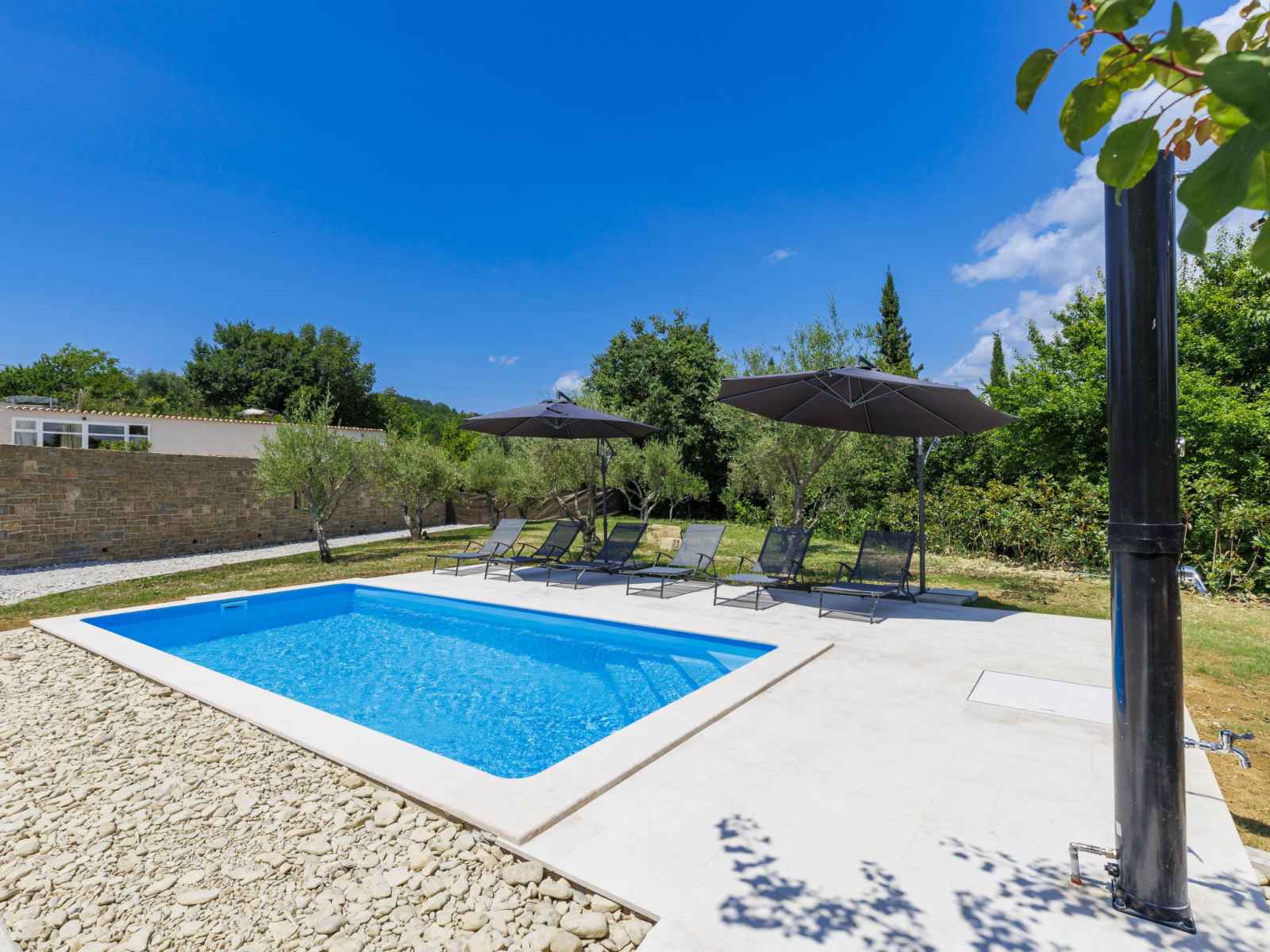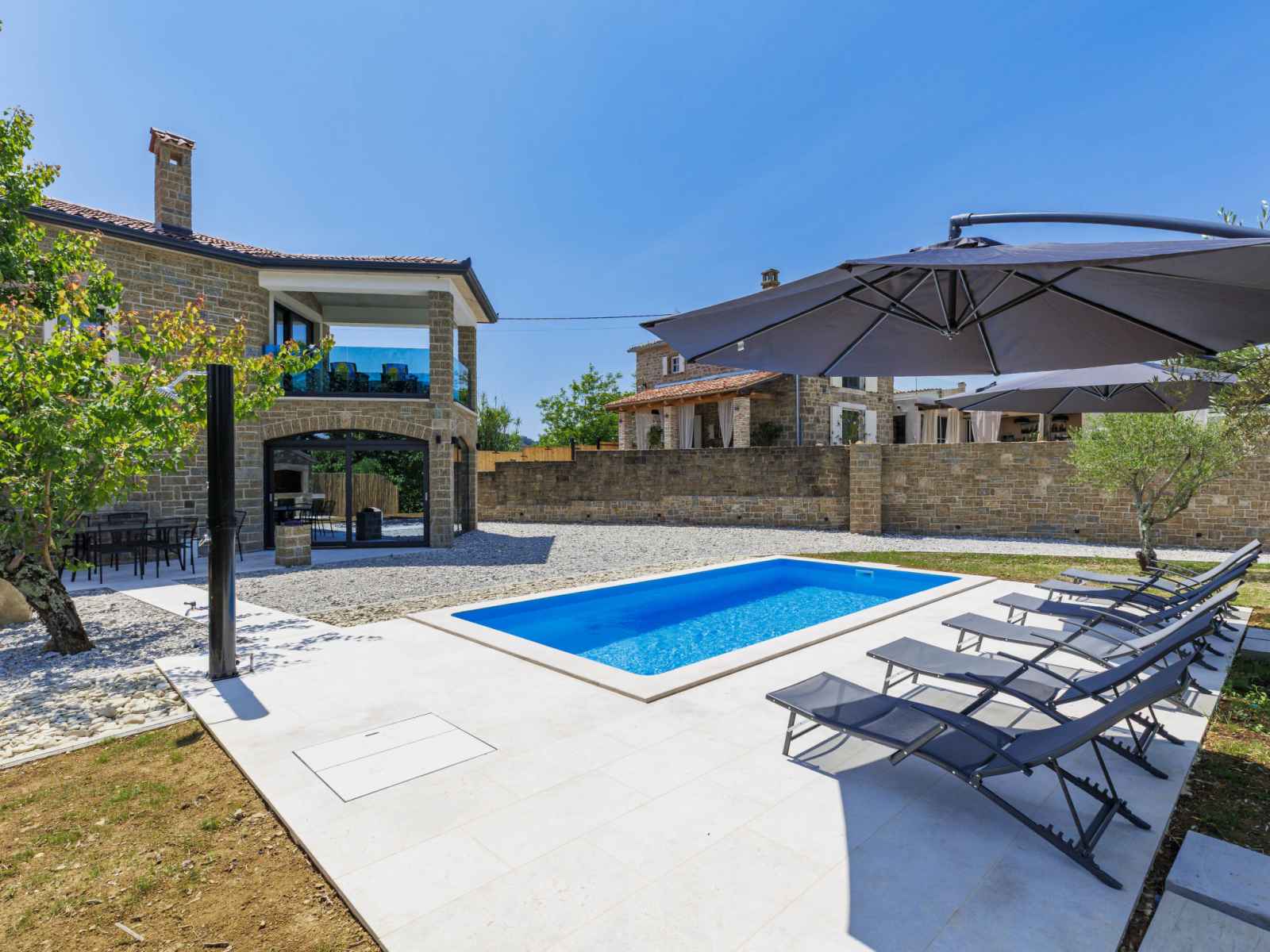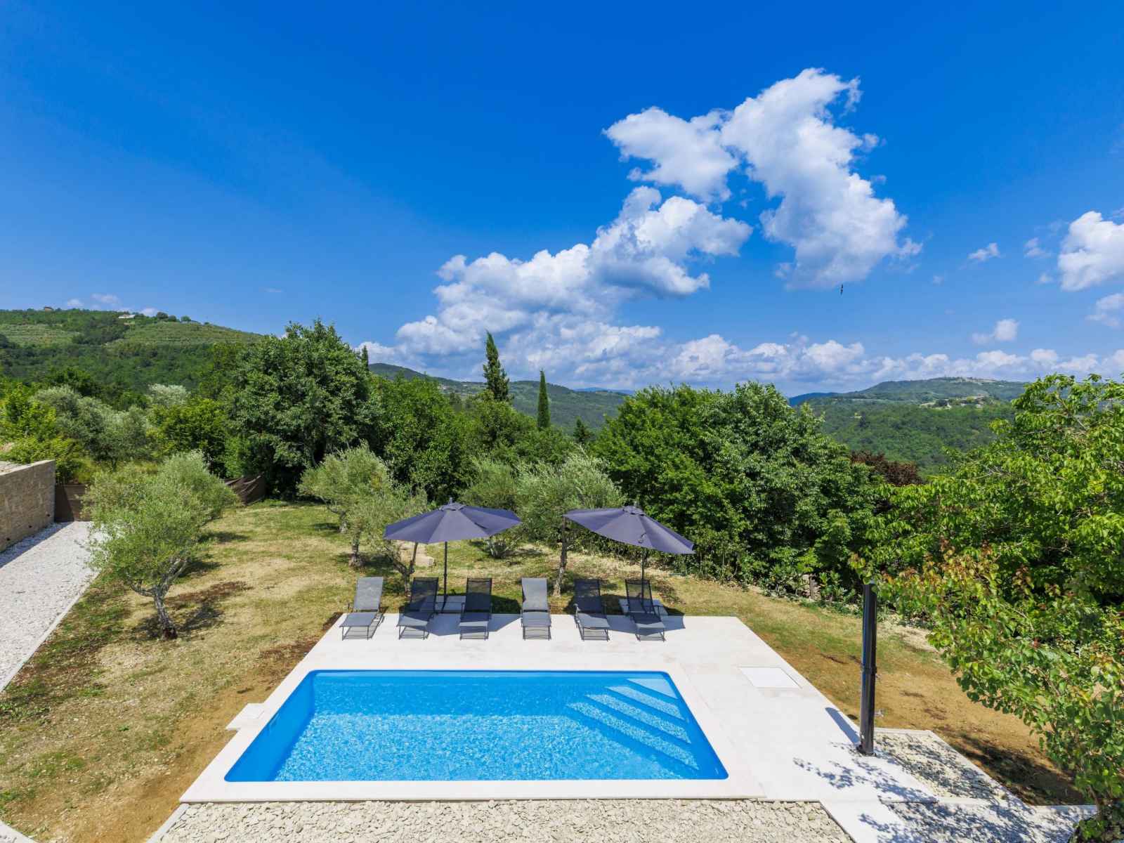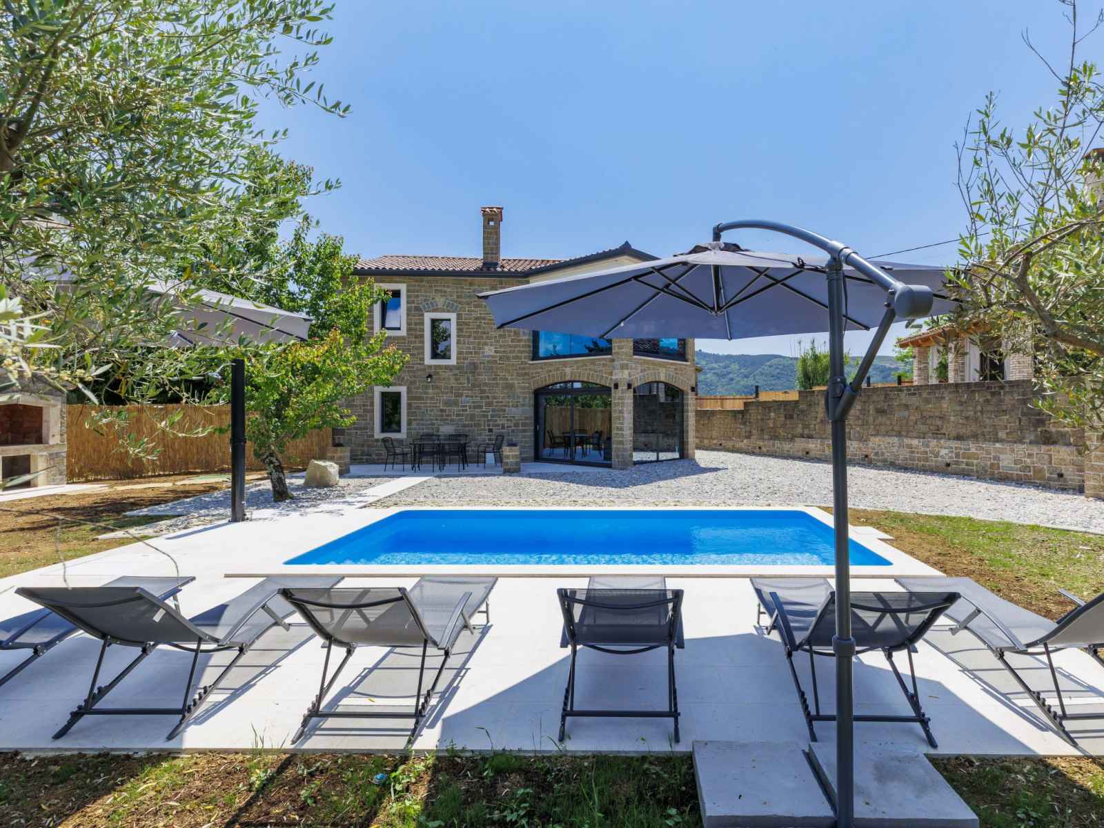 Belle villa luxueuse "solaria", de 2 étages en 2024. dans le hameau de krti, à 8 km du centre de motovun, à 15 km du centre de buzet, situation tranquille, à 30 km de la mer. a usage privé: terrain 450 m2 (clôturé), piscine rectangulaire (3 x 6 m, profondeur 140 cm, disponibilité saisonnière: 15.avr. - 01.nov.) avec marches intérieures.