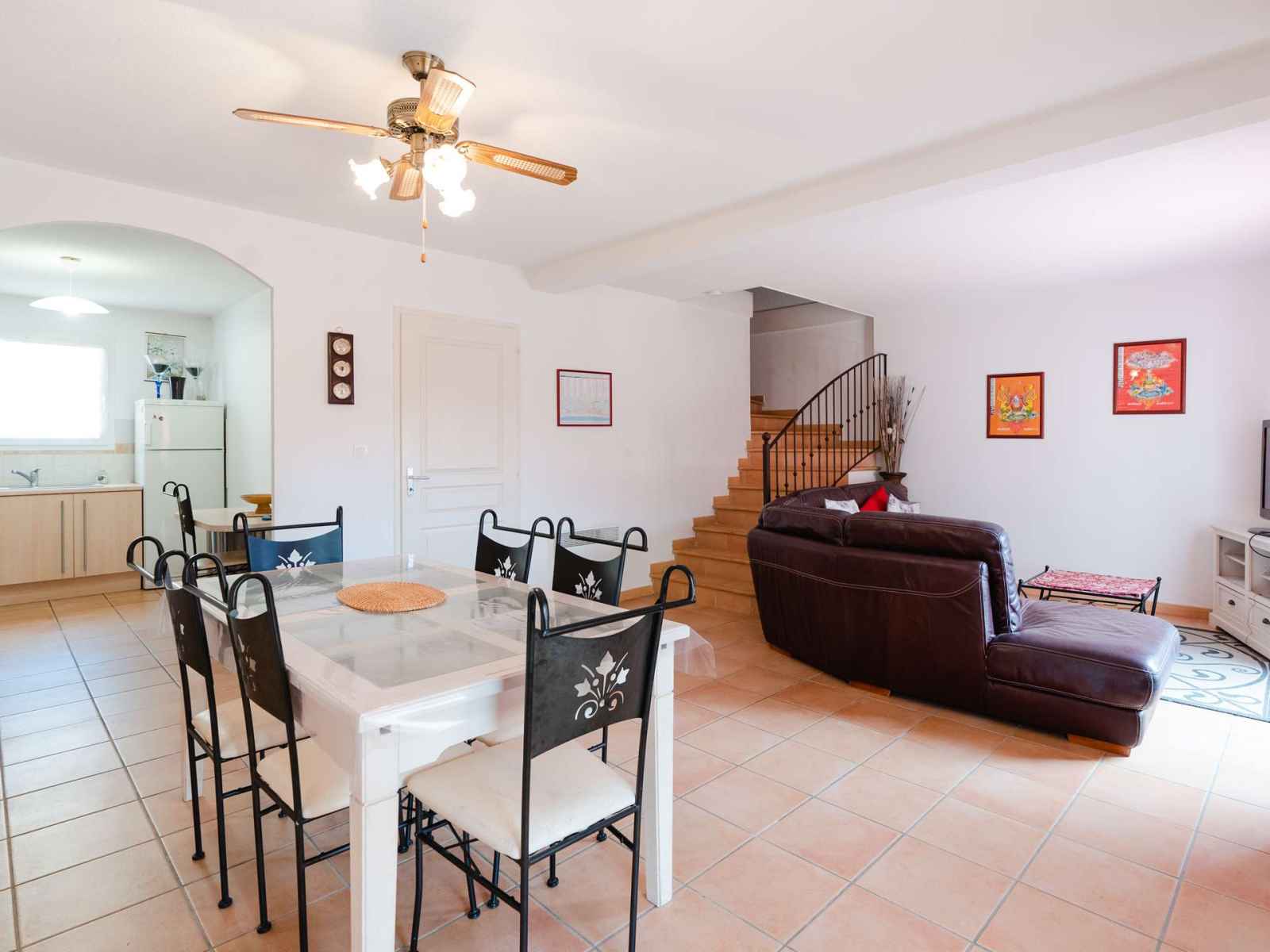 lecteur DVD, chaine Hifi, espace repas, 2 portes fenêtres donnant sur la terrasse et le jardin, cuisine séparée équipée (4 plaques vitrocéramiques, hotte, four, micro-ondes, lave vaisselle, réfrigérateur et compartiment congélateur), WC séparés.