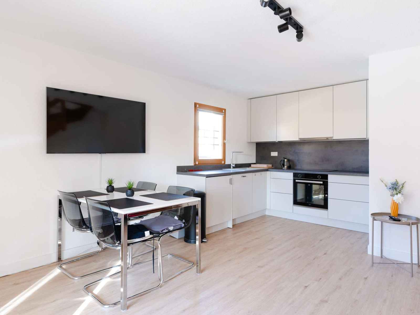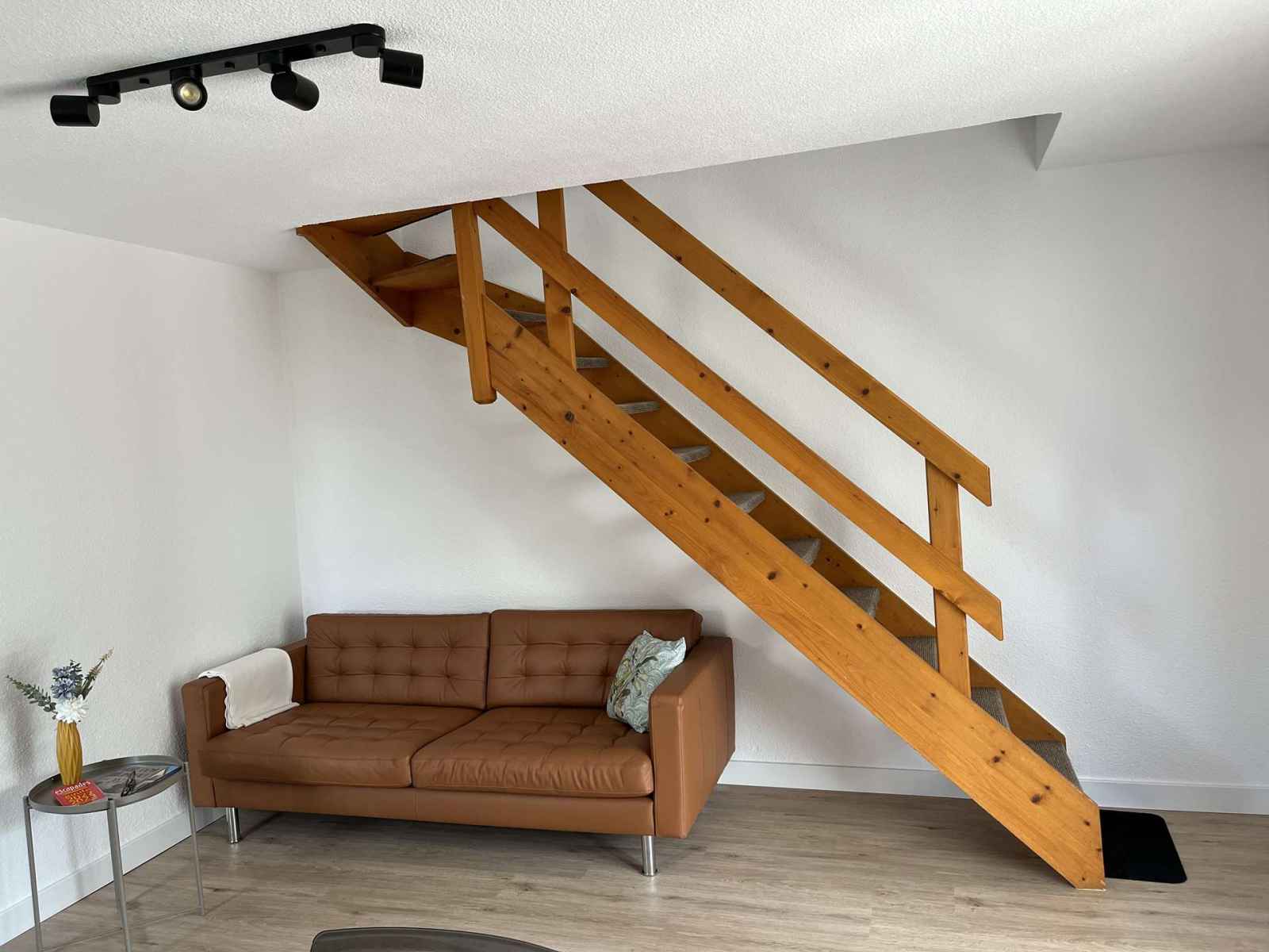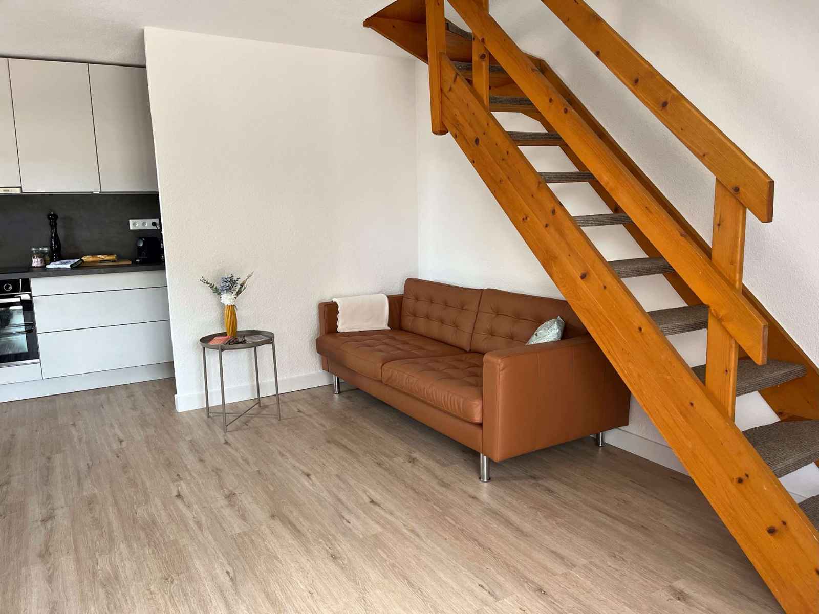rez-de-chaussée : grande pièce avec séjour (canapé, smart tv(chaines allemandes seulement), table avec 4 chaises) et cuisine bien