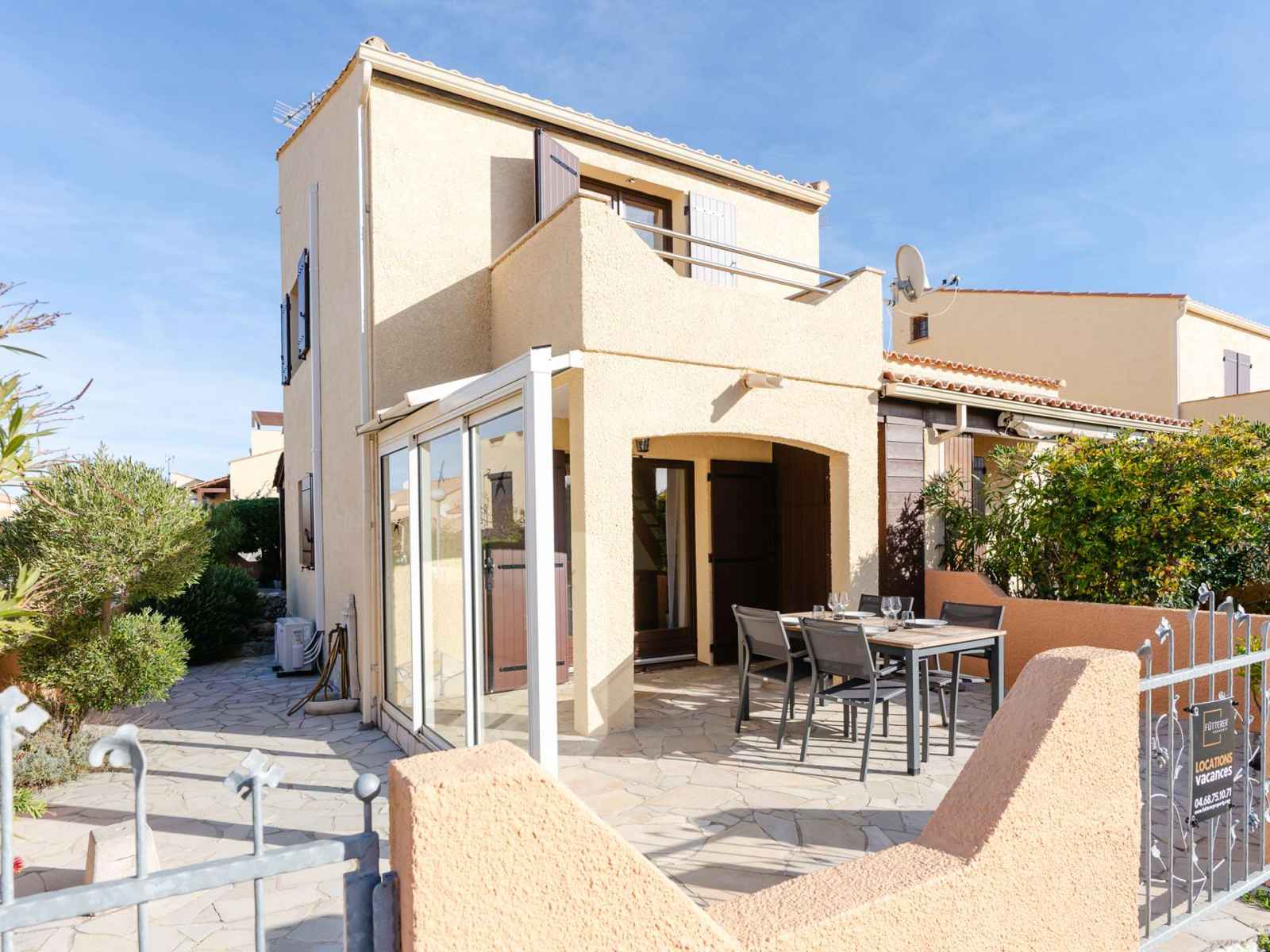 • Equipements : Aspirateur, Bouilloire, Cafetière à dosettes, Chaises longues, Chauffage électrique, Climatisation dans les chambres, Congélateur, Etendoir, Four, Grille-pain, Hotte aspirante, Lave linge, Lave Vaisselle, Parasol, piscine collective, Plaque induction (3 feux), Réfrigérateur, Salon de jardin, Sèche-cheveux, sèche-serviettes, Télévision, Vaisselle pour 4 personnes