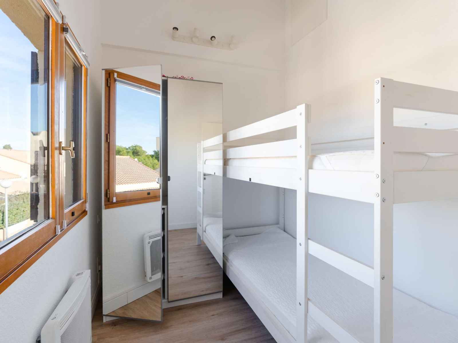 A l'étage: 1 chambre climatisée avec lit double (2x90x200) et balcon, 1 chambre climatisée avec lits superposés (90x200), 1 salle d'eau (douche, lavabo et WC, sèche serviettes).