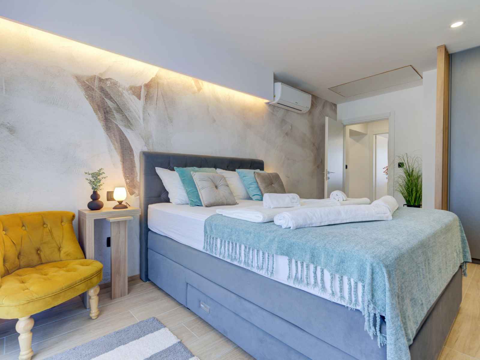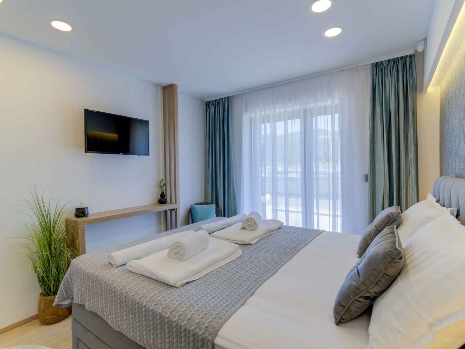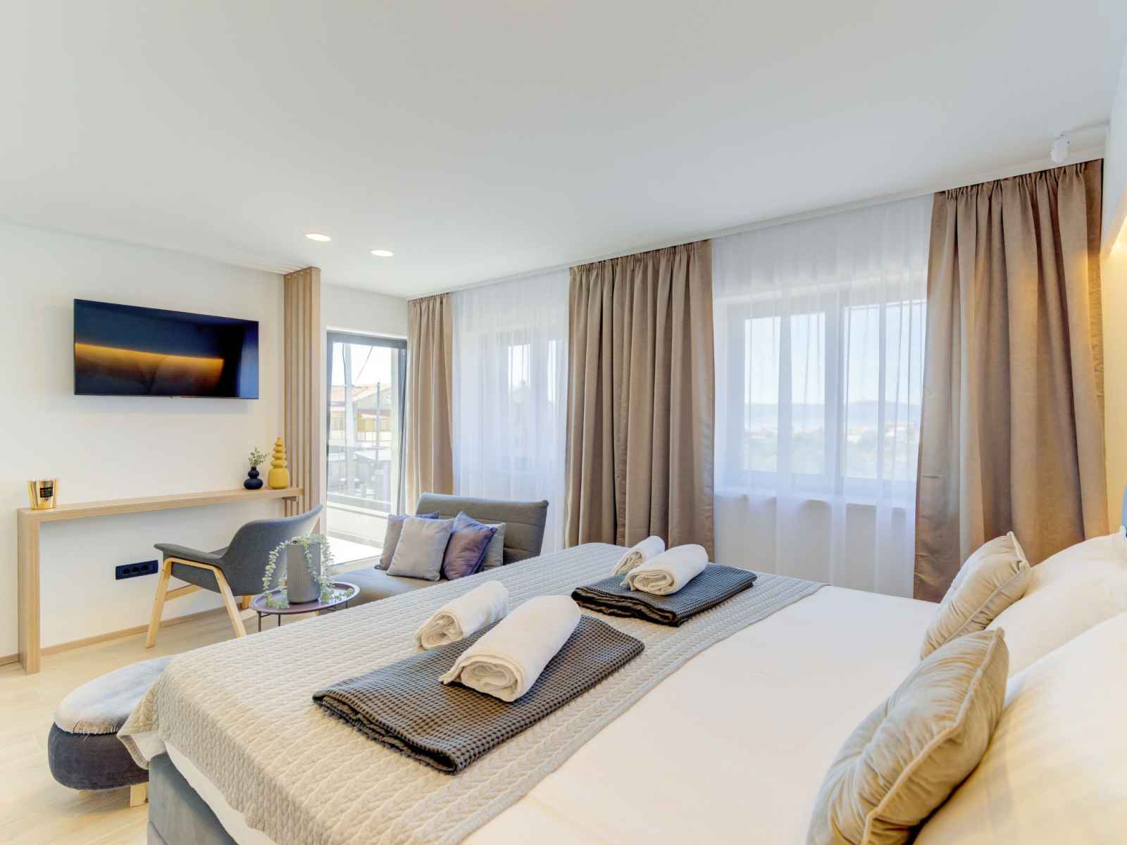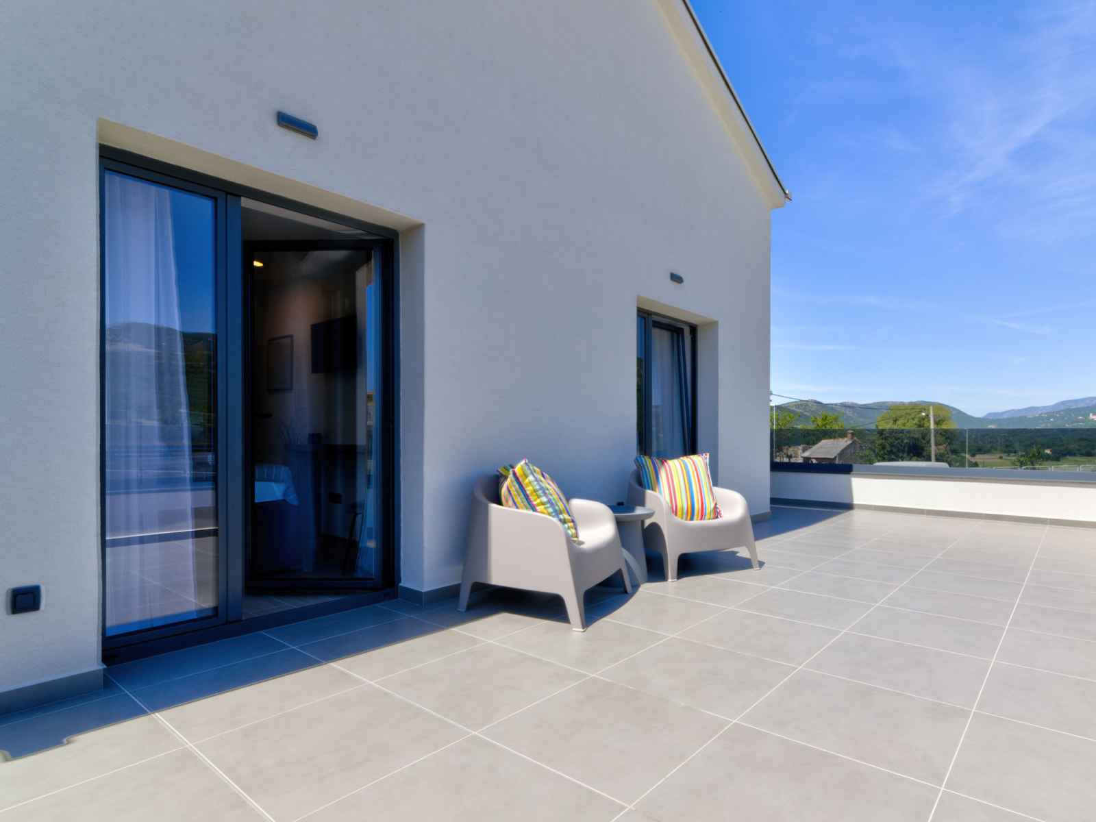 plaques vitrocéramiques, grille-pain, bouilloire électrique, micro-ondes, congélateur, cafetière électrique). WC séparé. À l'étage supérieur: 1 chambre avec 1 divan-lit (90 cm, longueur 200 cm), 1 grand-lit (180 cm, longueur 200 cm), douche/WC et TV (satellite). Sortie sur le balcon. 2 chambres, chaque chambre avec: 1 grand-lit (160 cm, longueur 200 cm), douche/WC et TV (satellite). Sortie sur le balcon. Chauffage à air chaud. Balcon 30 m2, petit balcon terrasse 30 m2 partiellement couverte. Meubles de terrasse, mobilier de balcon, barbecue électrique (portable), chaises longues (6). Vue sur la piscine. A disposition: coffre-fort, fer à repasser, chaise haute pour enfant, lit bébé (en sus). Internet (Connexion WIFI, gratuit). Veuillez noter: maison non-fumeur. Maximum 2 animaux/ chiens autorisés. Détecteur de fumée, extincteur.